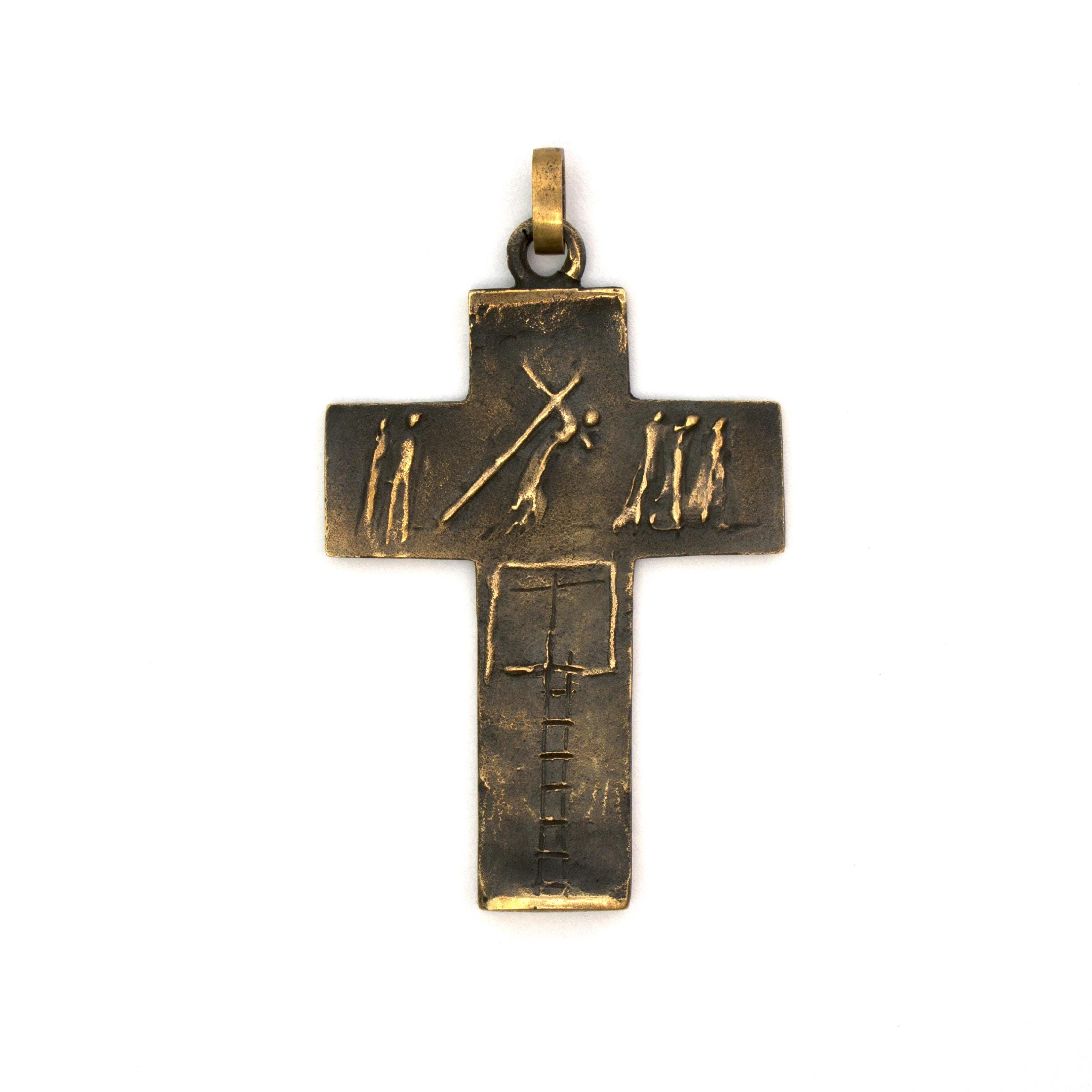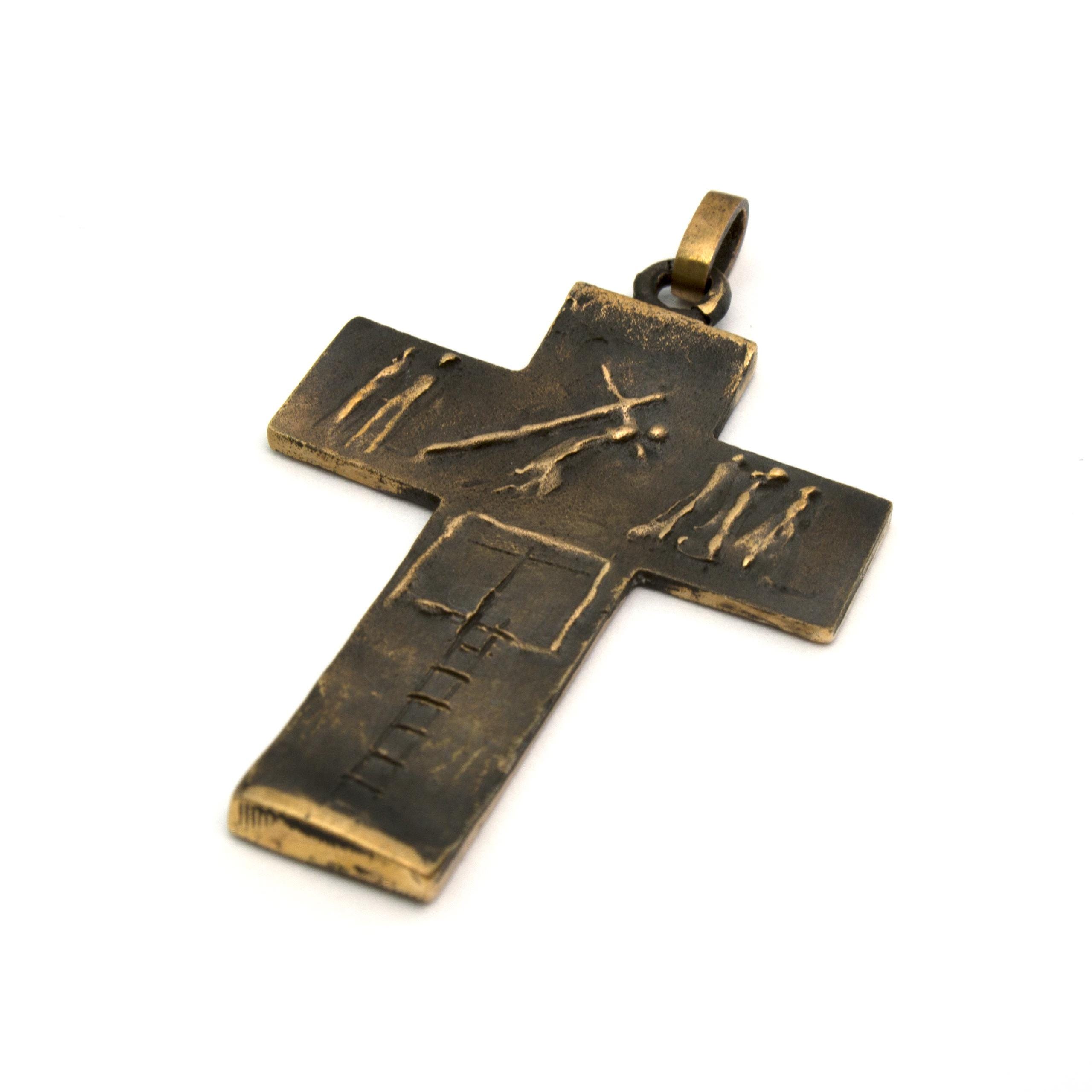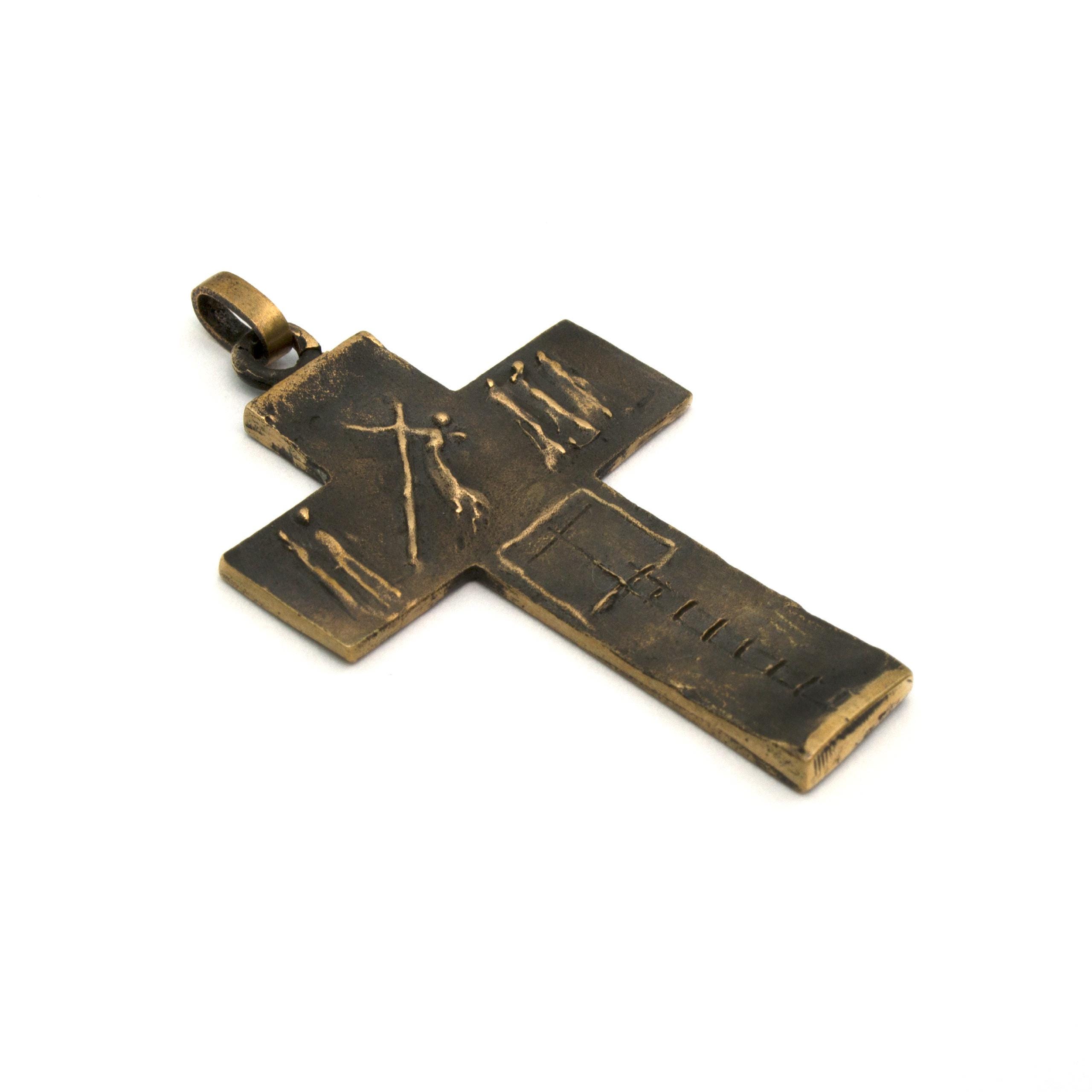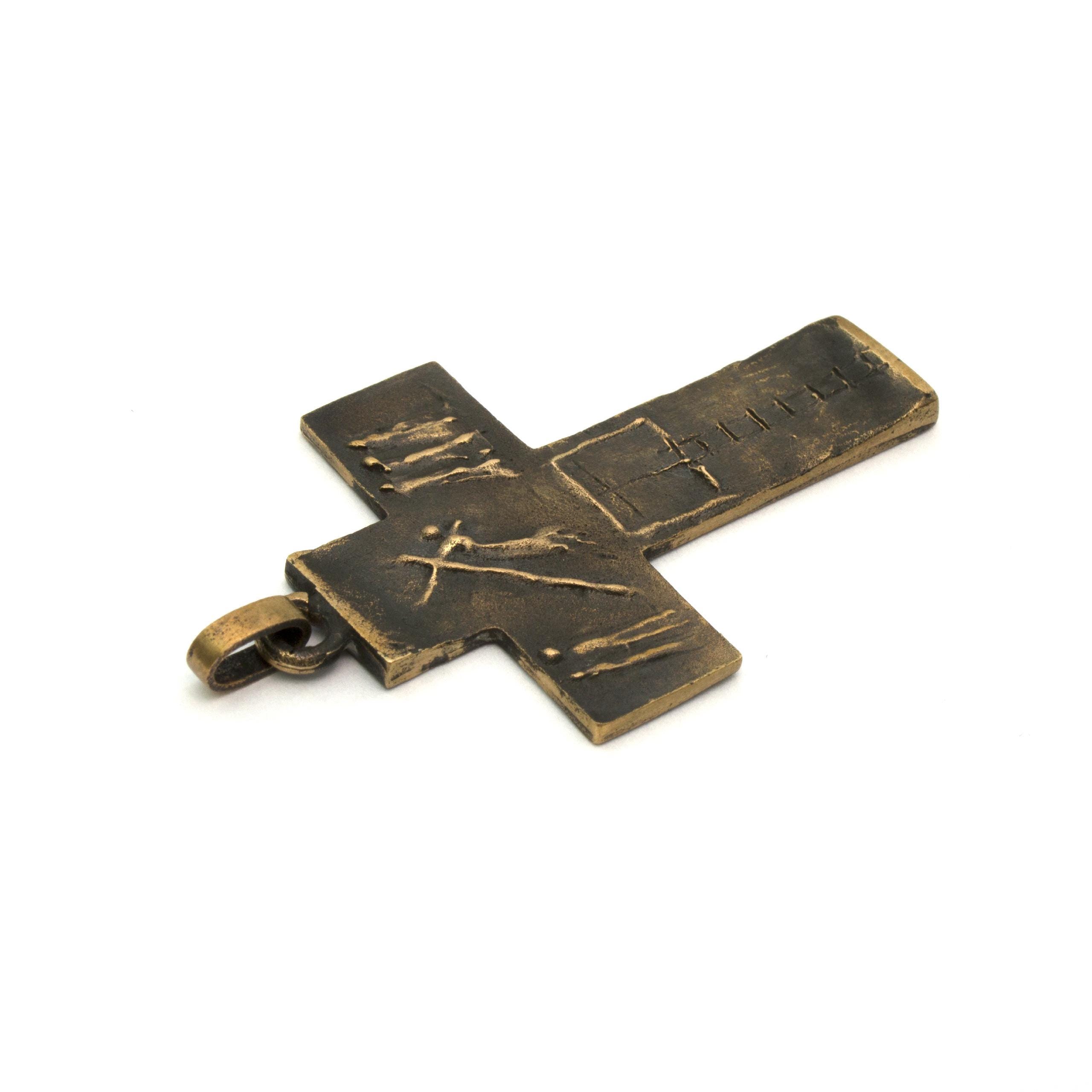 Autorský bronzový přívěsek Křížek plochý #4 od české sochařky a šperkařky Vojtěšky Vlčkové (1948–2023). Šperk byl vytvořen ručně tradiční technikou lití na ztracený vosk, která dodává bronzu osobitý charakter a jemný detail. Výjimečné dílo s trvalou estetickou i sběratelskou hodnotou.