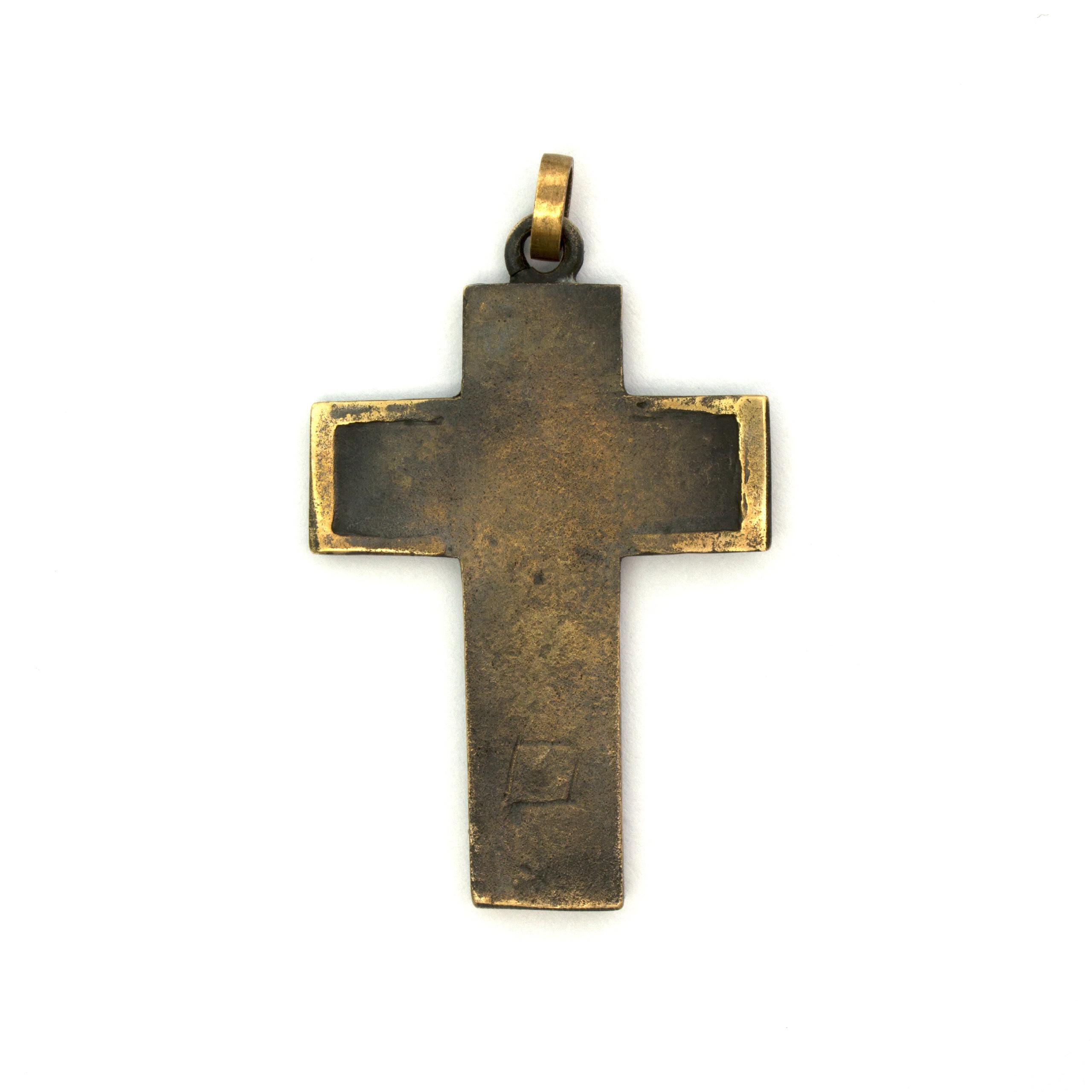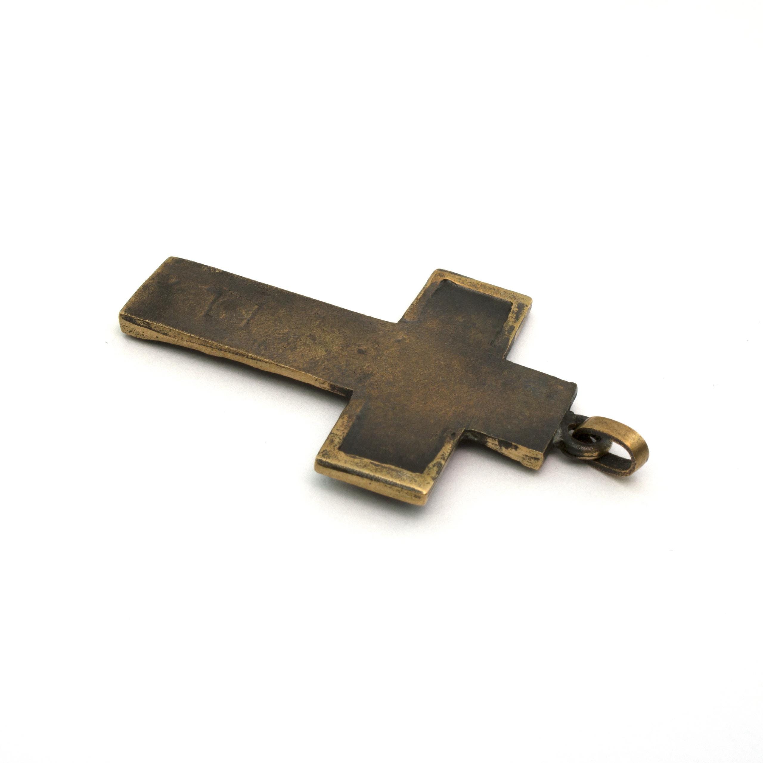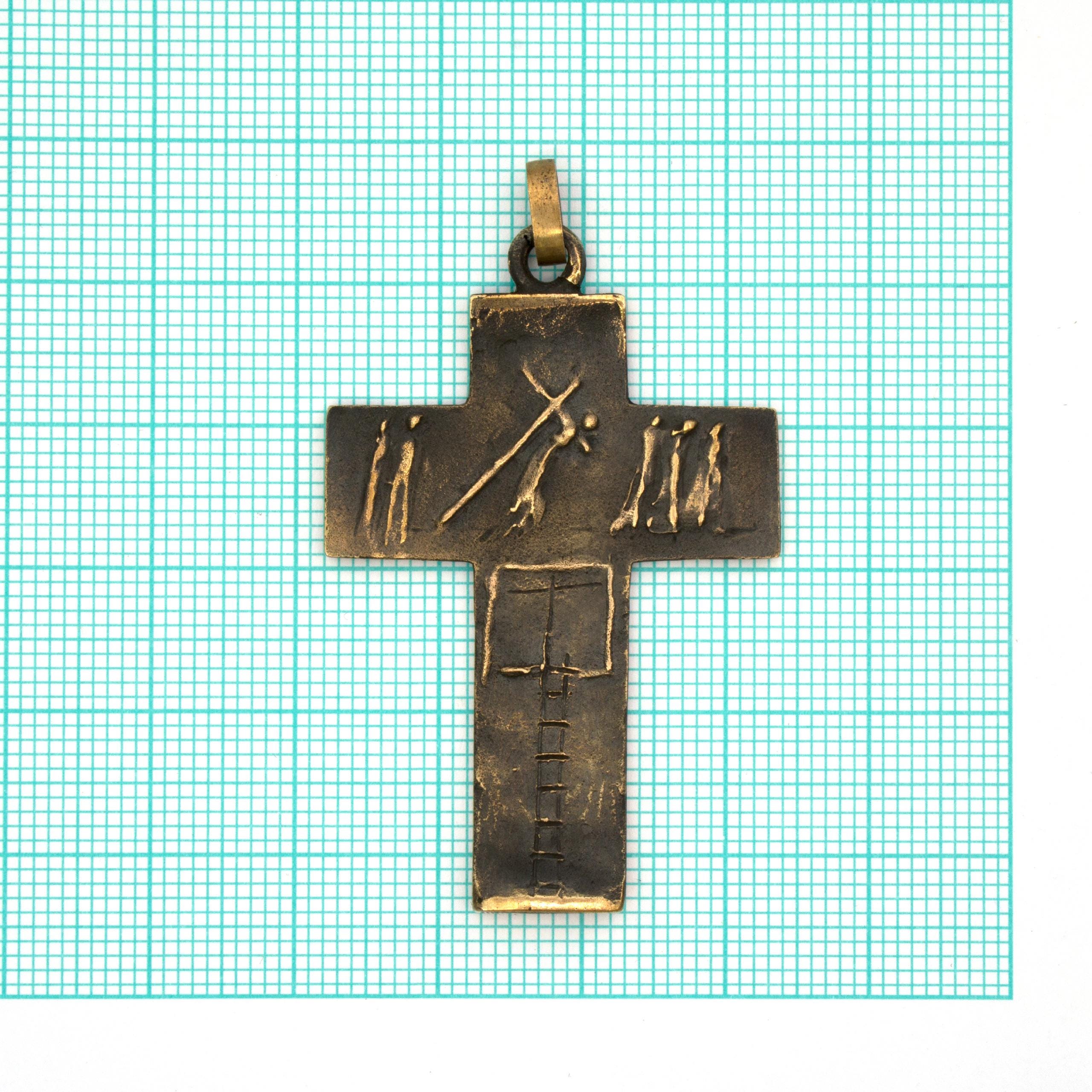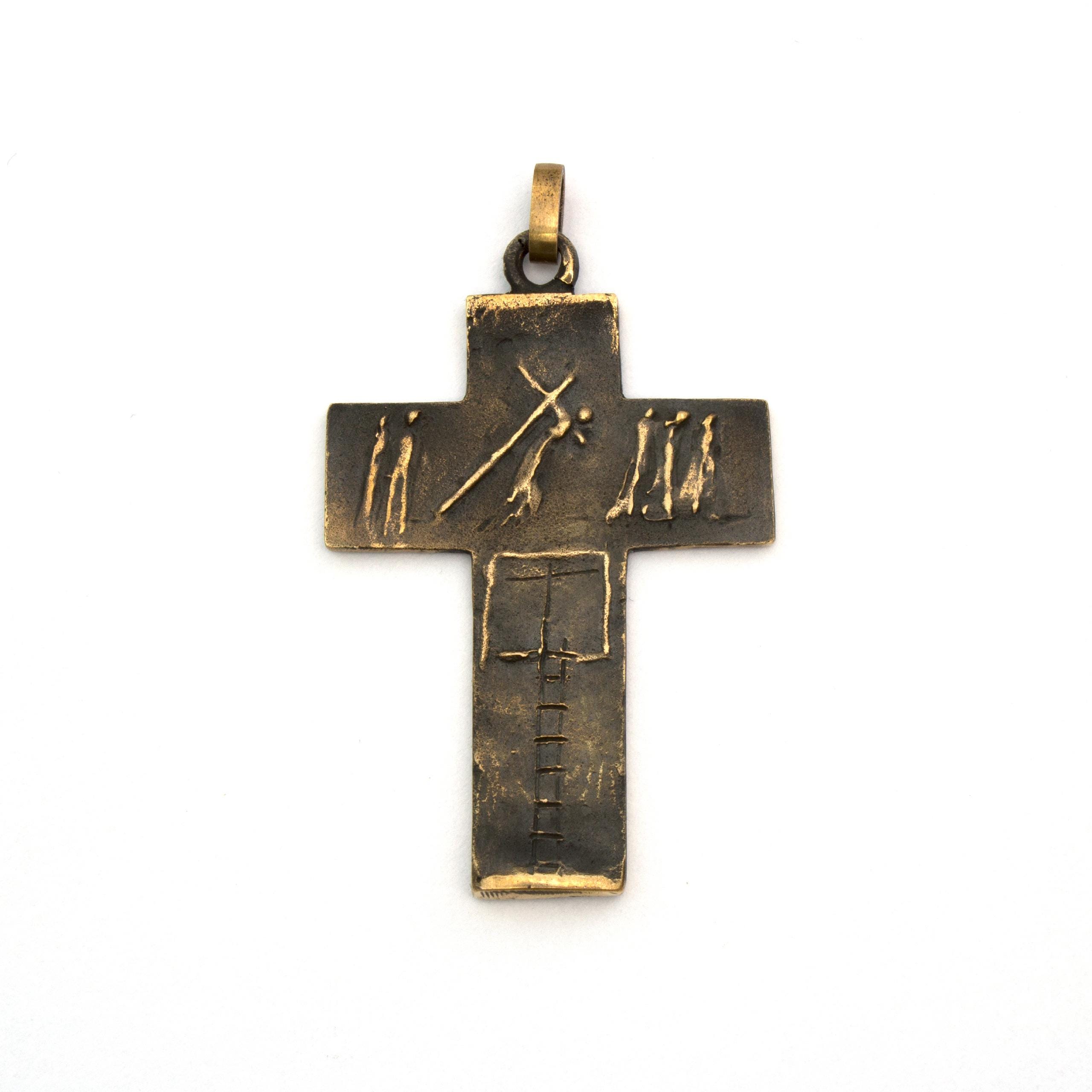 Autorský bronzový přívěsek Křížek plochý #4 od české sochařky a šperkařky Vojtěšky Vlčkové (1948–2023). Šperk byl vytvořen ručně tradiční technikou lití na ztracený vosk, která dodává bronzu osobitý charakter a jemný detail. Výjimečné dílo s trvalou estetickou i sběratelskou hodnotou.