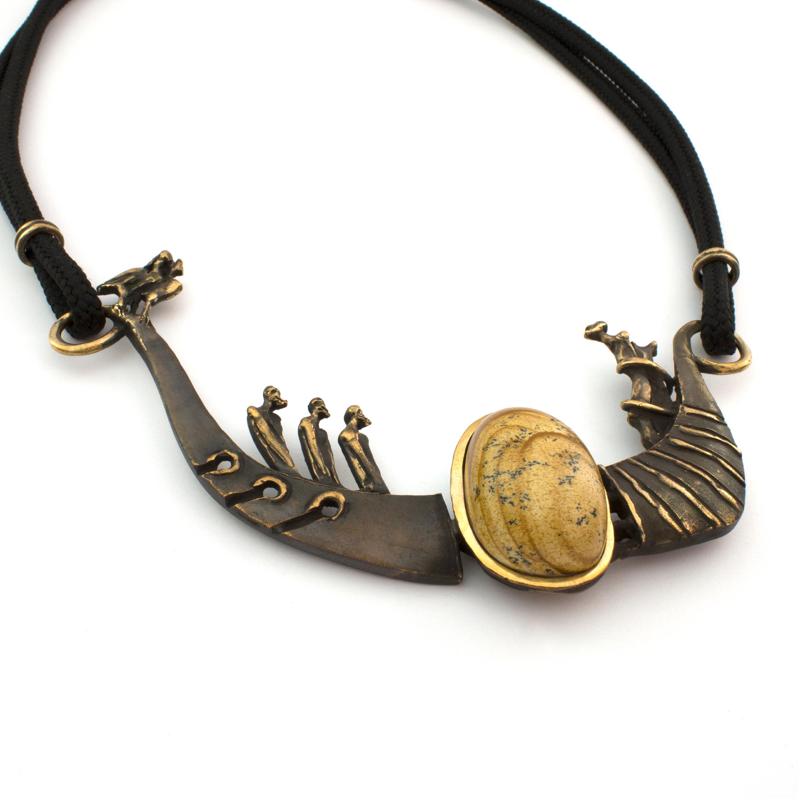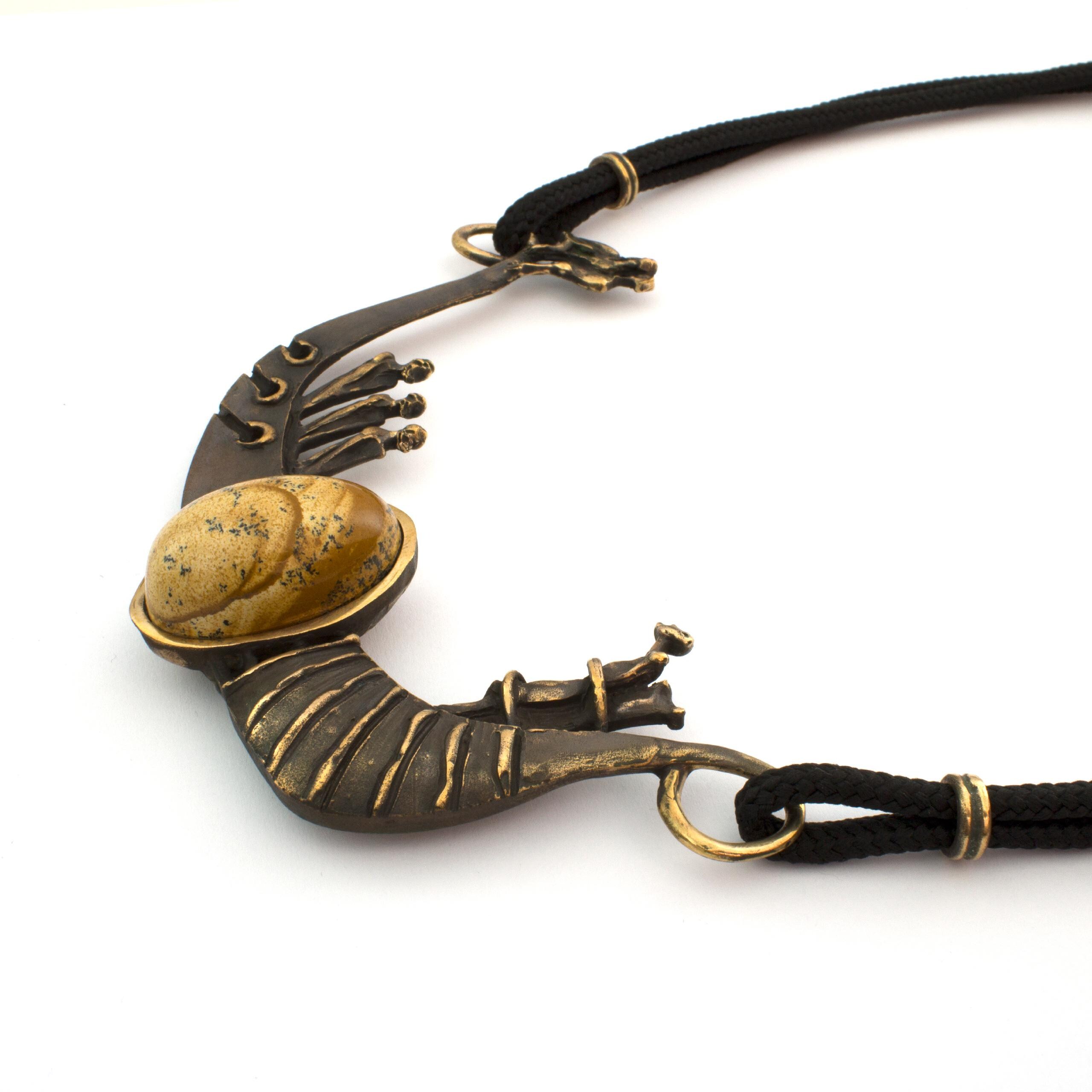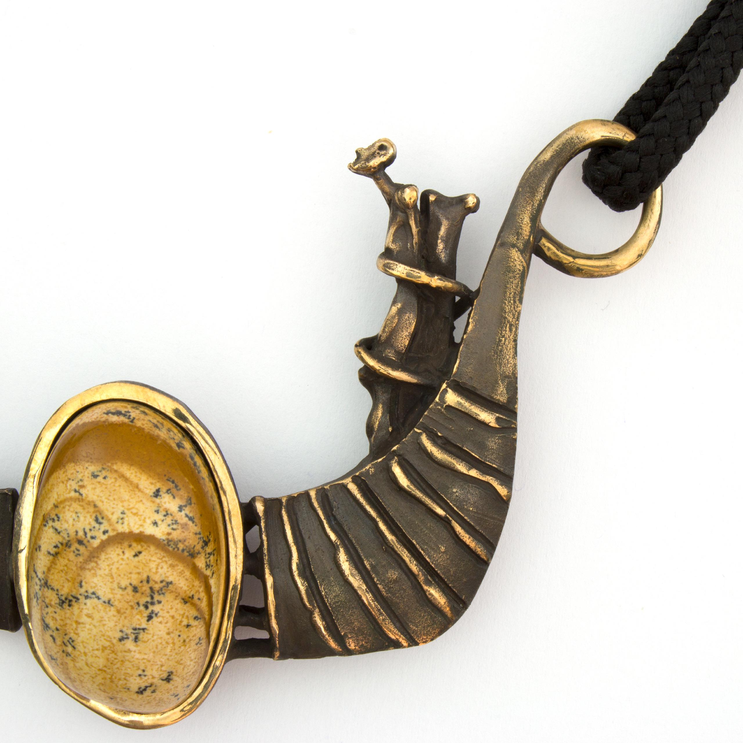 Bronzový náhrdelník s jaspisem od Vojtěšky Vlčkové Katalogové číslo: 102 Autorka: Vojtěška Vlčková Realizace: Jaromíra Pavlíková Lití na ztracený vosk, bronz, jaspis Délka cca 64 cm