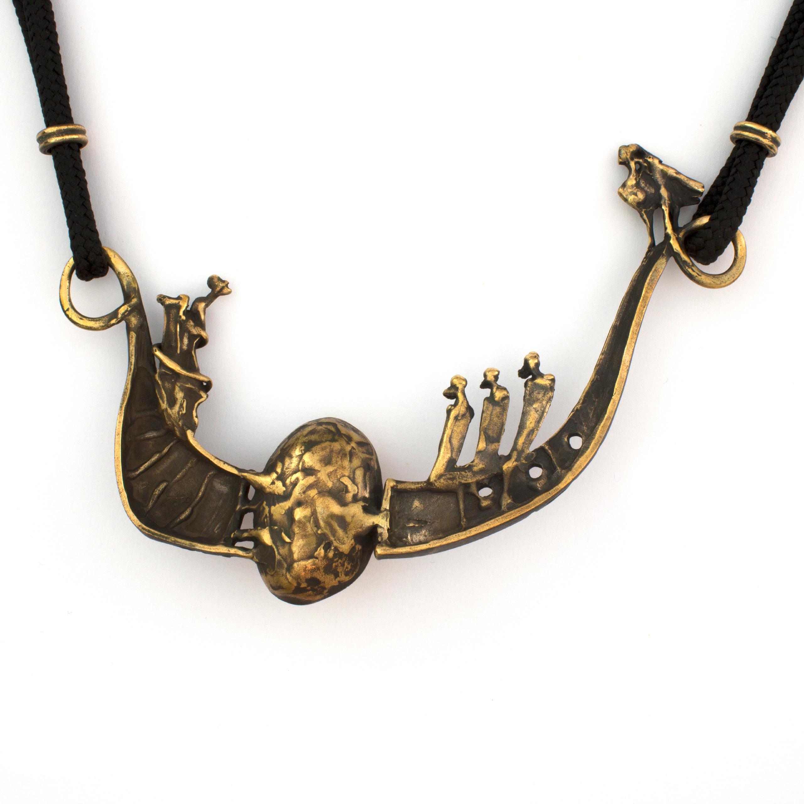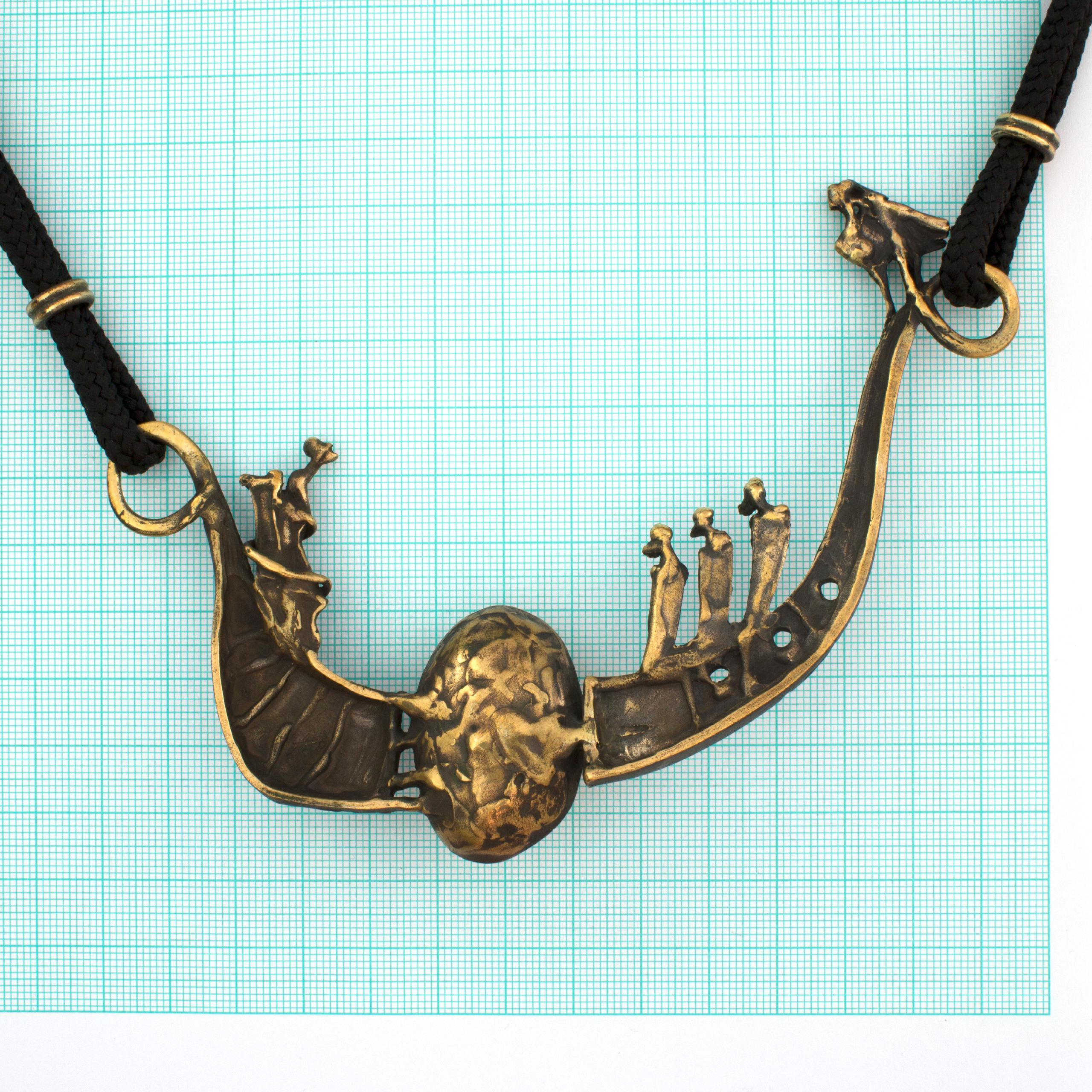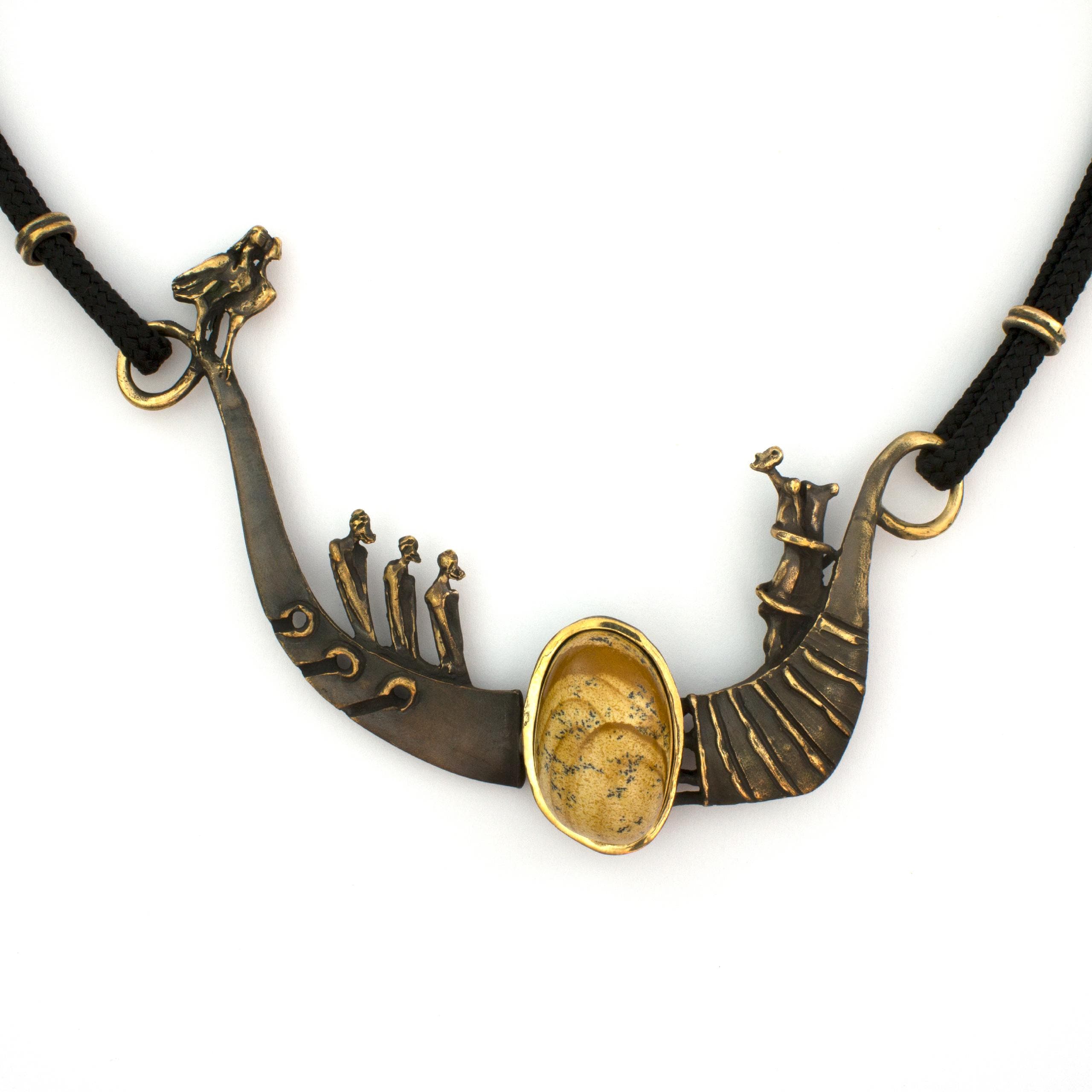 Bronzový náhrdelník s jaspisem od Vojtěšky Vlčkové Katalogové číslo: 102 Autorka: Vojtěška Vlčková Realizace: Jaromíra Pavlíková Lití na ztracený vosk, bronz, jaspis Délka cca 64 cm