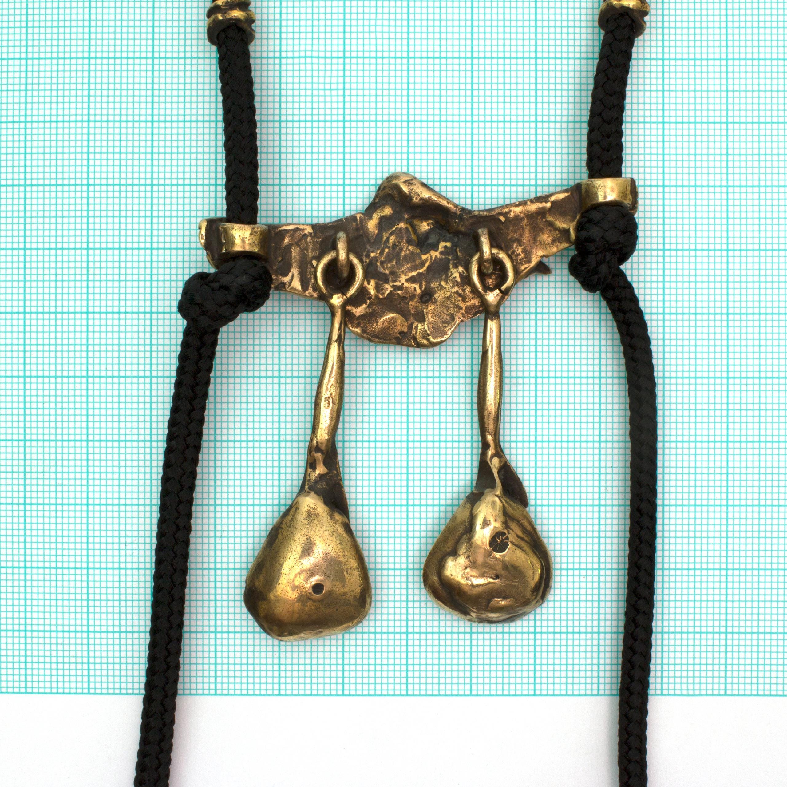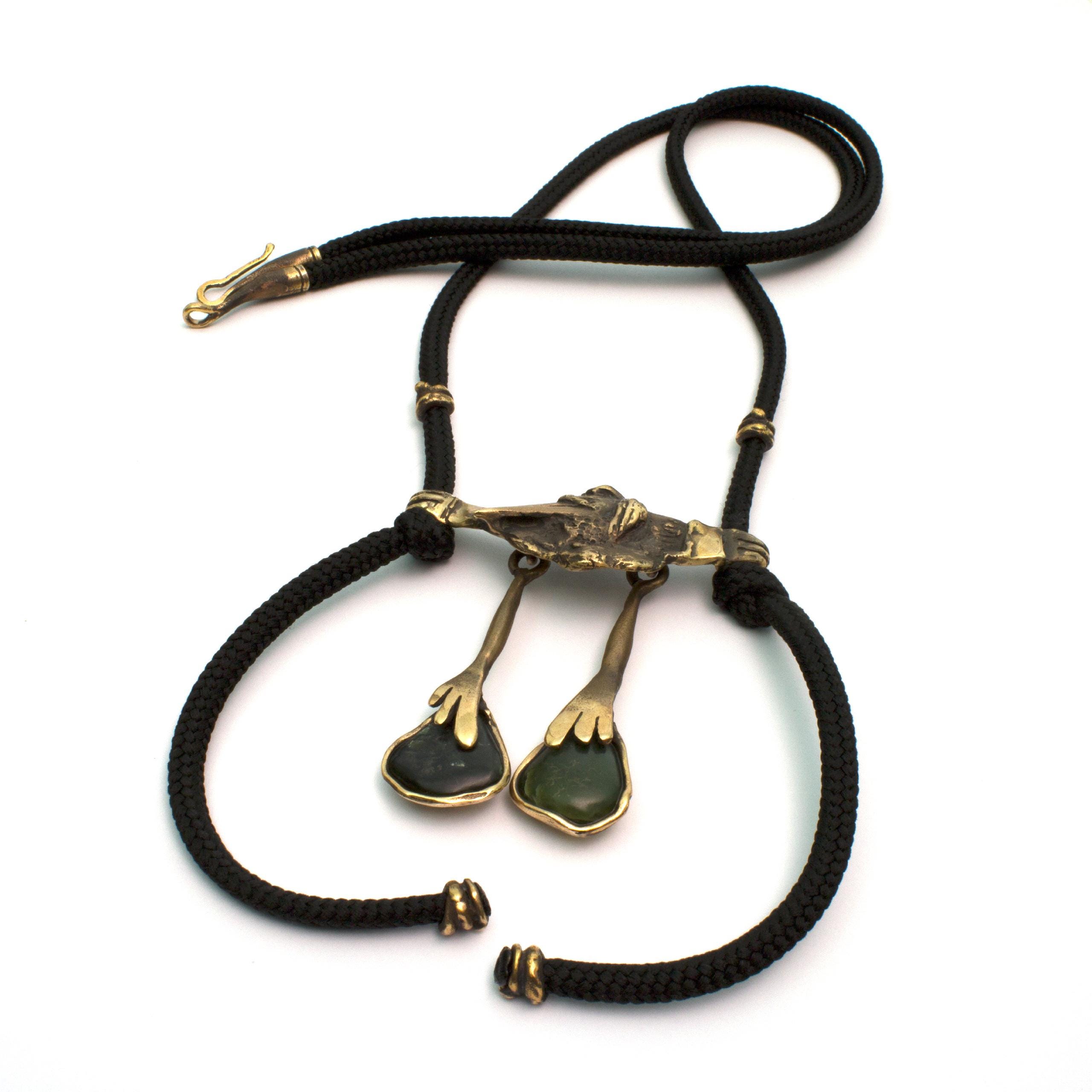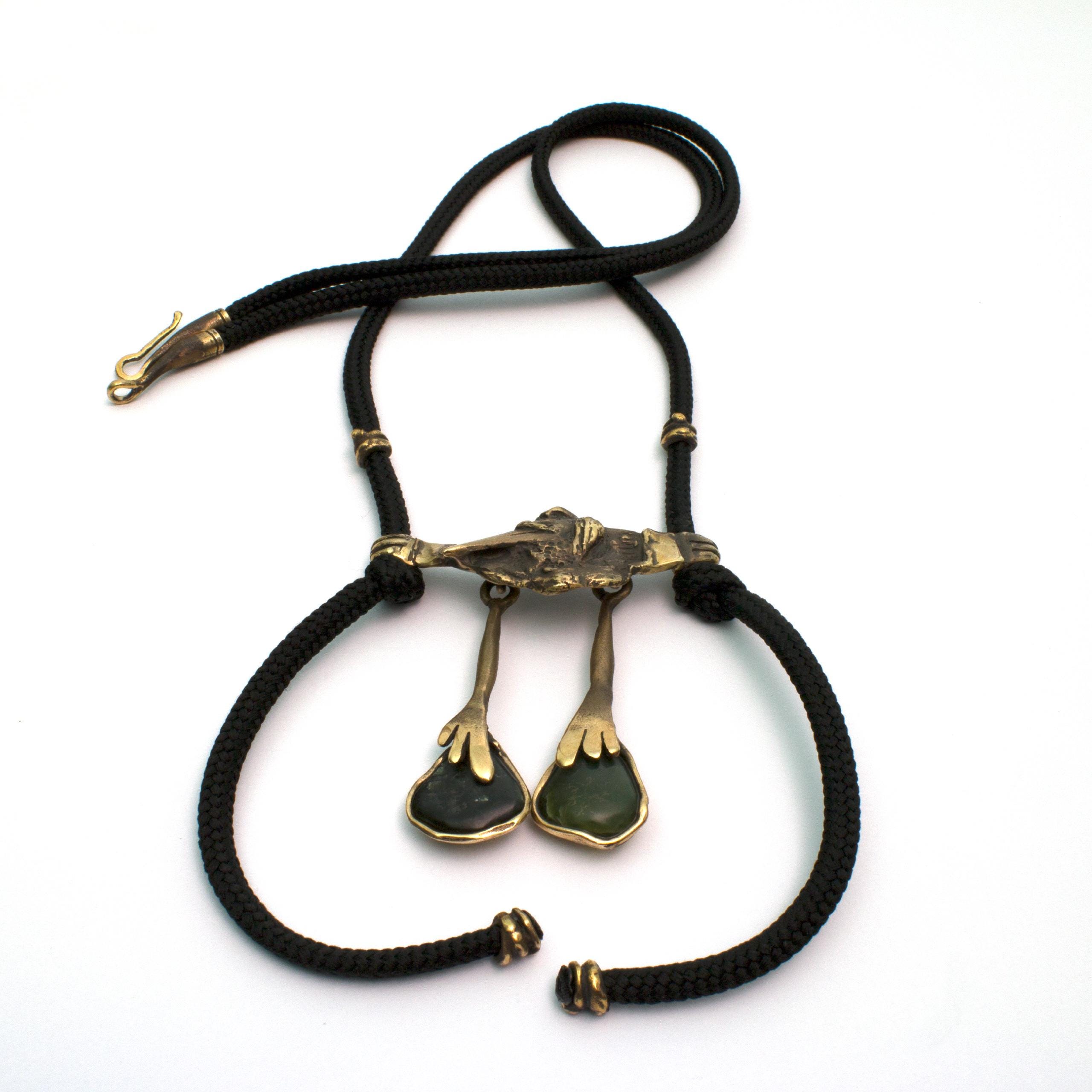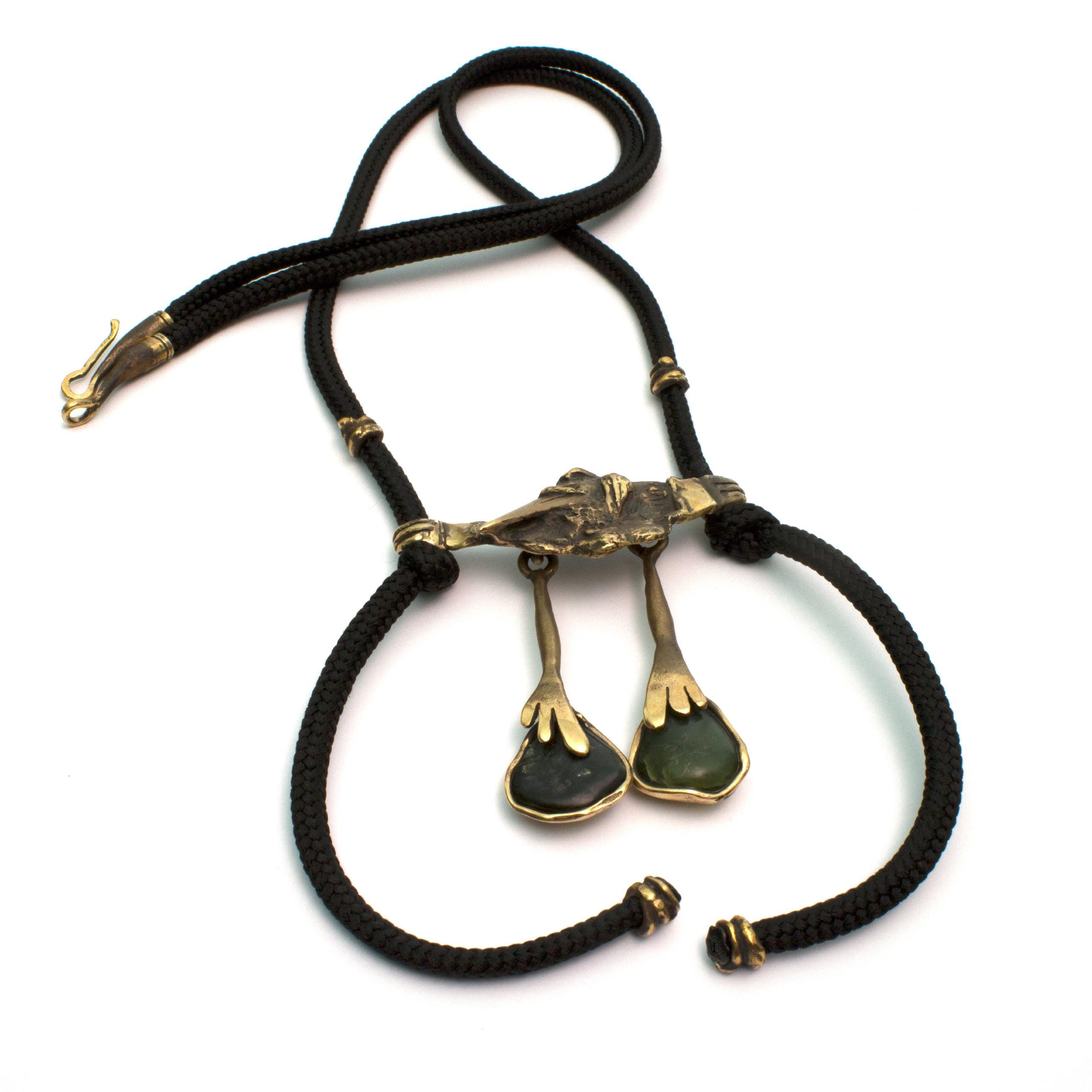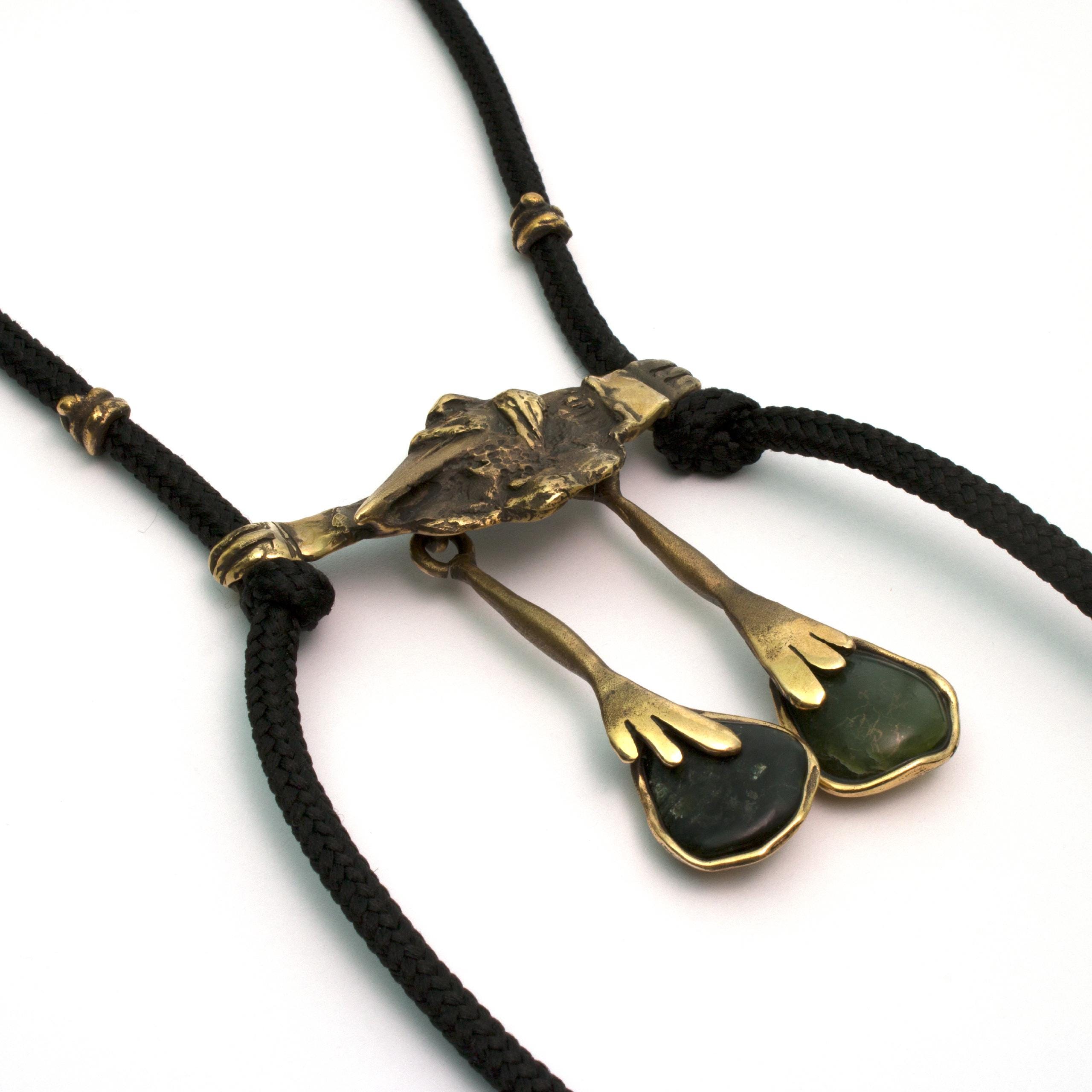 Bronzový závěs s nefritem od Vojtěšky Vlčkové Katalogové číslo: 107 Autorka: Vojtěška Vlčková Realizace: Jaromíra Pavlíková Lití na ztracený vosk, bronz, nefrit Délka cca 69 cm