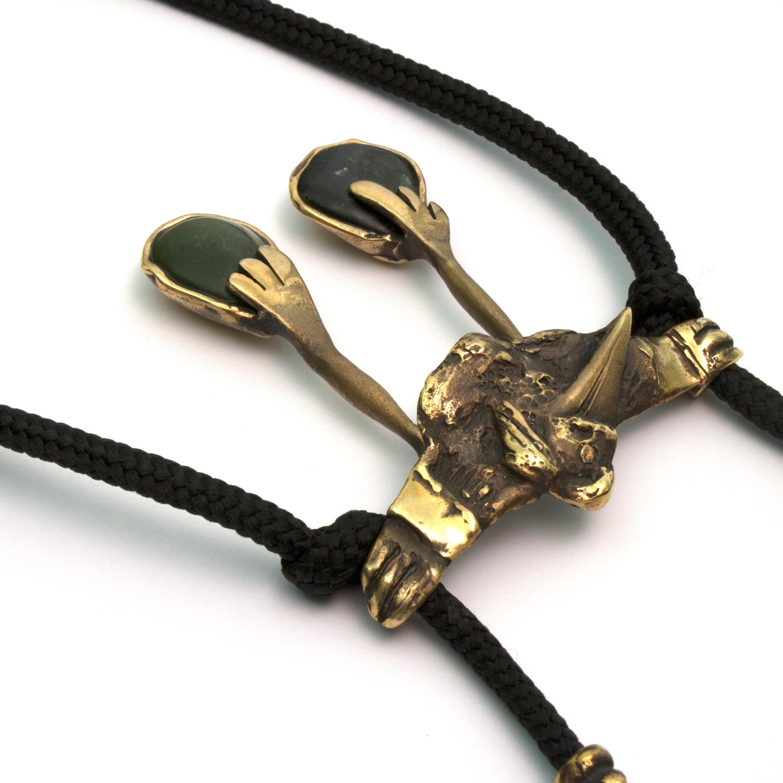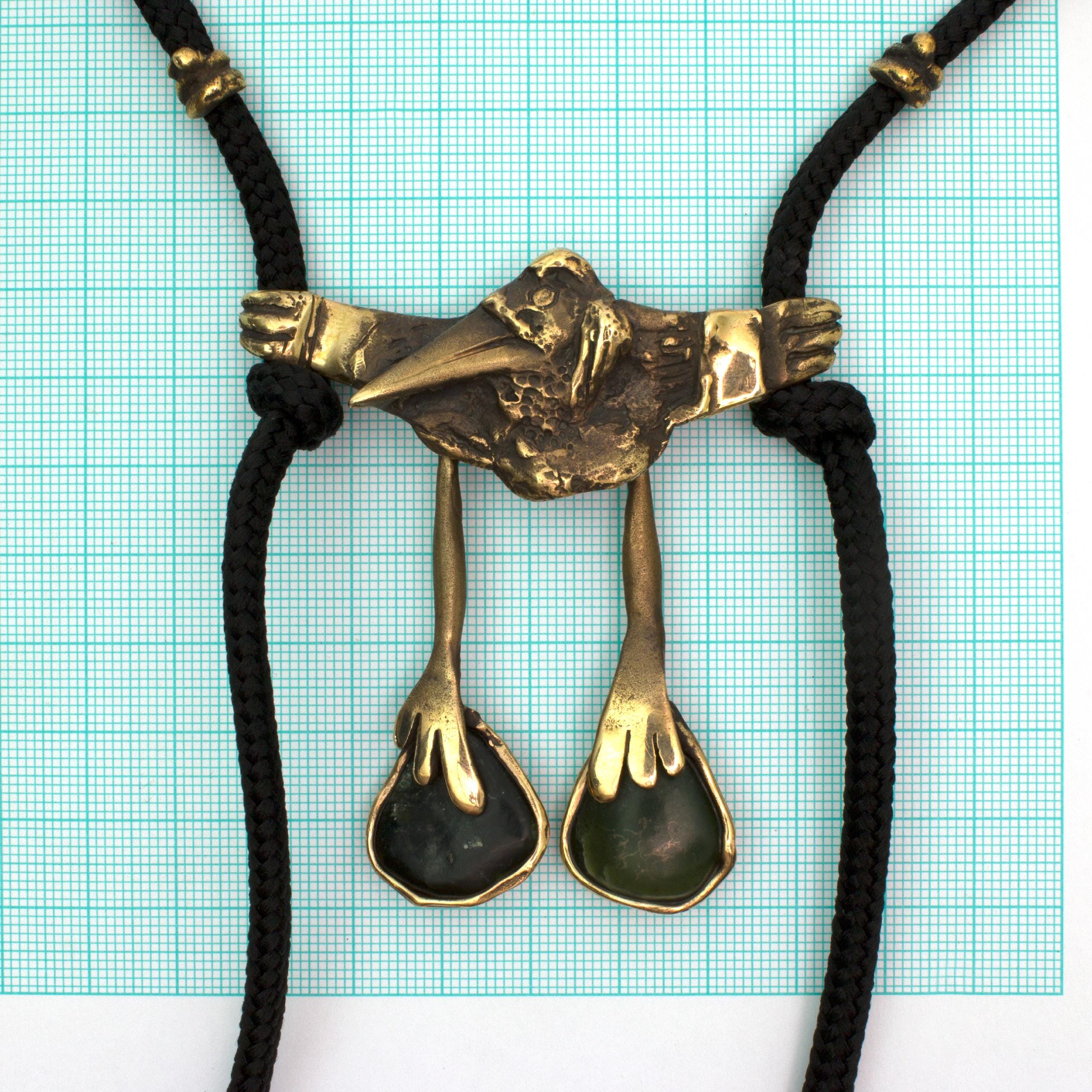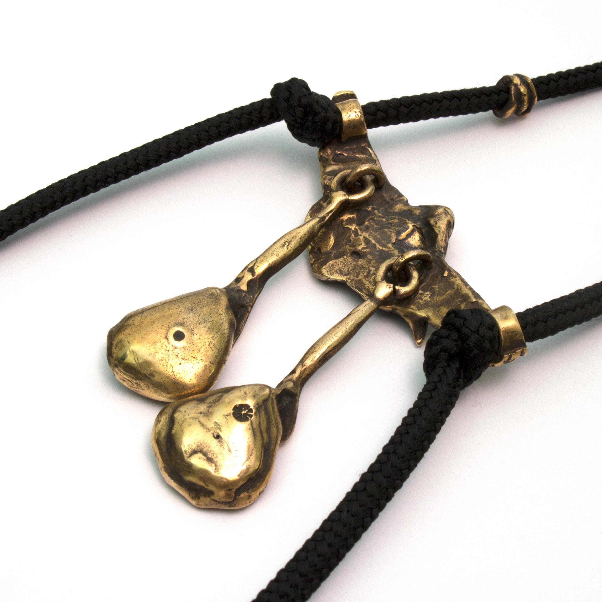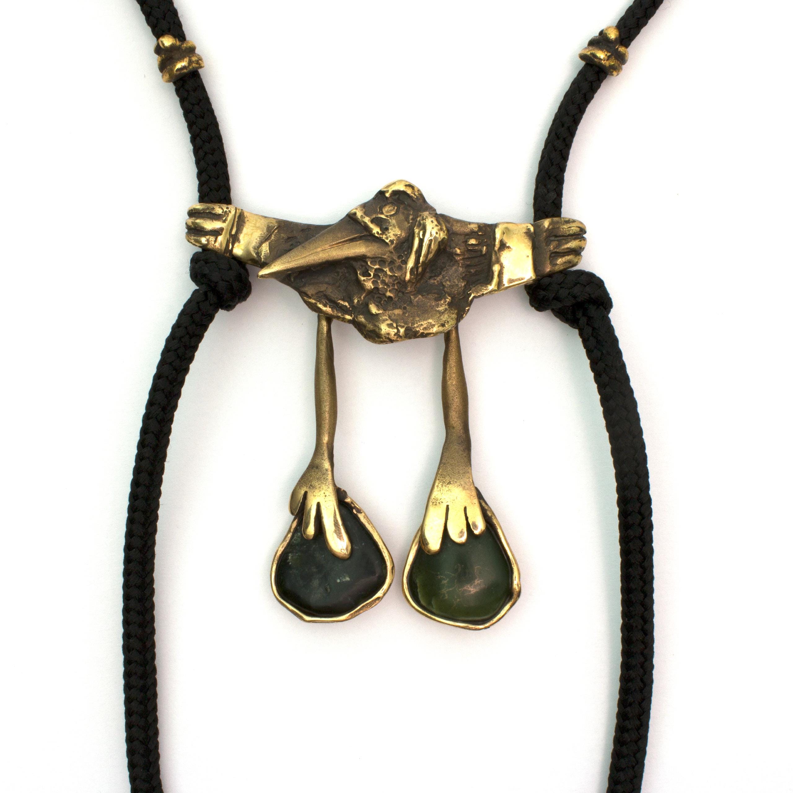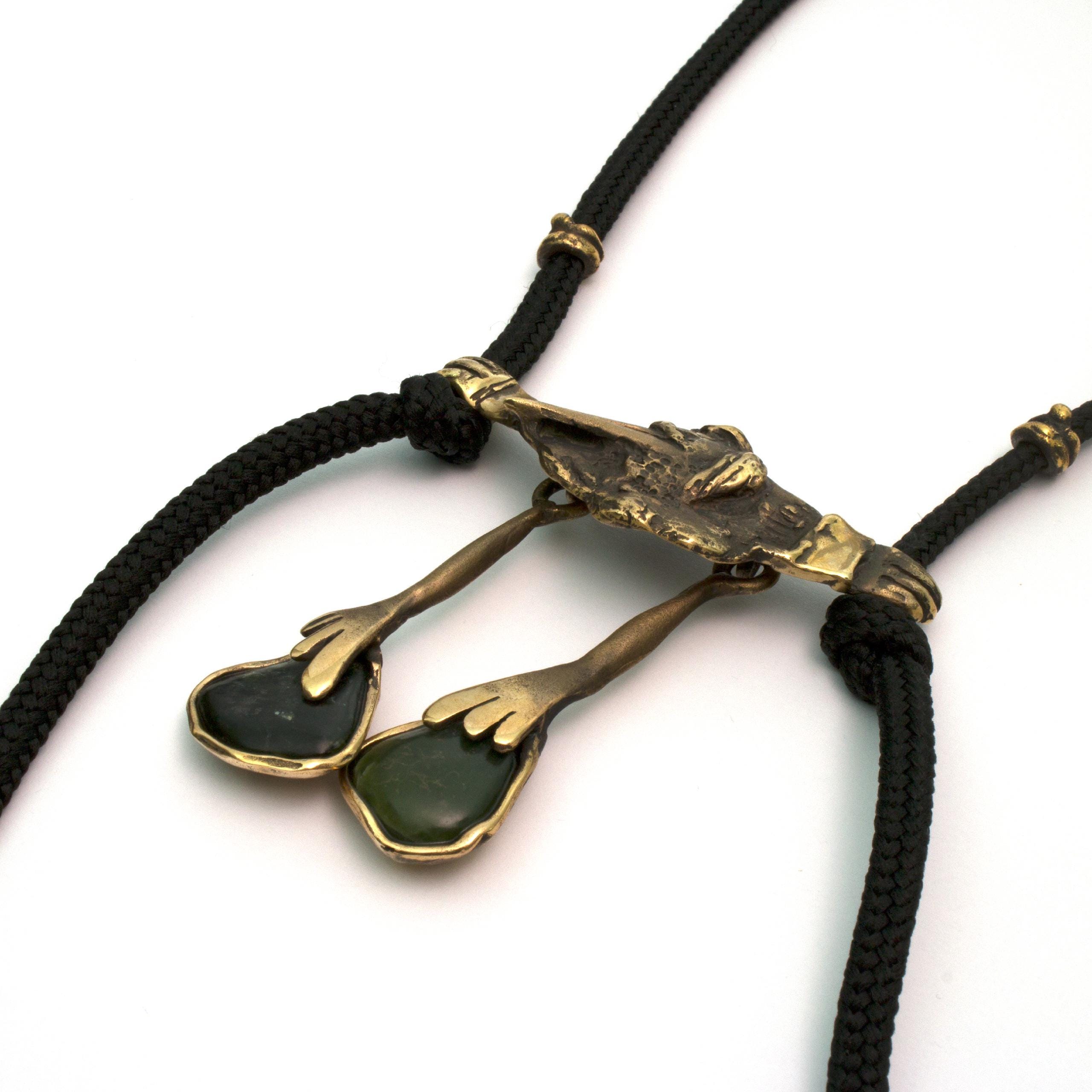 Bronzový závěs s nefritem od Vojtěšky Vlčkové Katalogové číslo: 107 Autorka: Vojtěška Vlčková Realizace: Jaromíra Pavlíková Lití na ztracený vosk, bronz, nefrit Délka cca 69 cm