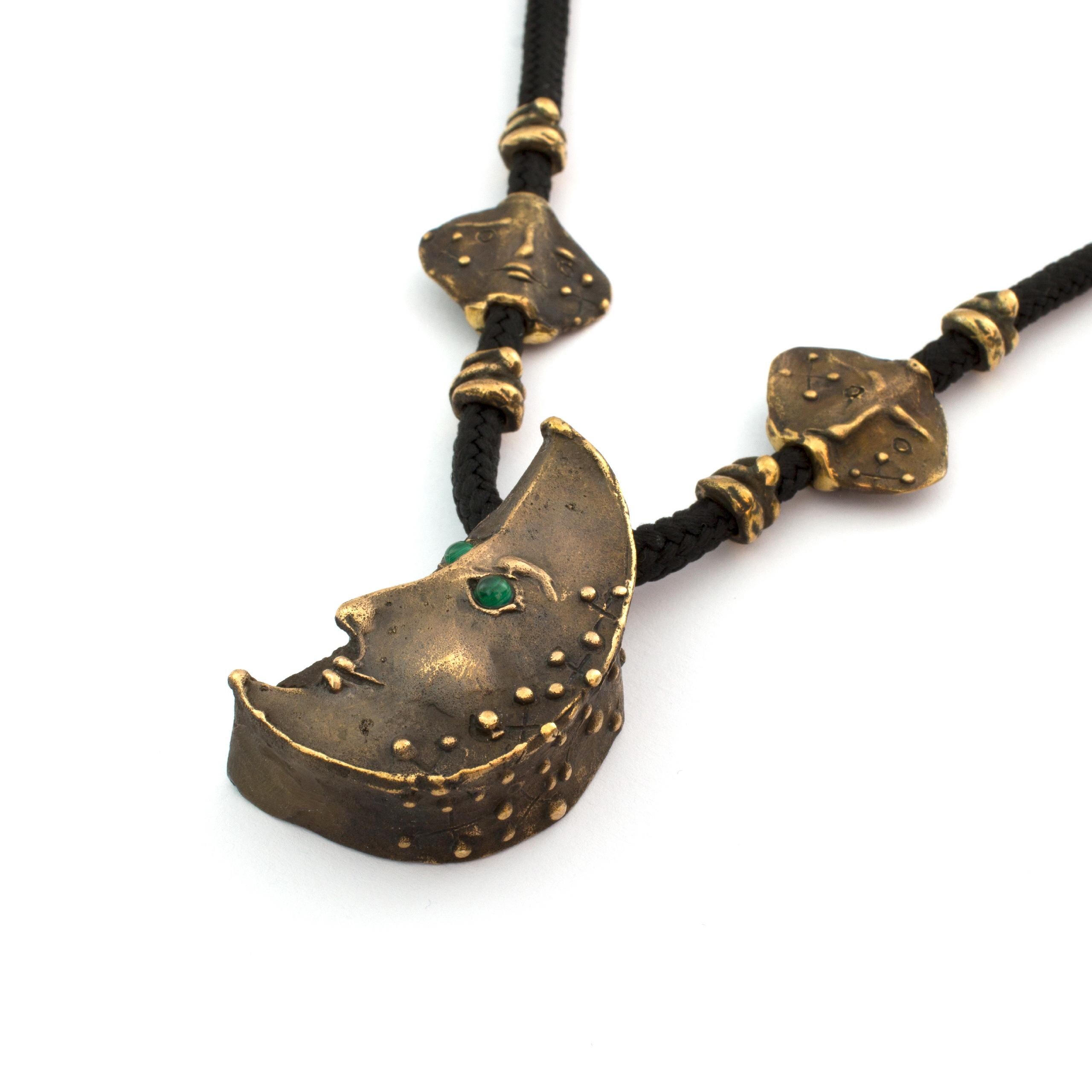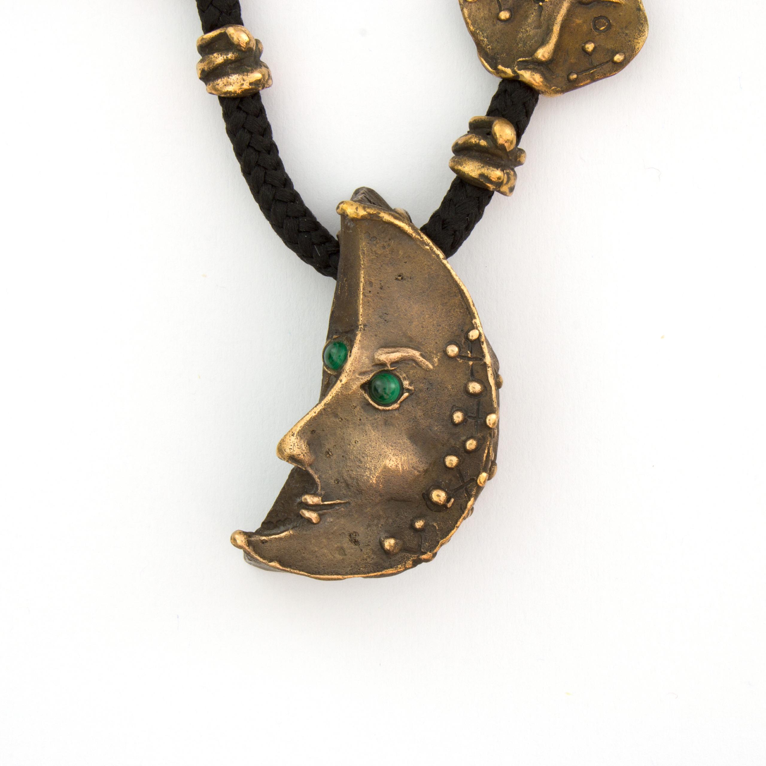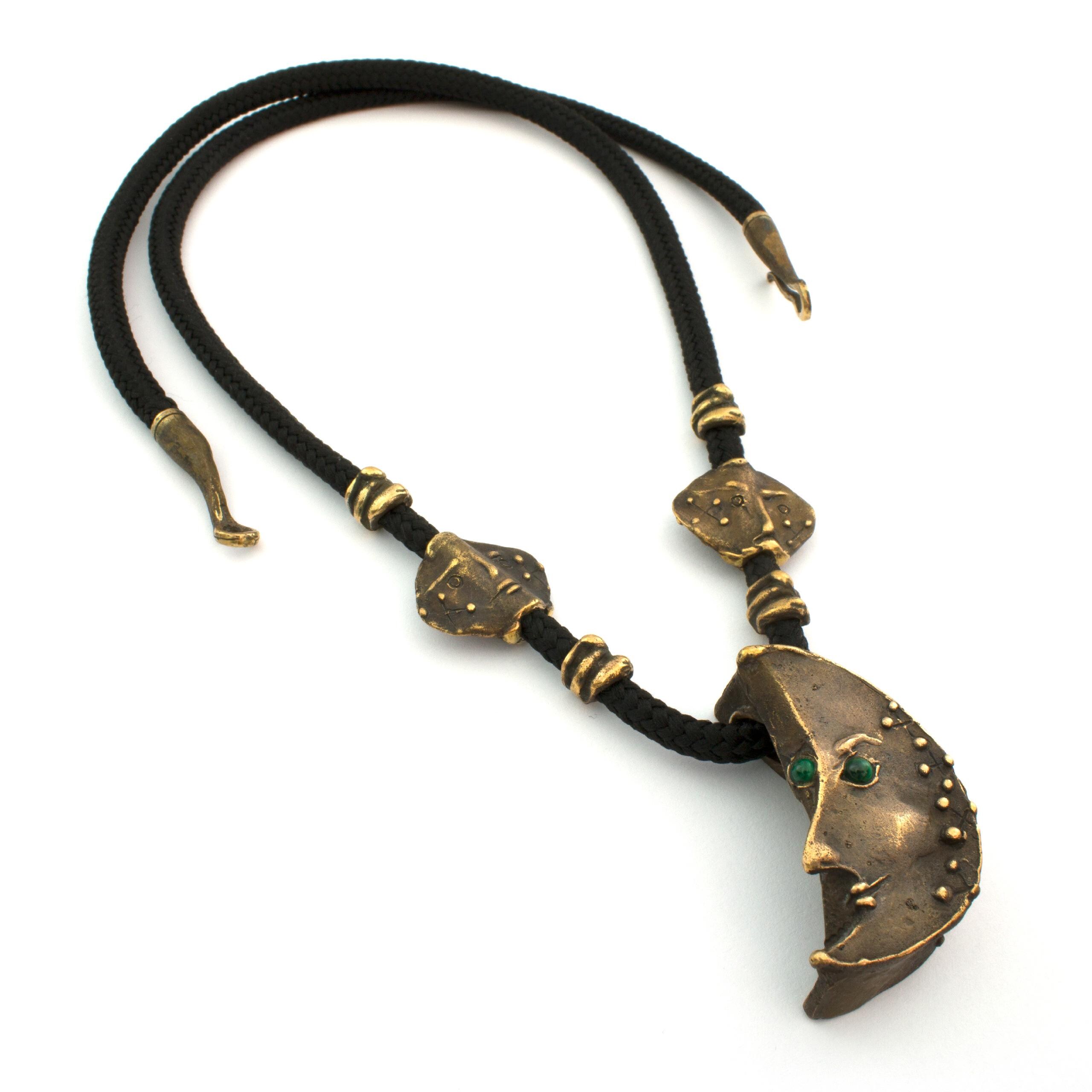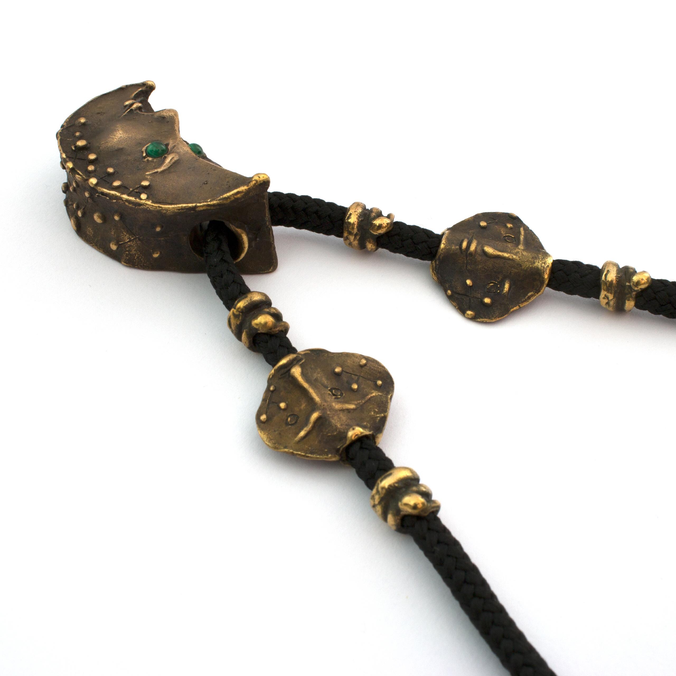 Bronzový závěs s malachitem od Vojtěšky Vlčkové Katalogové číslo: 109 Autorka: Vojtěška Vlčková Realizace: Jaromíra Pavlíková Lití na ztracený vosk, bronz, malachit Délka cca 69 cm