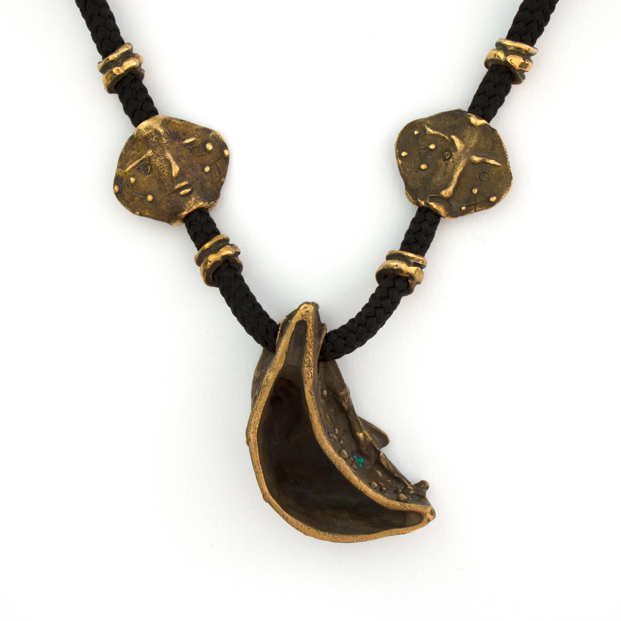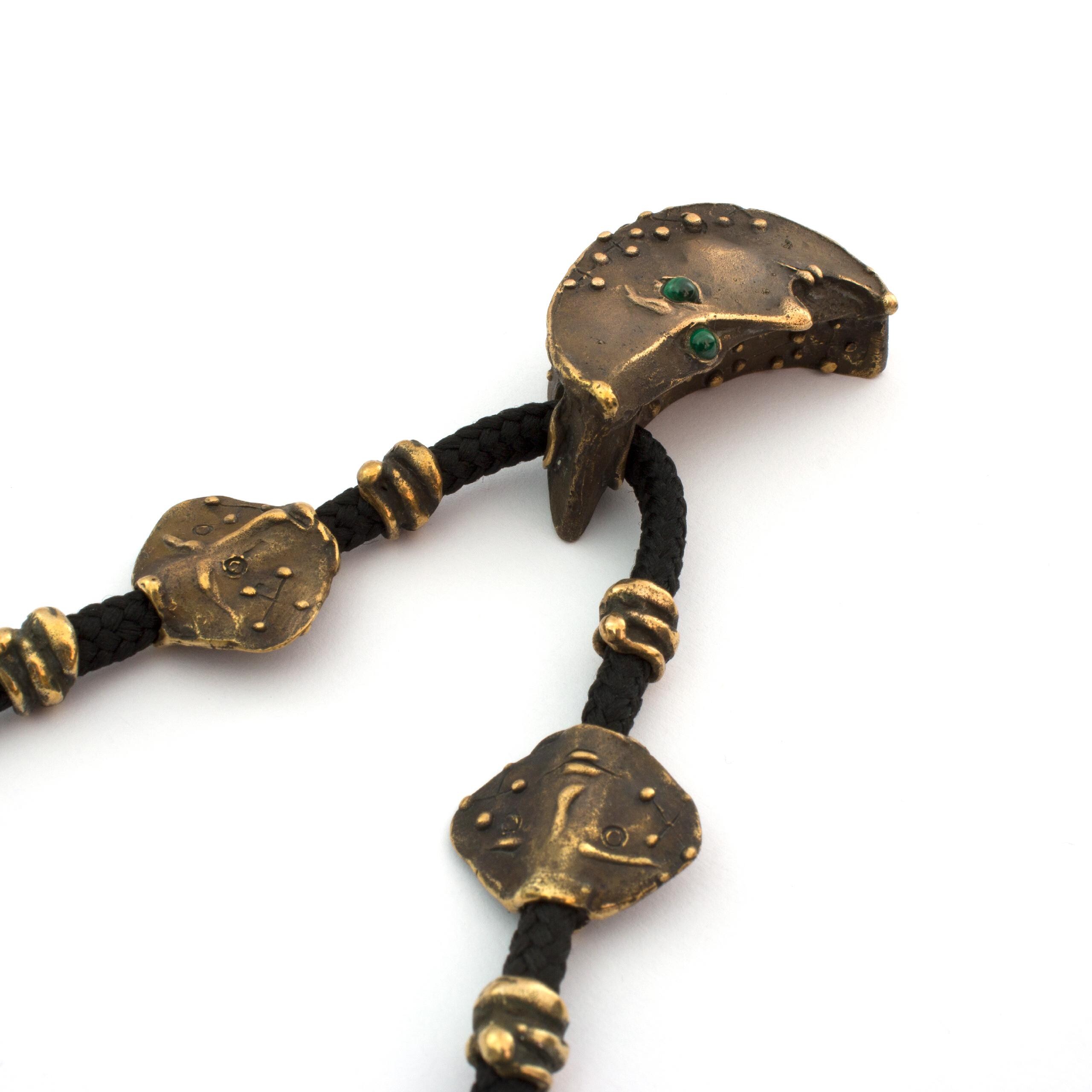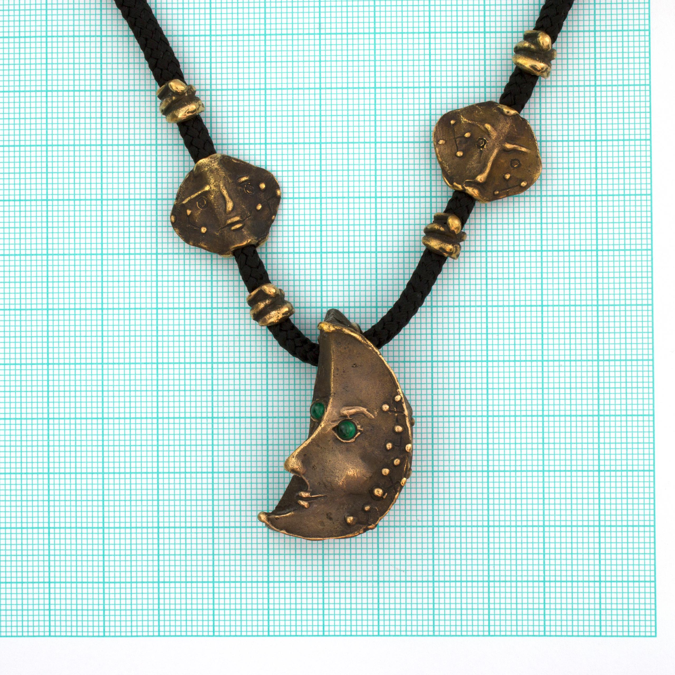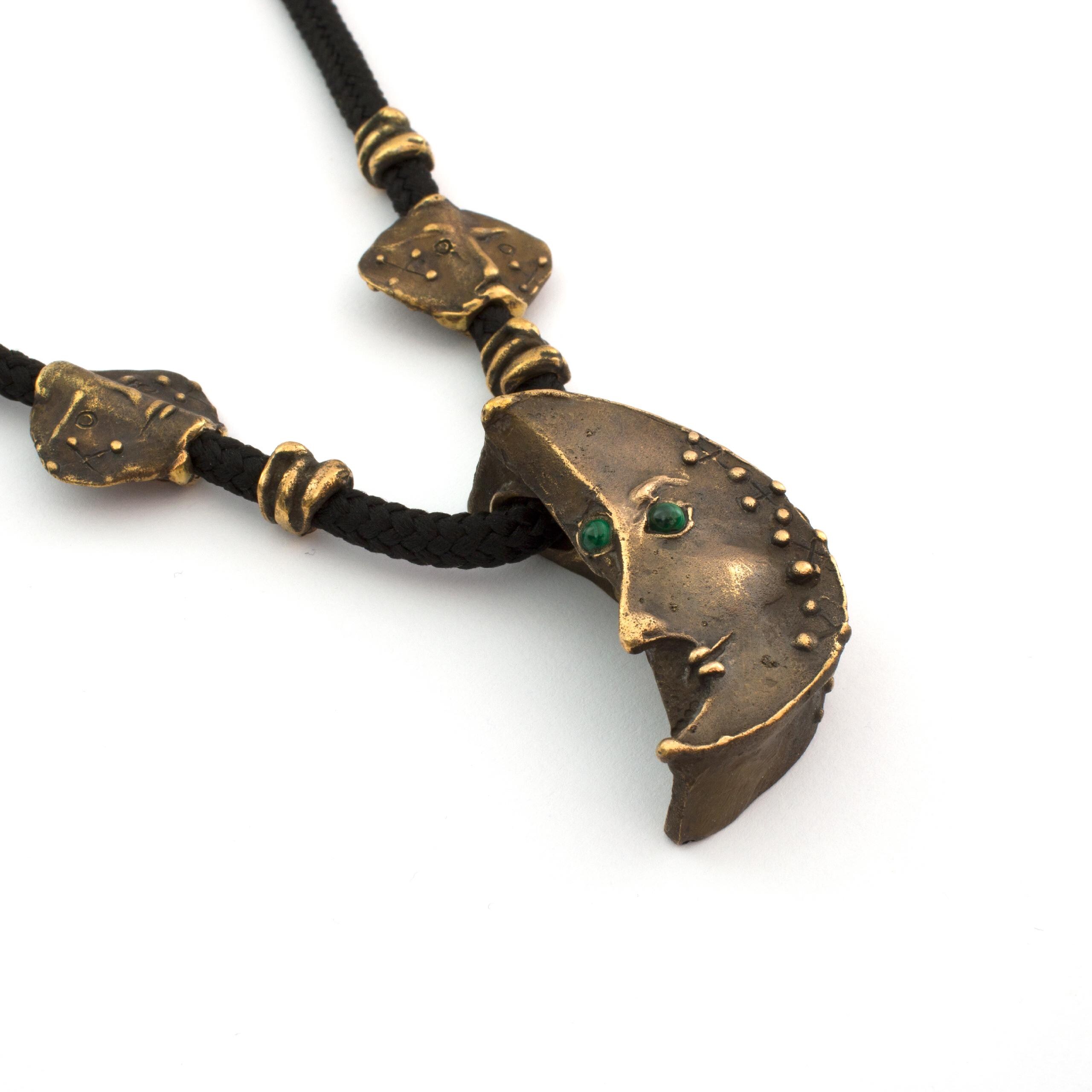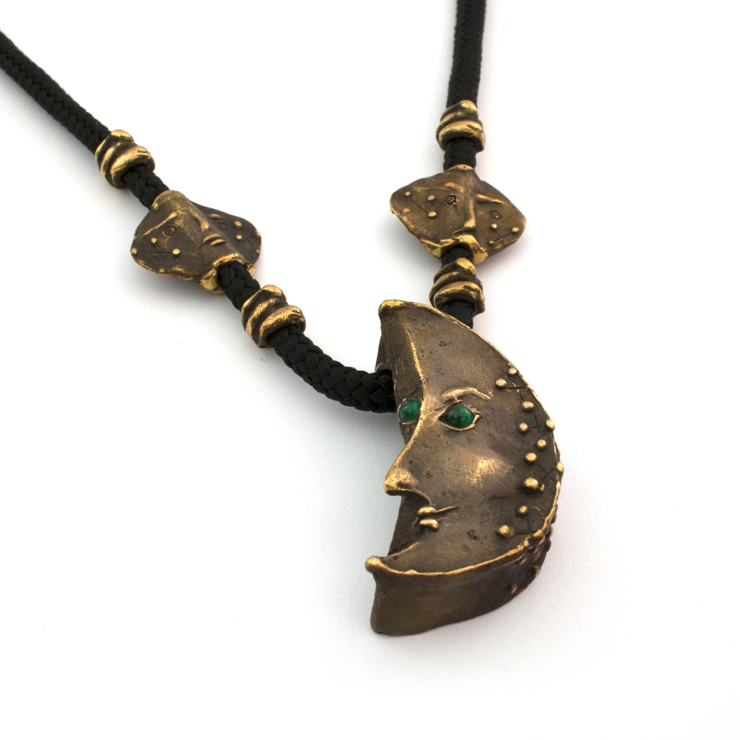 Bronzový závěs s malachitem od Vojtěšky Vlčkové Katalogové číslo: 109 Autorka: Vojtěška Vlčková Realizace: Jaromíra Pavlíková Lití na ztracený vosk, bronz, malachit Délka cca 69 cm