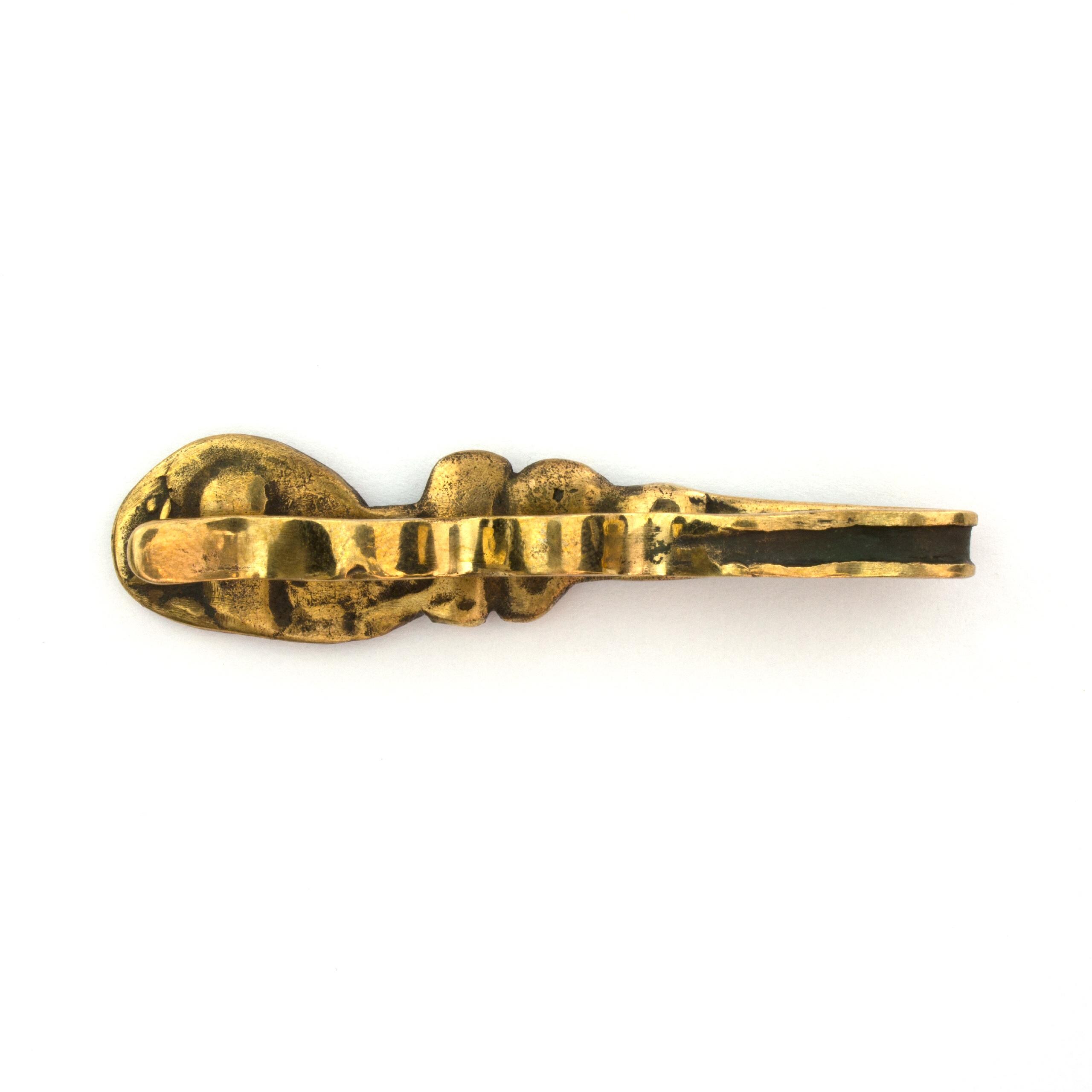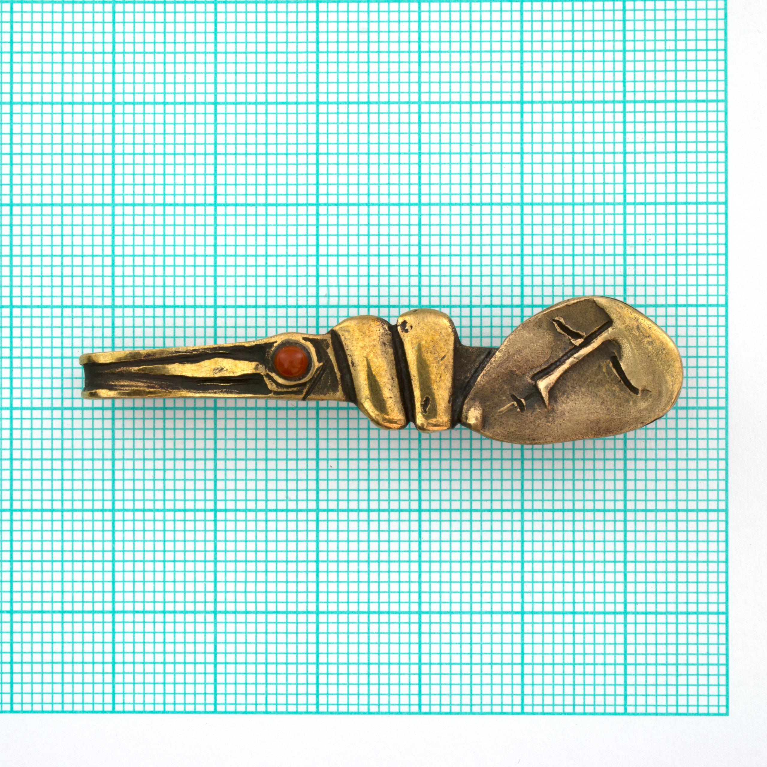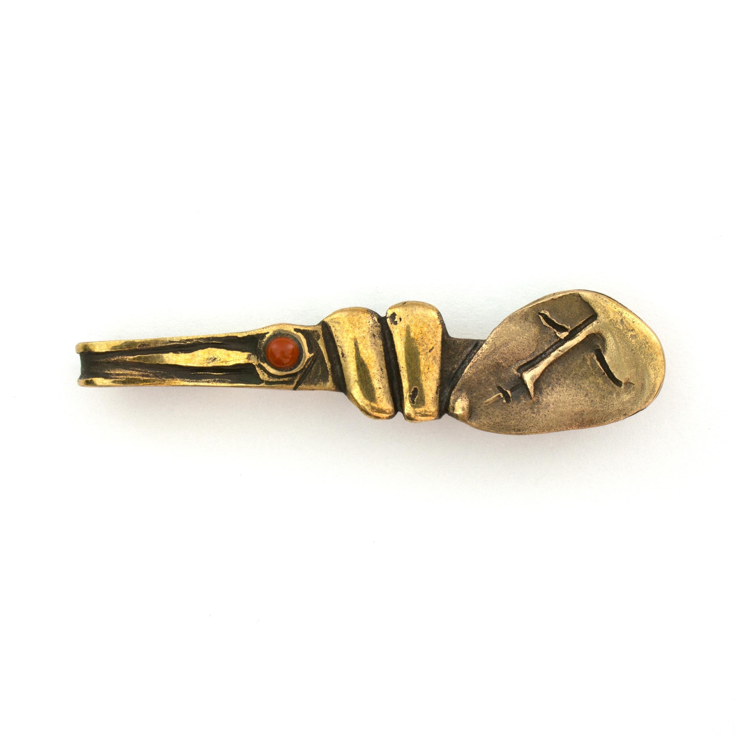 Bronzová kravatová spona s jaspisem od Vojtěšky Vlčkové Katalogové číslo: 131 Autorka: Vojtěška Vlčková Realizace: Jaromíra Pavlíková Lití na ztracený vosk, bronz, jaspis