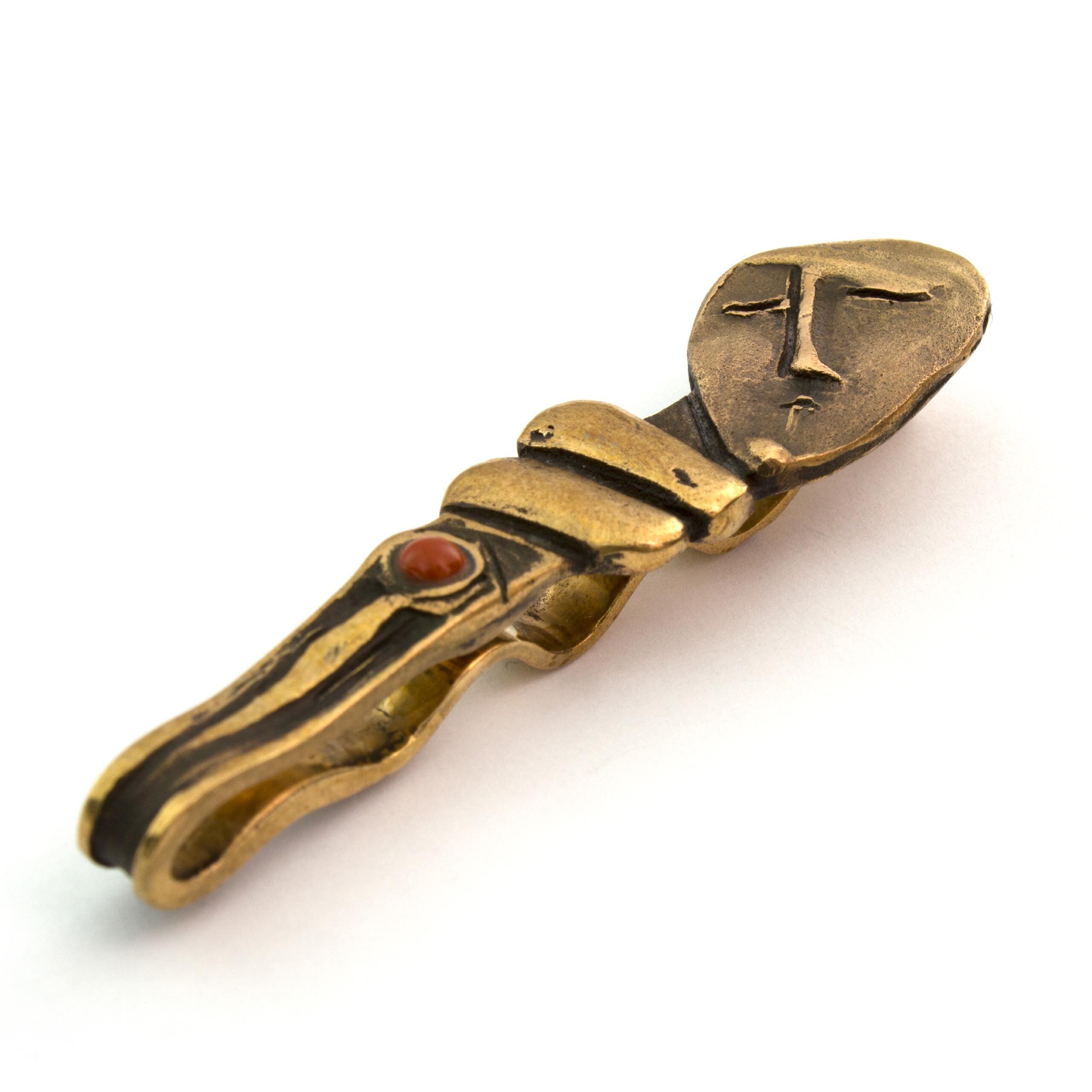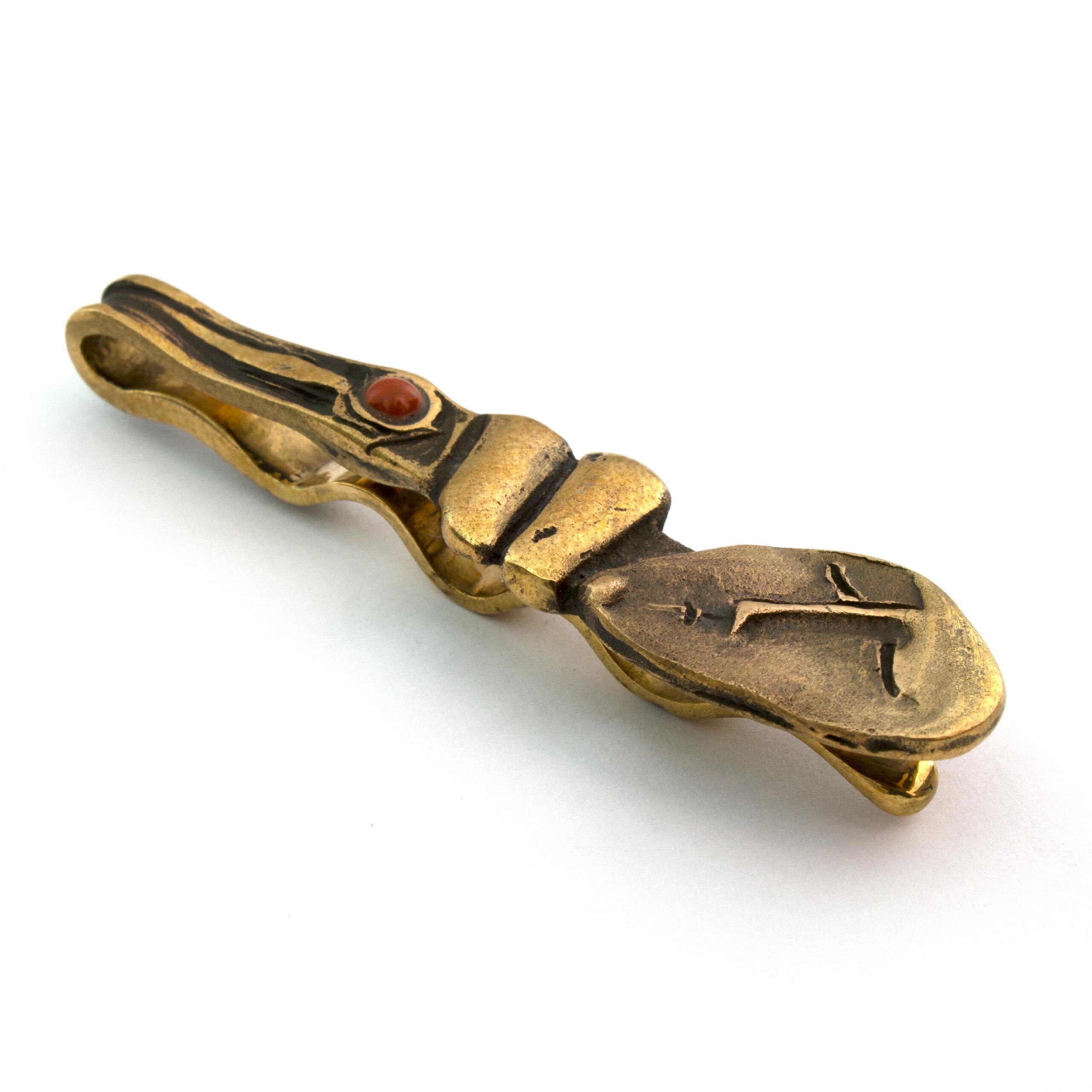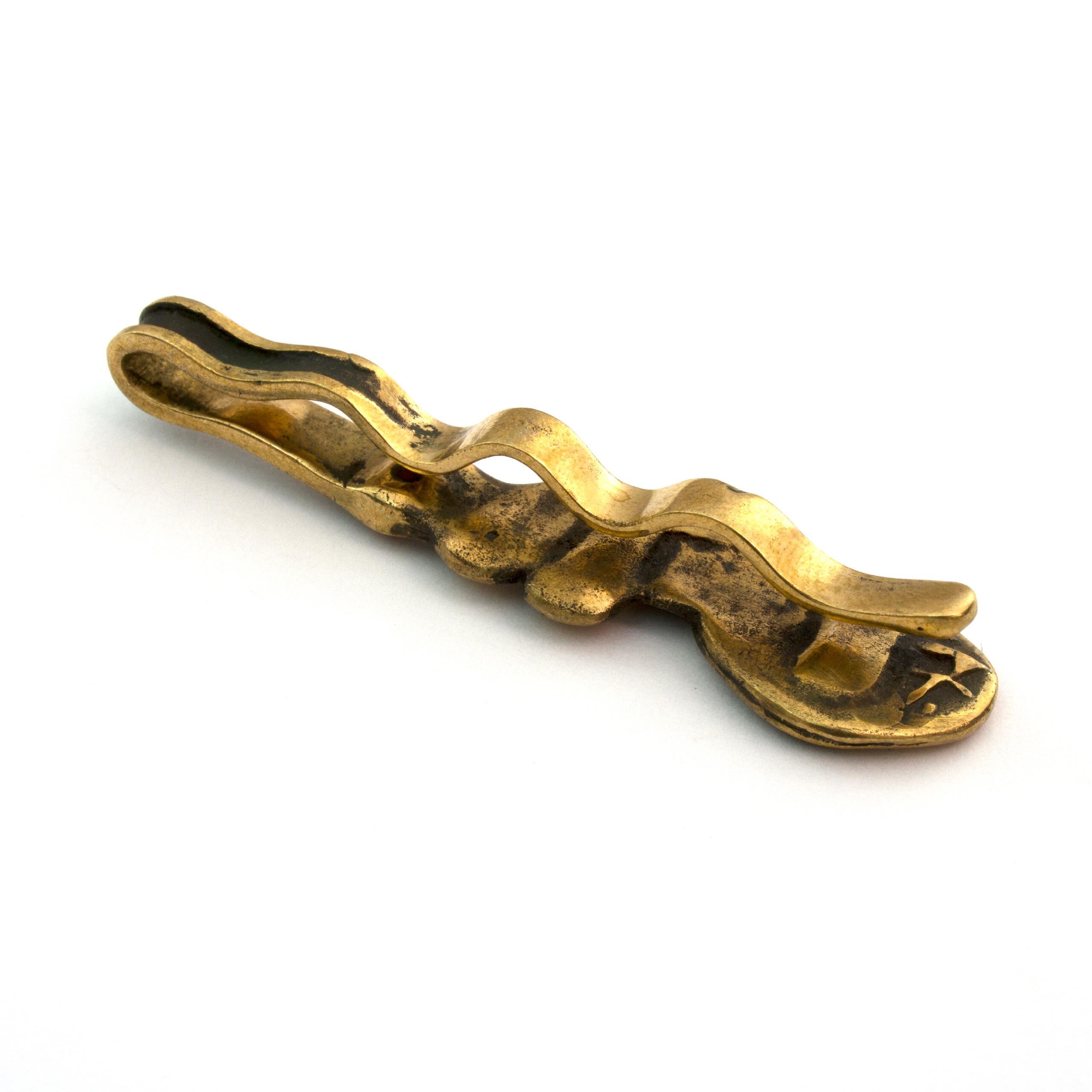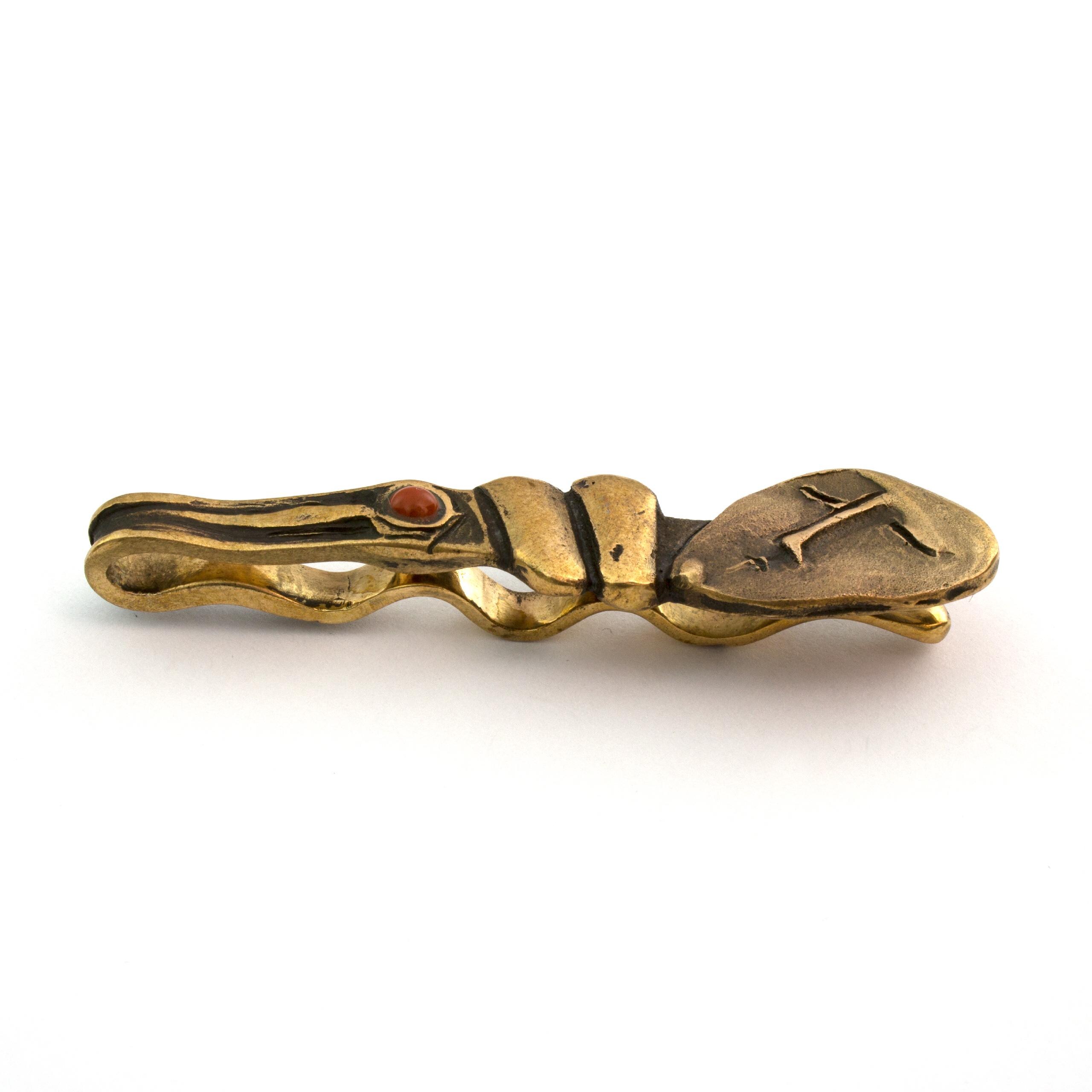 Bronzová kravatová spona s jaspisem od Vojtěšky Vlčkové Katalogové číslo: 131 Autorka: Vojtěška Vlčková Realizace: Jaromíra Pavlíková Lití na ztracený vosk, bronz, jaspis