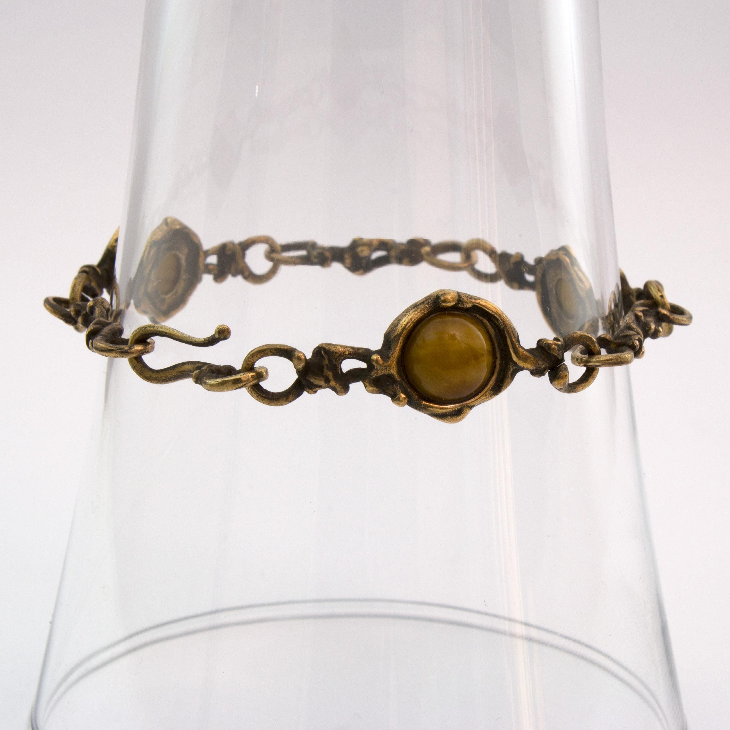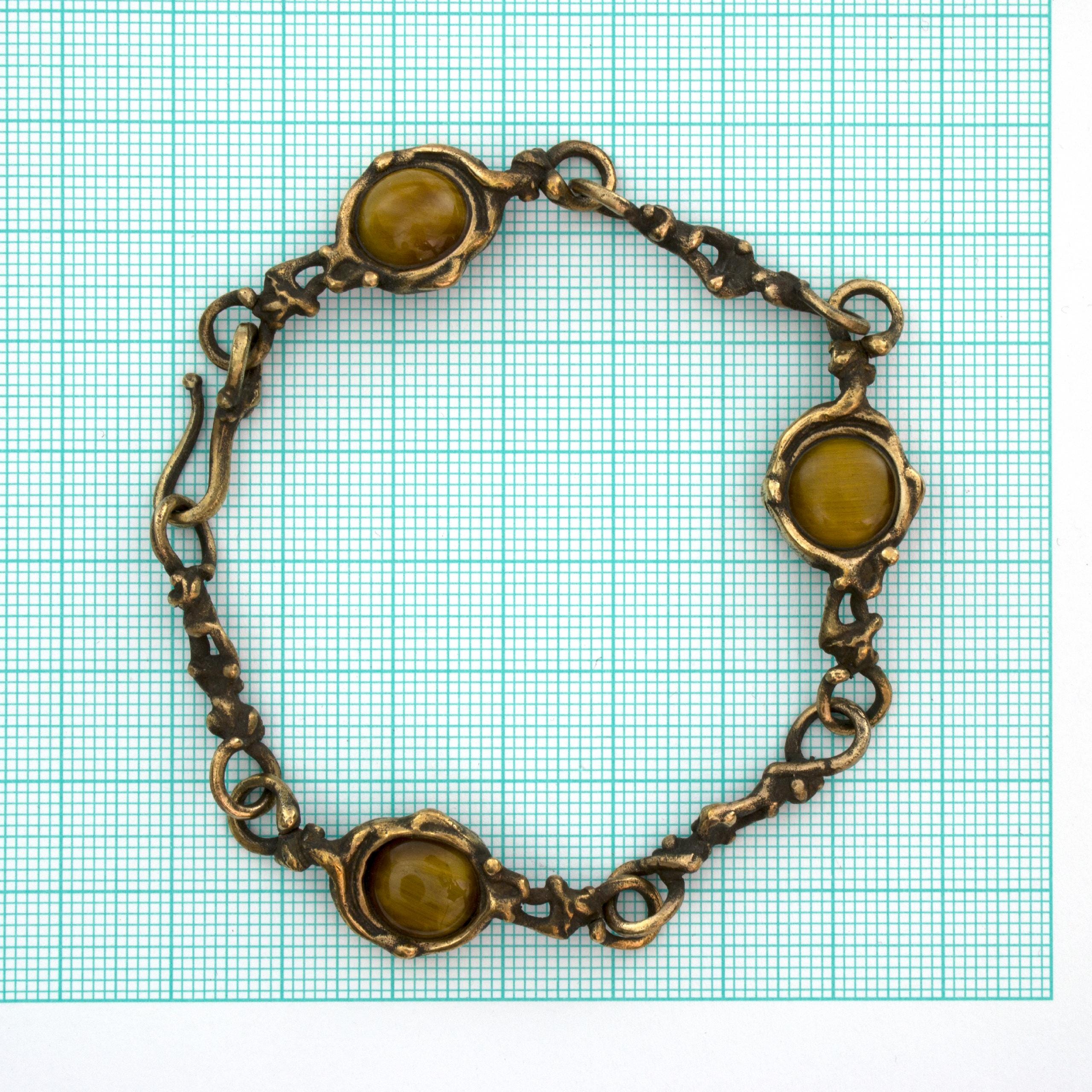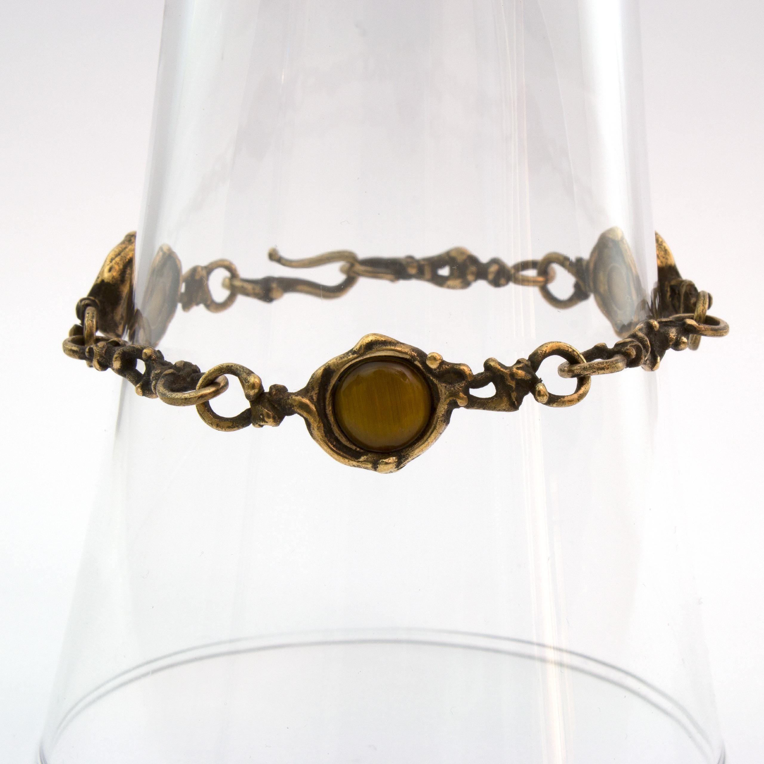 Bronzový náramek s tygřím okem od Vojtěšky Vlčkové Katalogové číslo: 162 Autorka: Vojtěška Vlčková Realizace: Jaromíra Pavlíková Lití na ztracený vosk, bronz, tygří oko Délka cca 21 cm