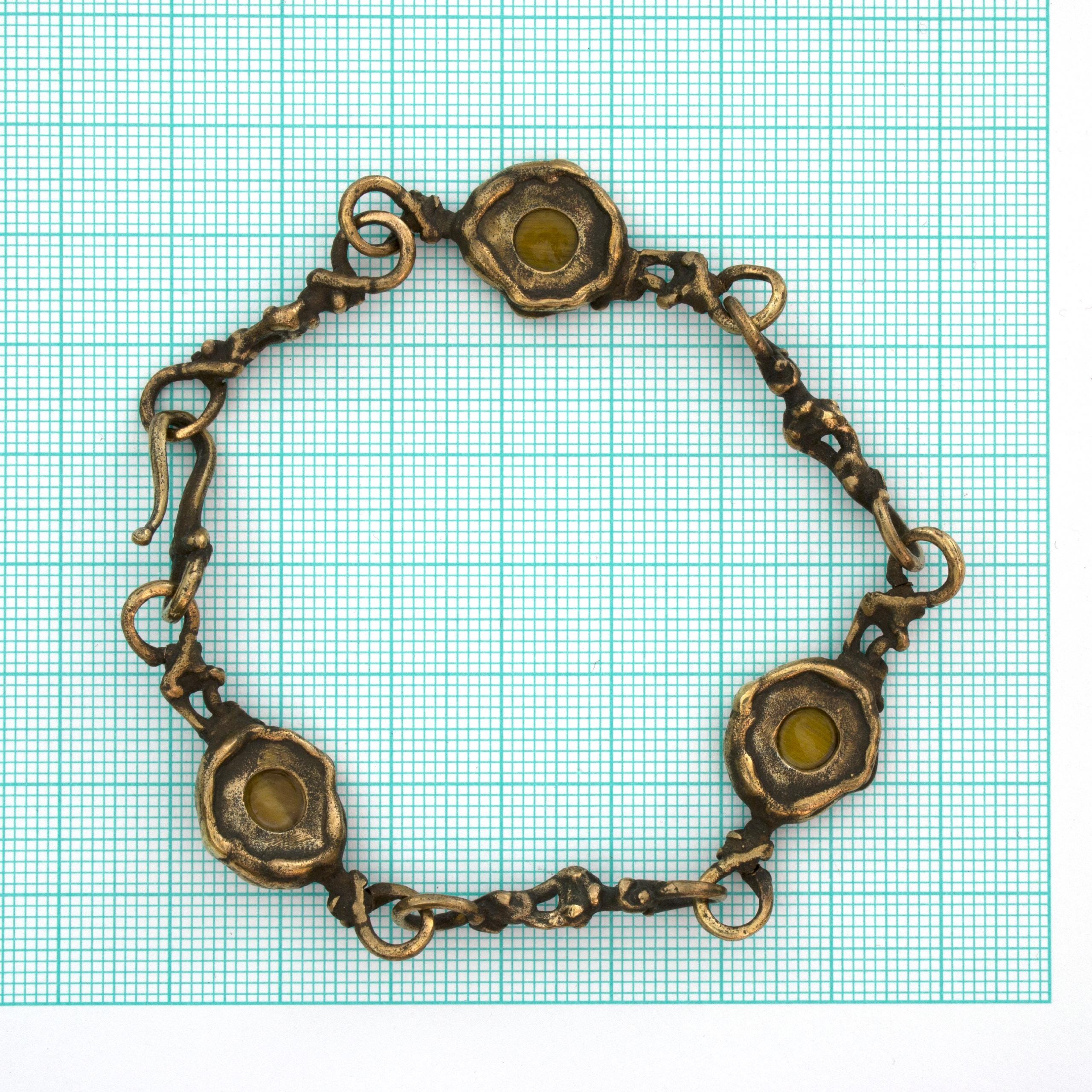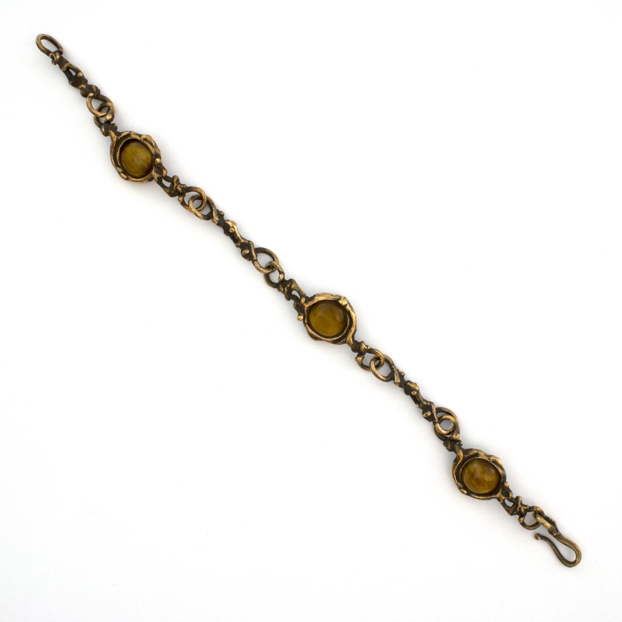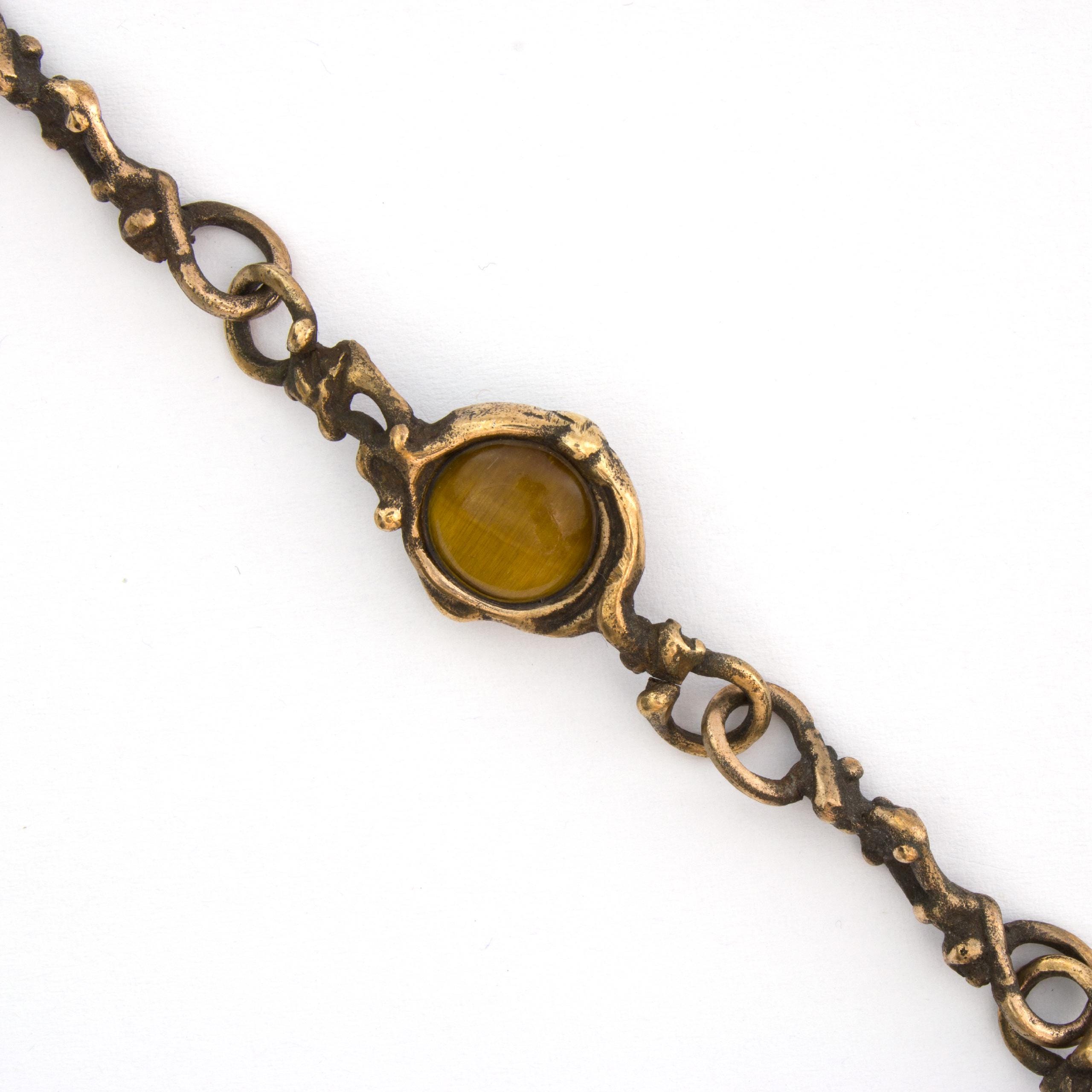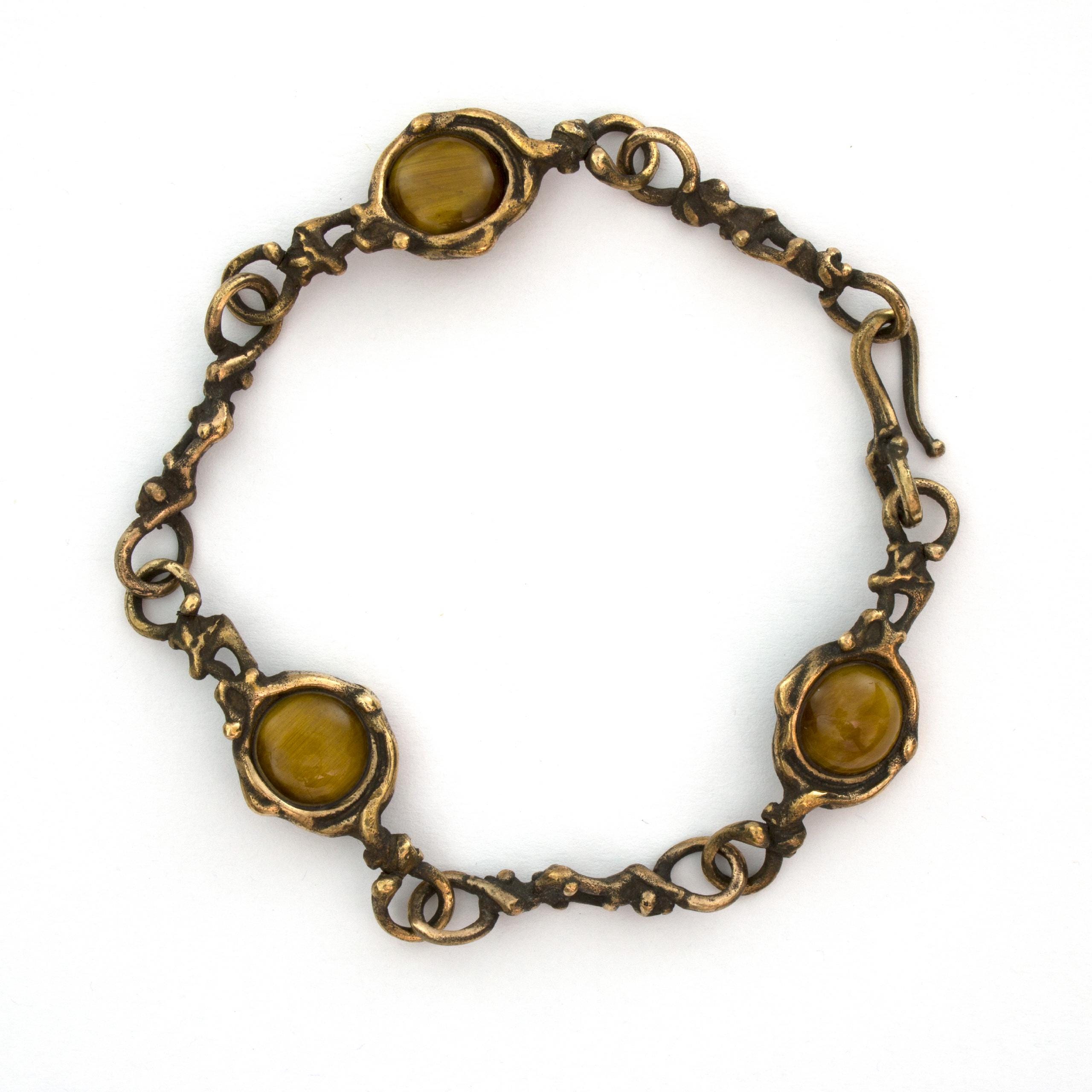 Bronzový náramek s tygřím okem od Vojtěšky Vlčkové Katalogové číslo: 162 Autorka: Vojtěška Vlčková Realizace: Jaromíra Pavlíková Lití na ztracený vosk, bronz, tygří oko Délka cca 21 cm