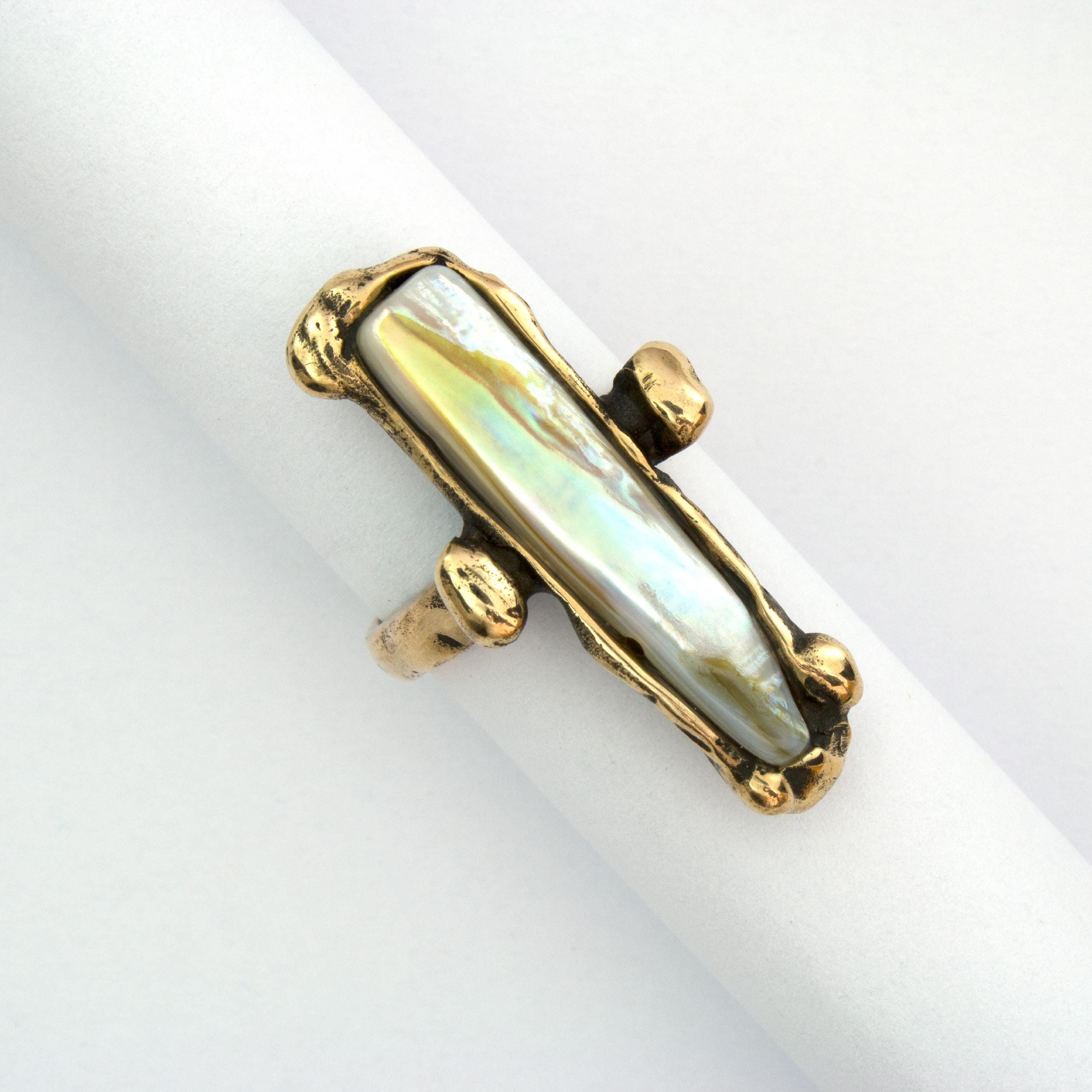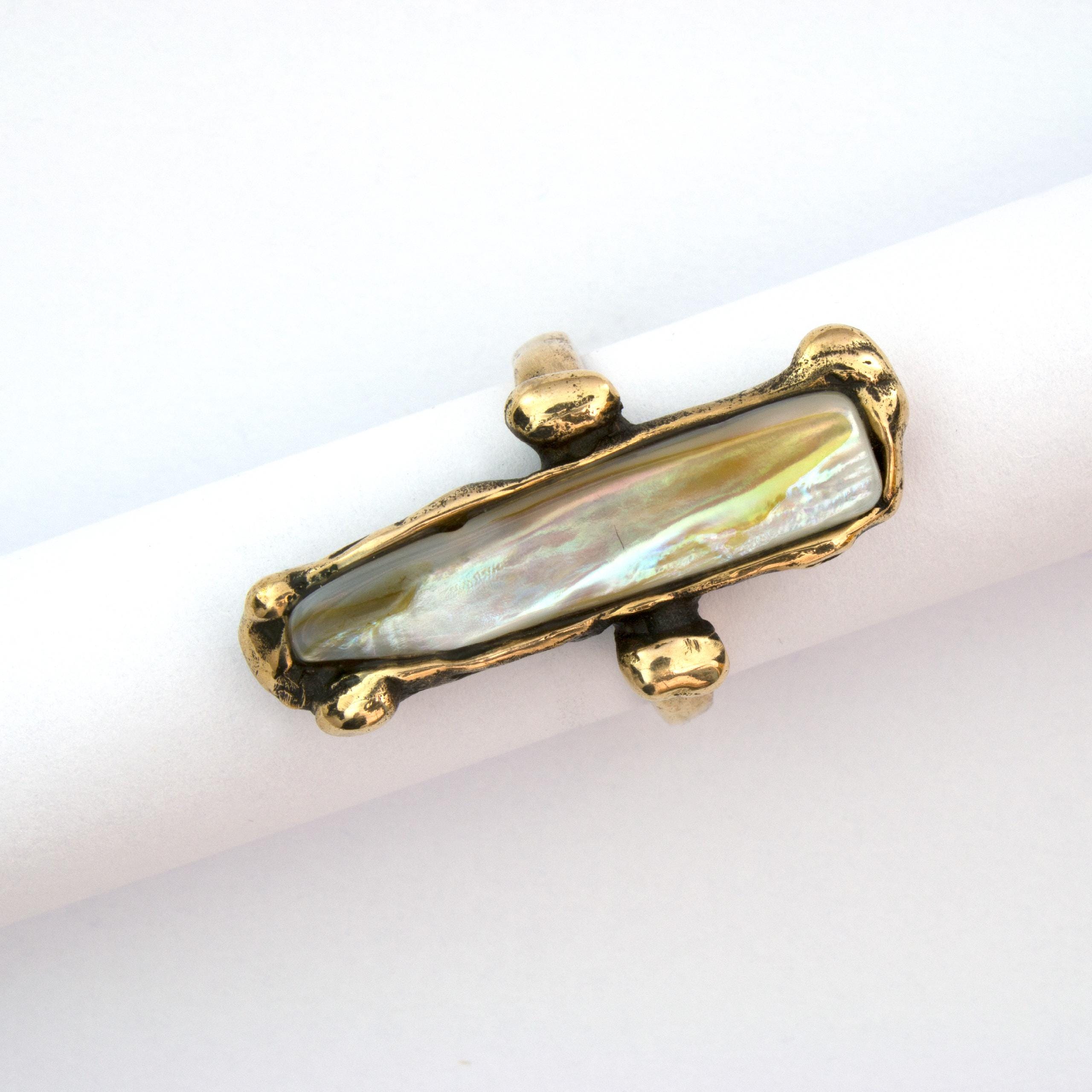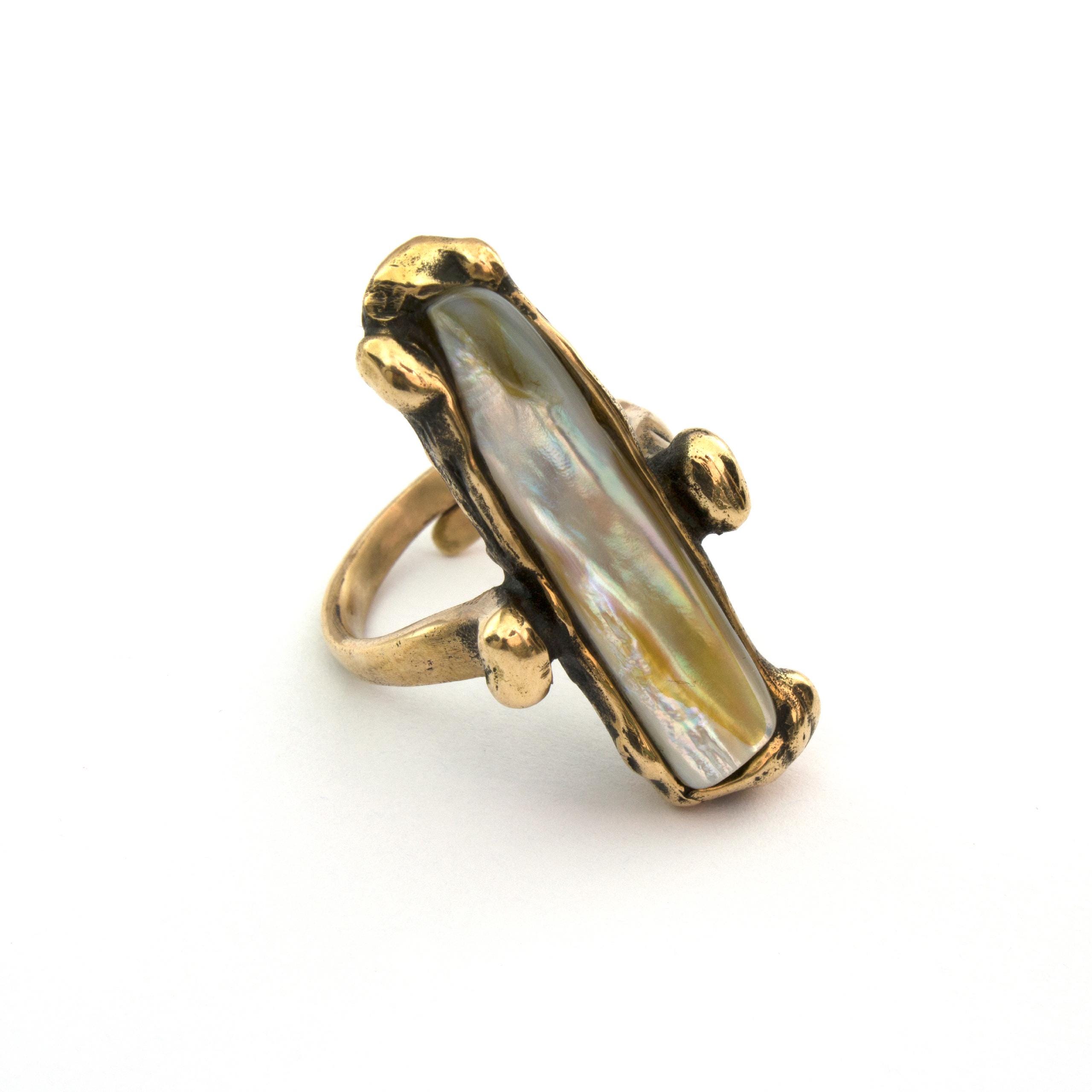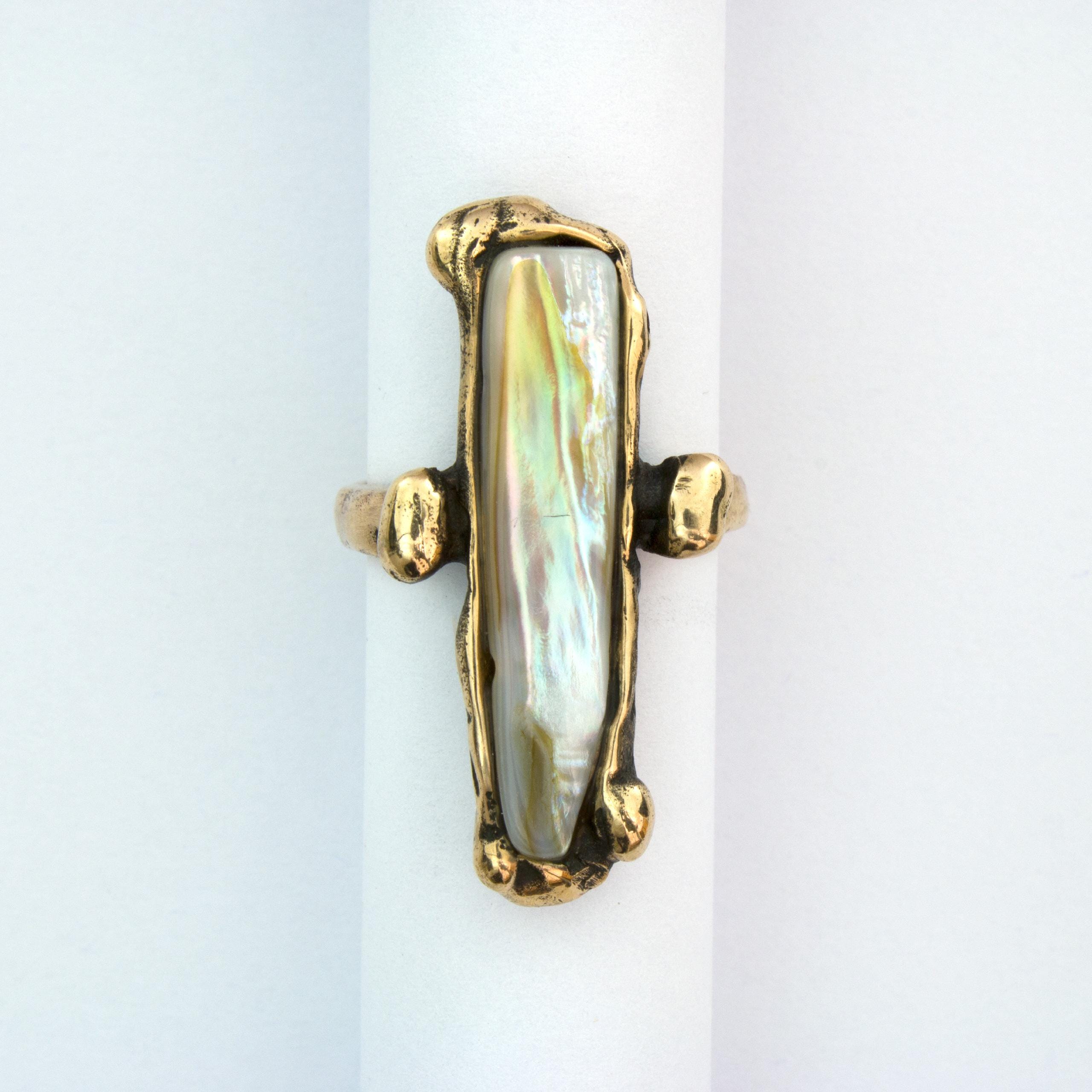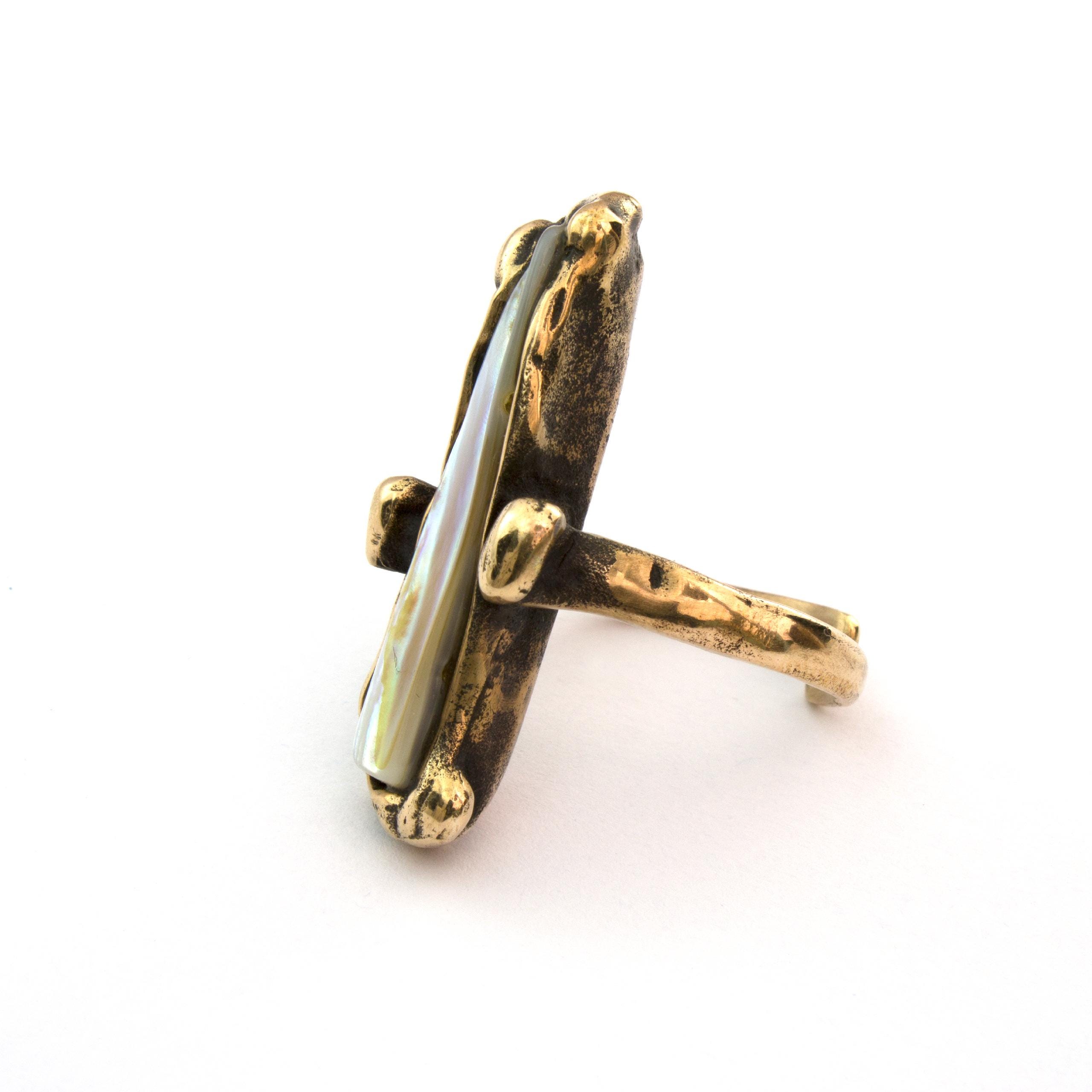 Bronzový prsten s perletí od Vojtěšky Vlčkové Katalogové číslo: 193 Autorka: Vojtěška Vlčková Realizace: Jaromíra Pavlíková Lití na ztracený vosk, bronz, perleť