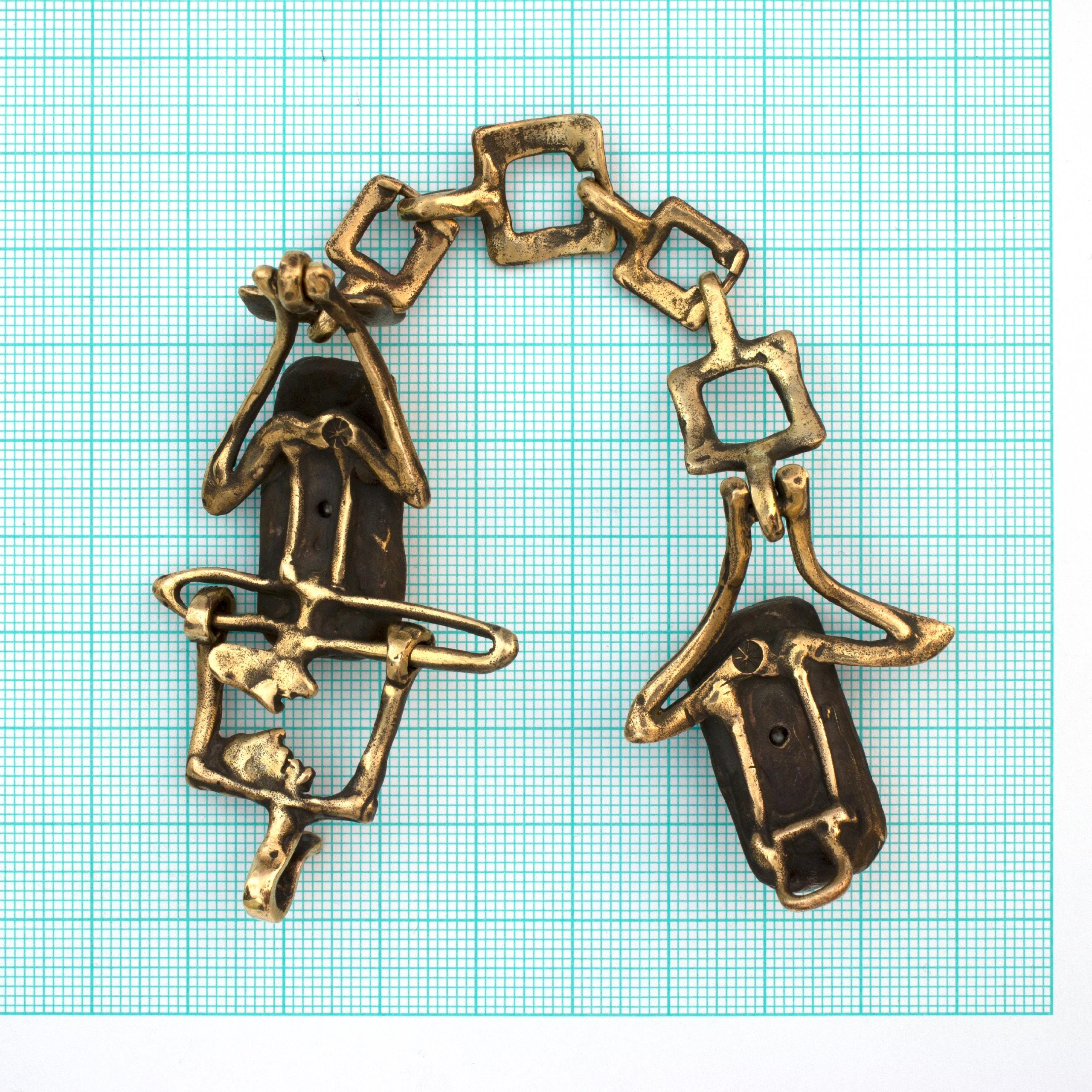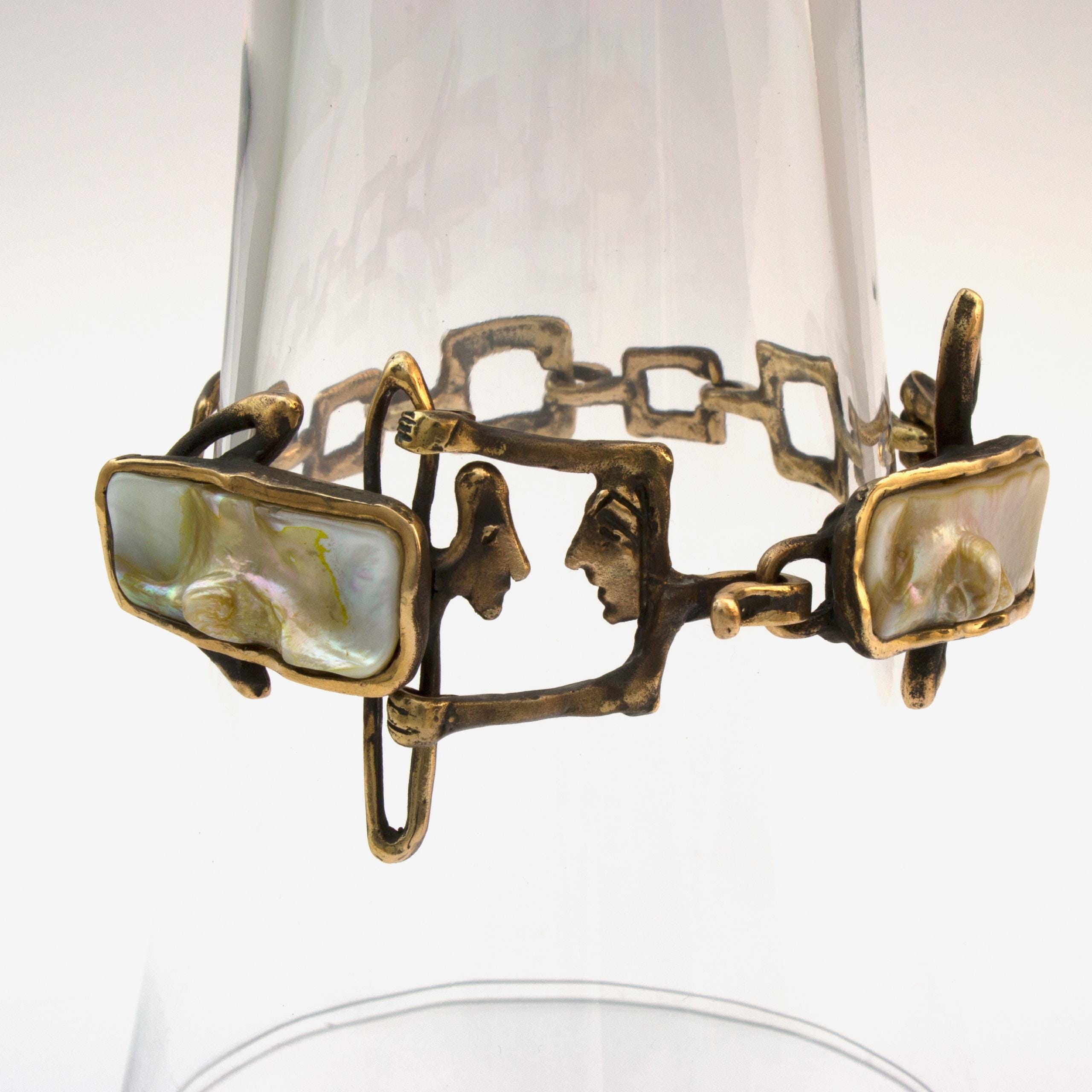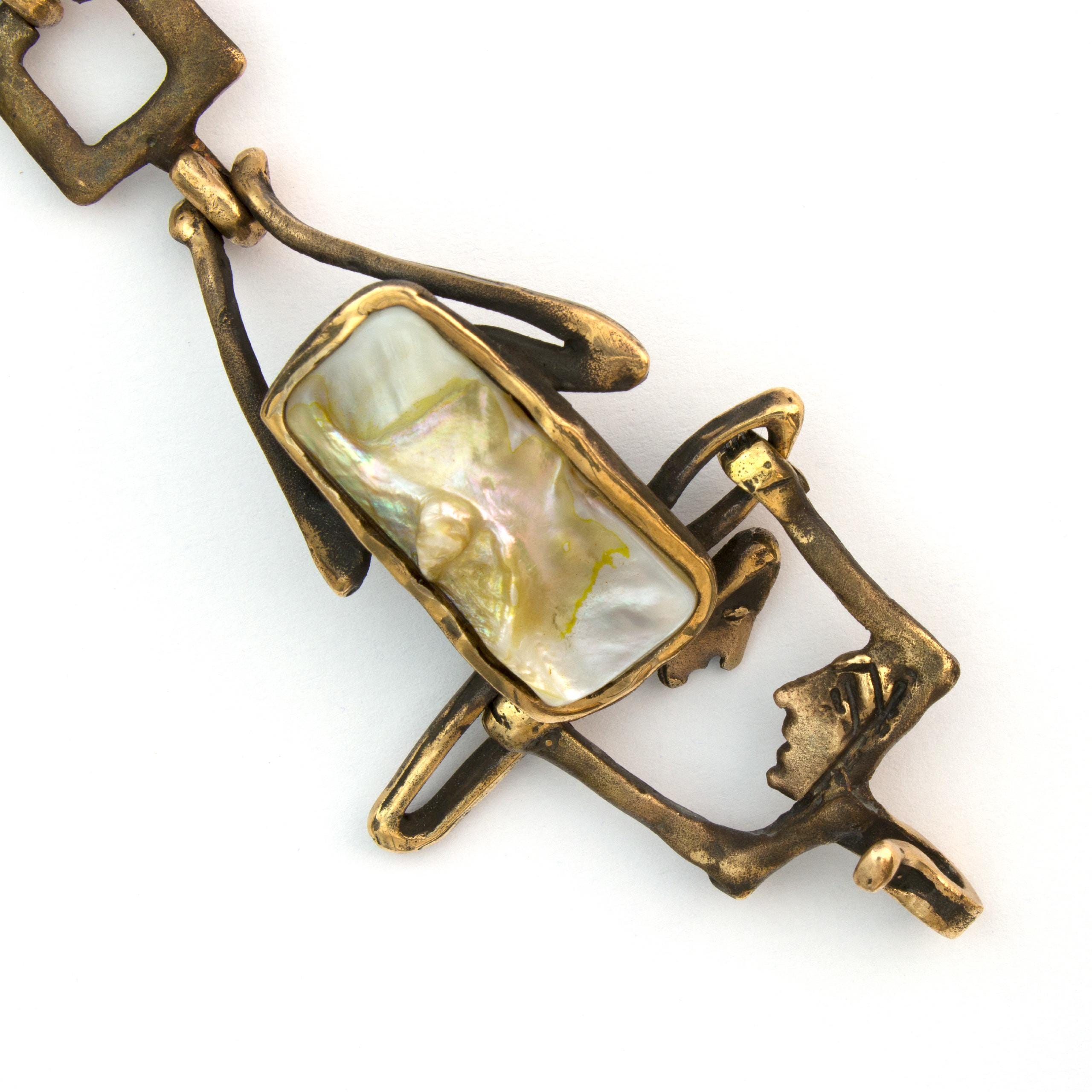 Náramek "Obojživelníci" od Vojtěšky Vlčkové (1948-2023) je autorský šperk vytvořený metodou lití na ztracený vosk. Toto umělecké dílo propojuje trvanlivost patinovaného bronzu s duhovým leskem perleti, vytvářející hru světla a stínů. Tento unikátní kus nese pečeť originálního výtvarného vyjádření, kde se přírodní materiály stávají součástí sochařské kompozice.