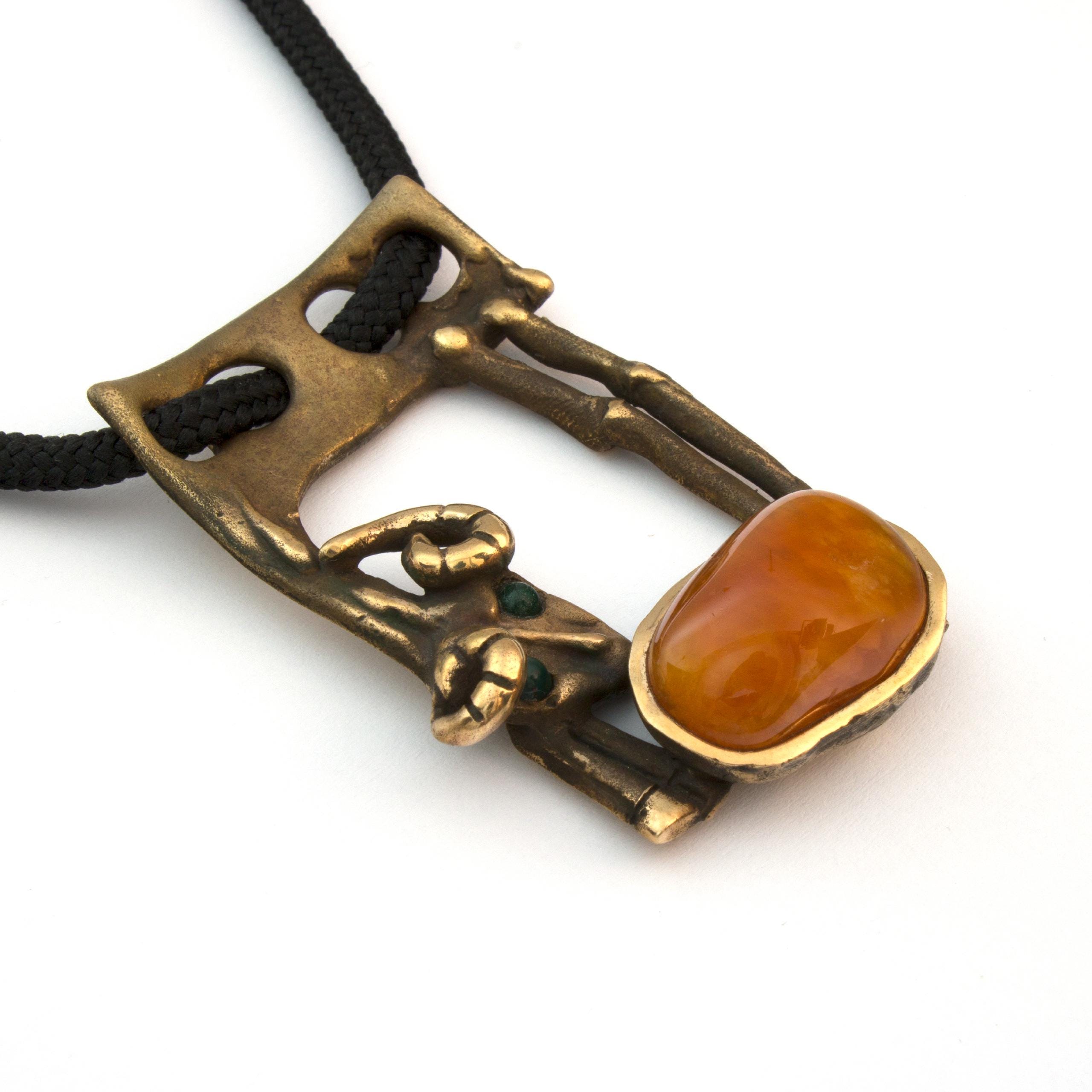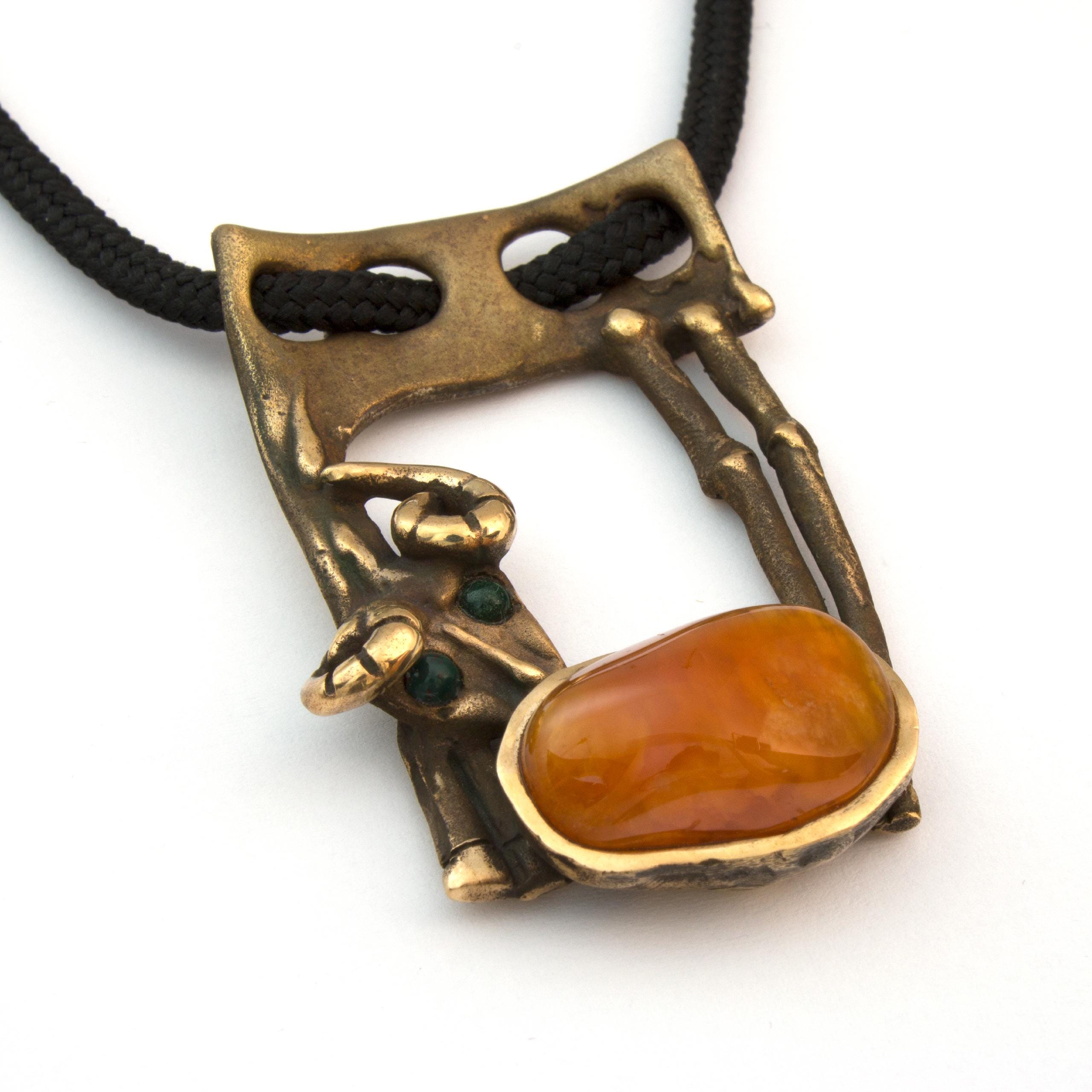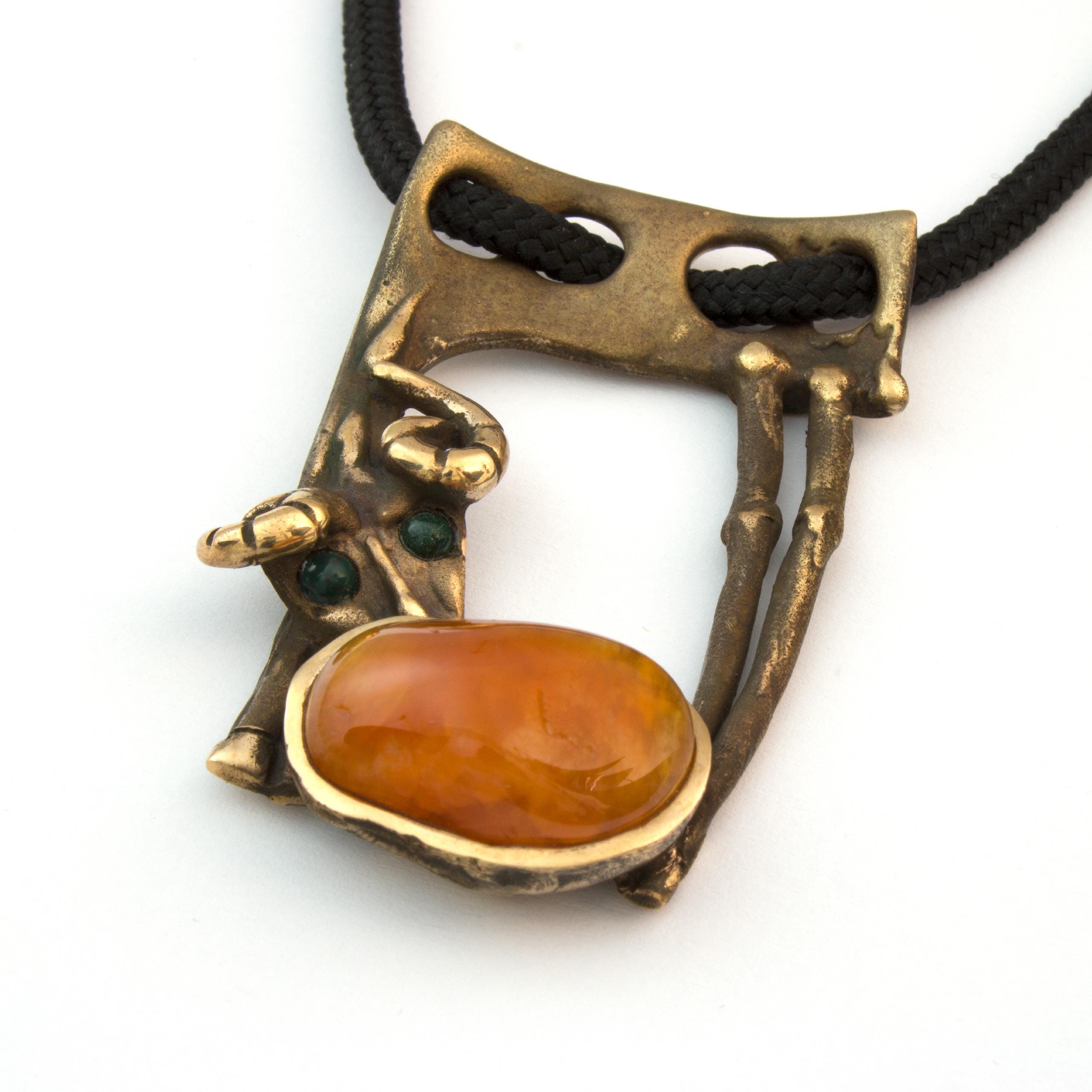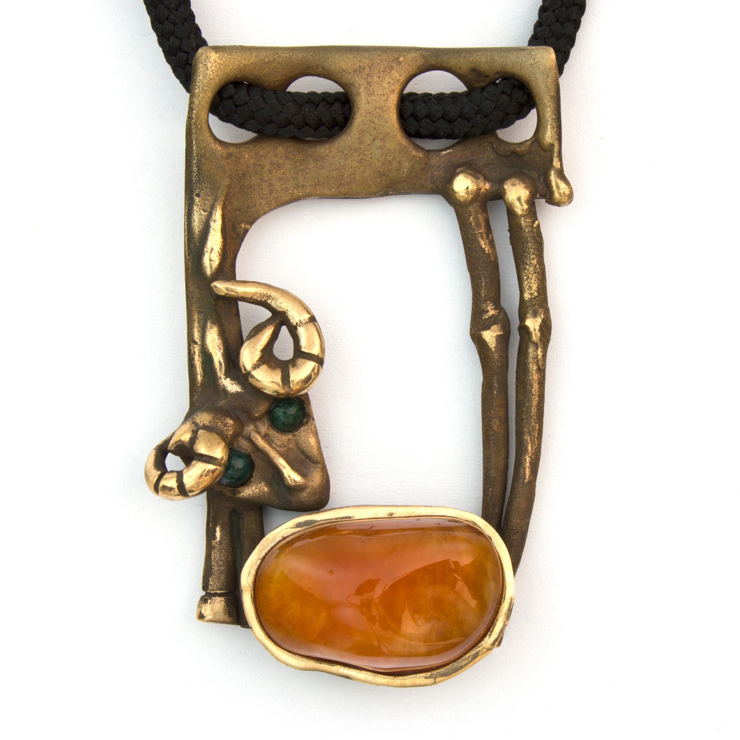Závěs "Beránek" od Vojtěšky Vlčkové (1948-2023) je autorský šperk vytvořený metodou lití na ztracený vosk. Toto umělecké dílo spojuje patinovaný bronz s teplým odstínem karneolu v kompozici, která odráží autorčin jedinečný sochařský přístup. Šperk nese pečeť originálního uměleckého rukopisu, kde se tradiční řemeslo setkává s moderním výtvarným cítěním.
