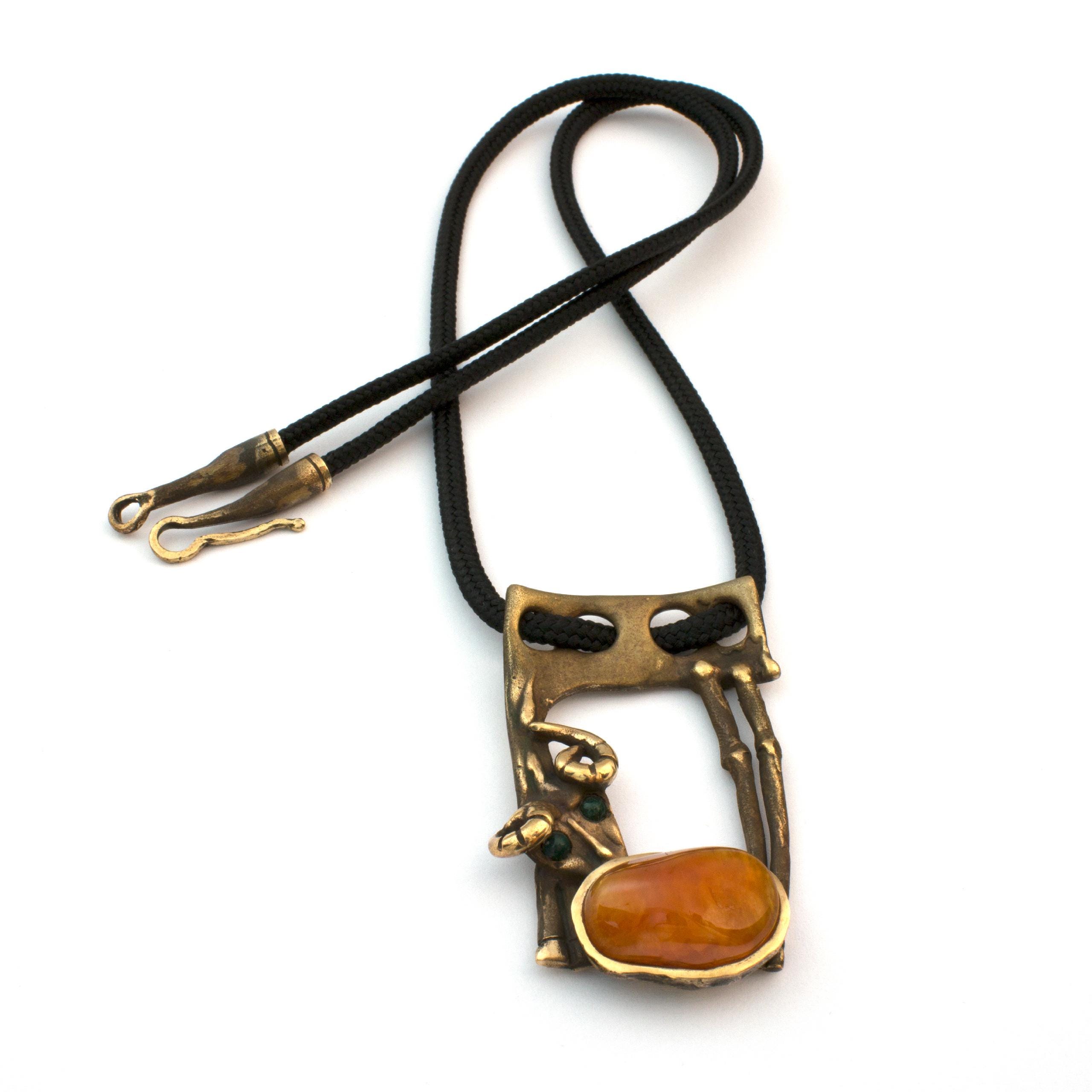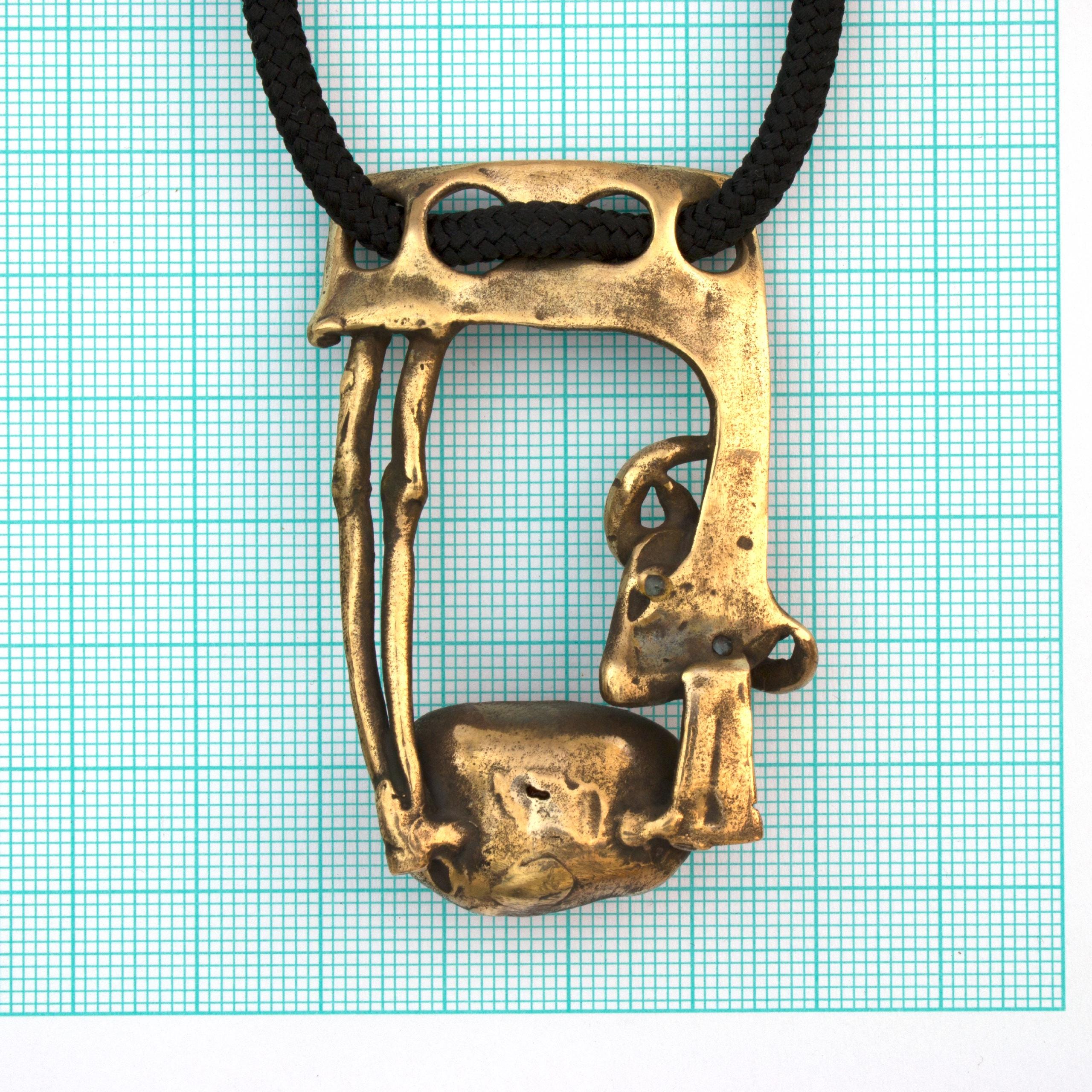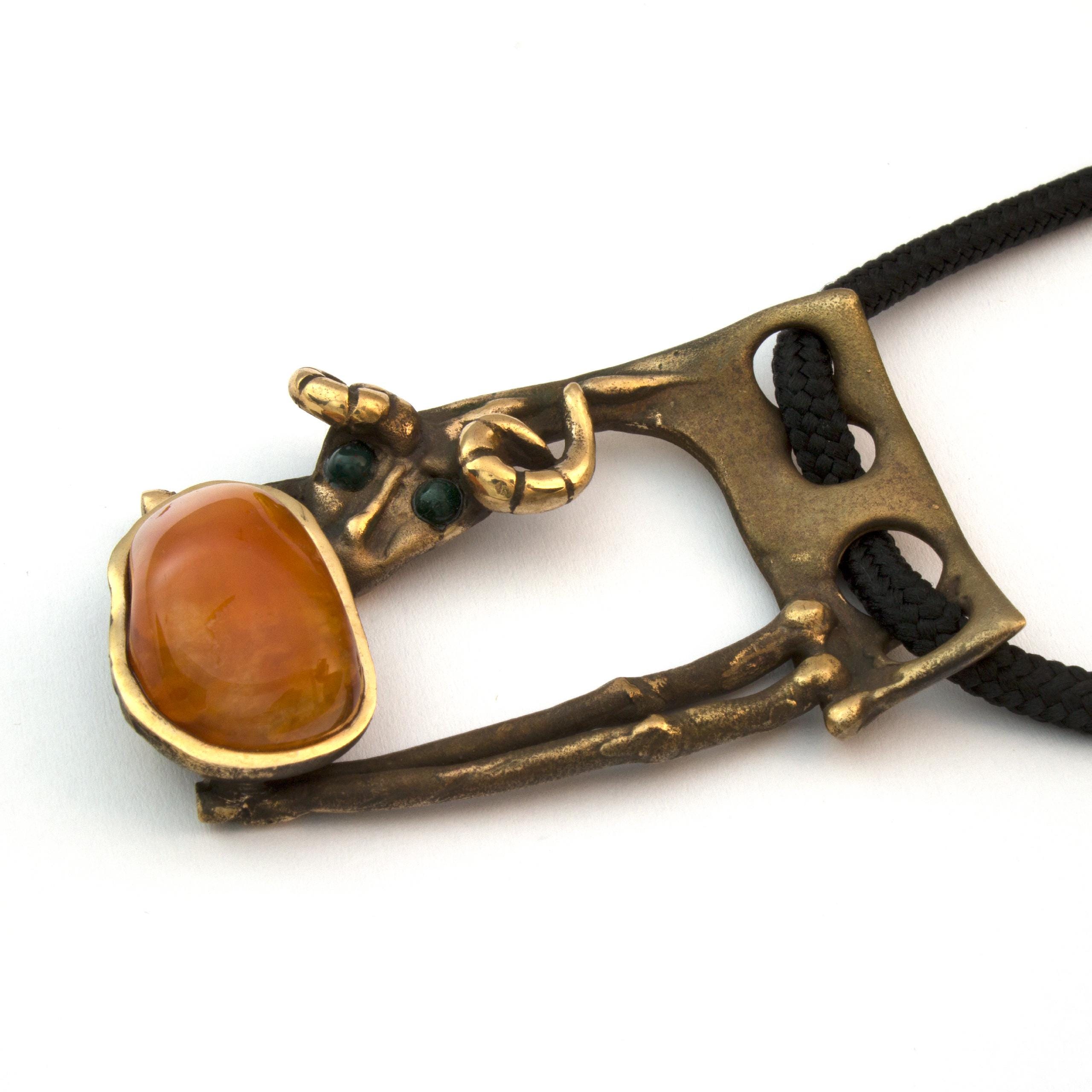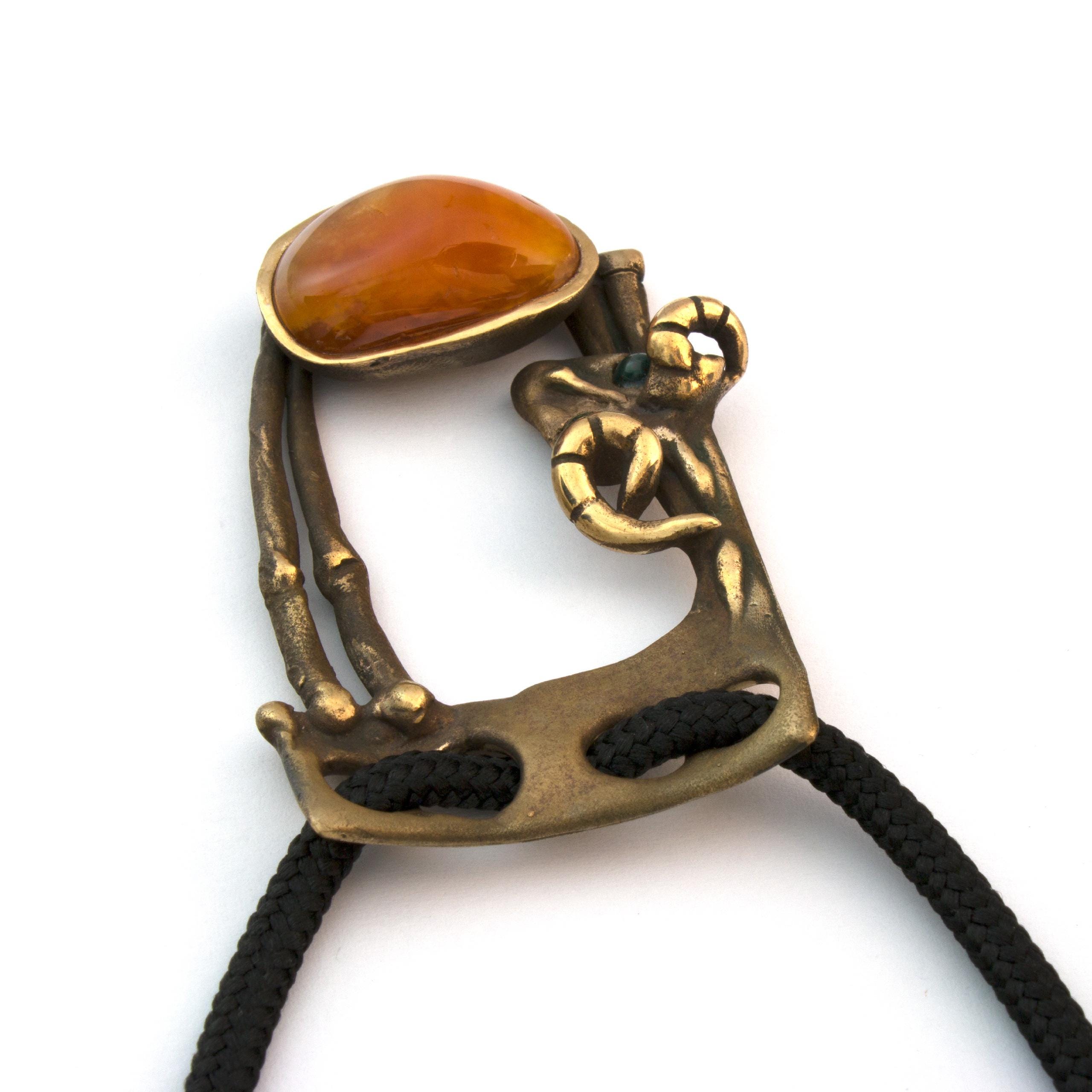 Závěs "Beránek" od Vojtěšky Vlčkové (1948-2023) je autorský šperk vytvořený metodou lití na ztracený vosk. Toto umělecké dílo spojuje patinovaný bronz s teplým odstínem karneolu v kompozici, která odráží autorčin jedinečný sochařský přístup. Šperk nese pečeť originálního uměleckého rukopisu, kde se tradiční řemeslo setkává s moderním výtvarným cítěním.