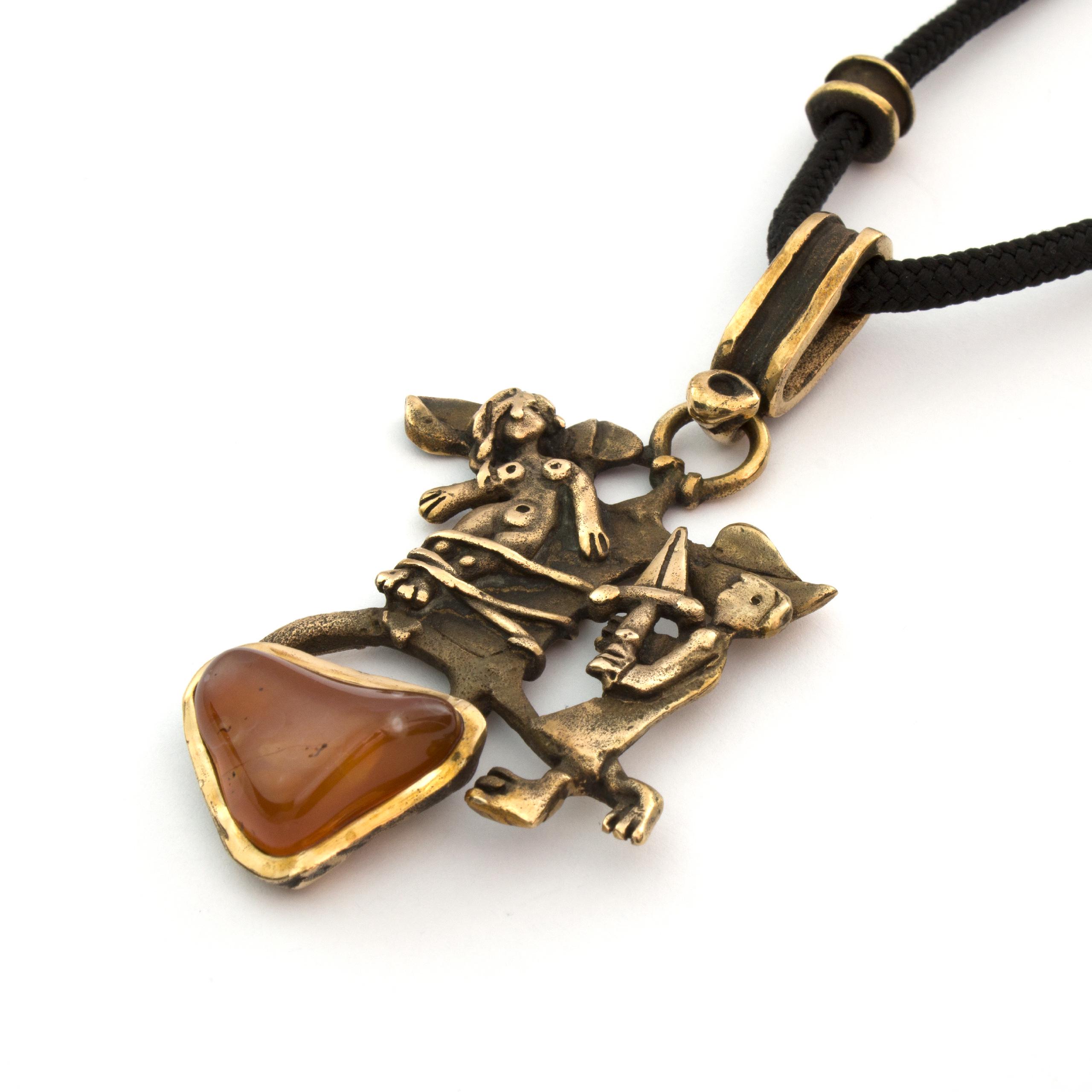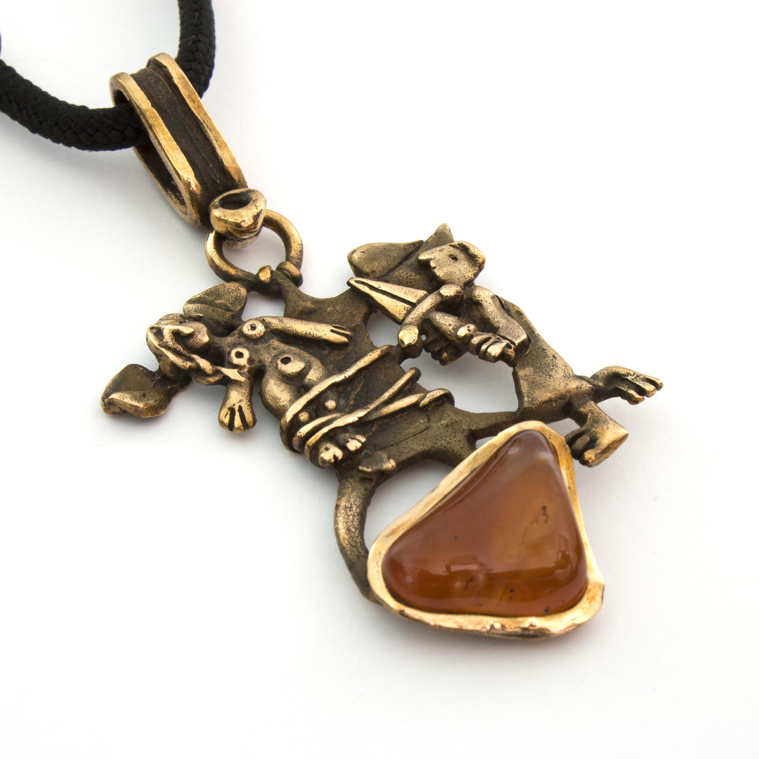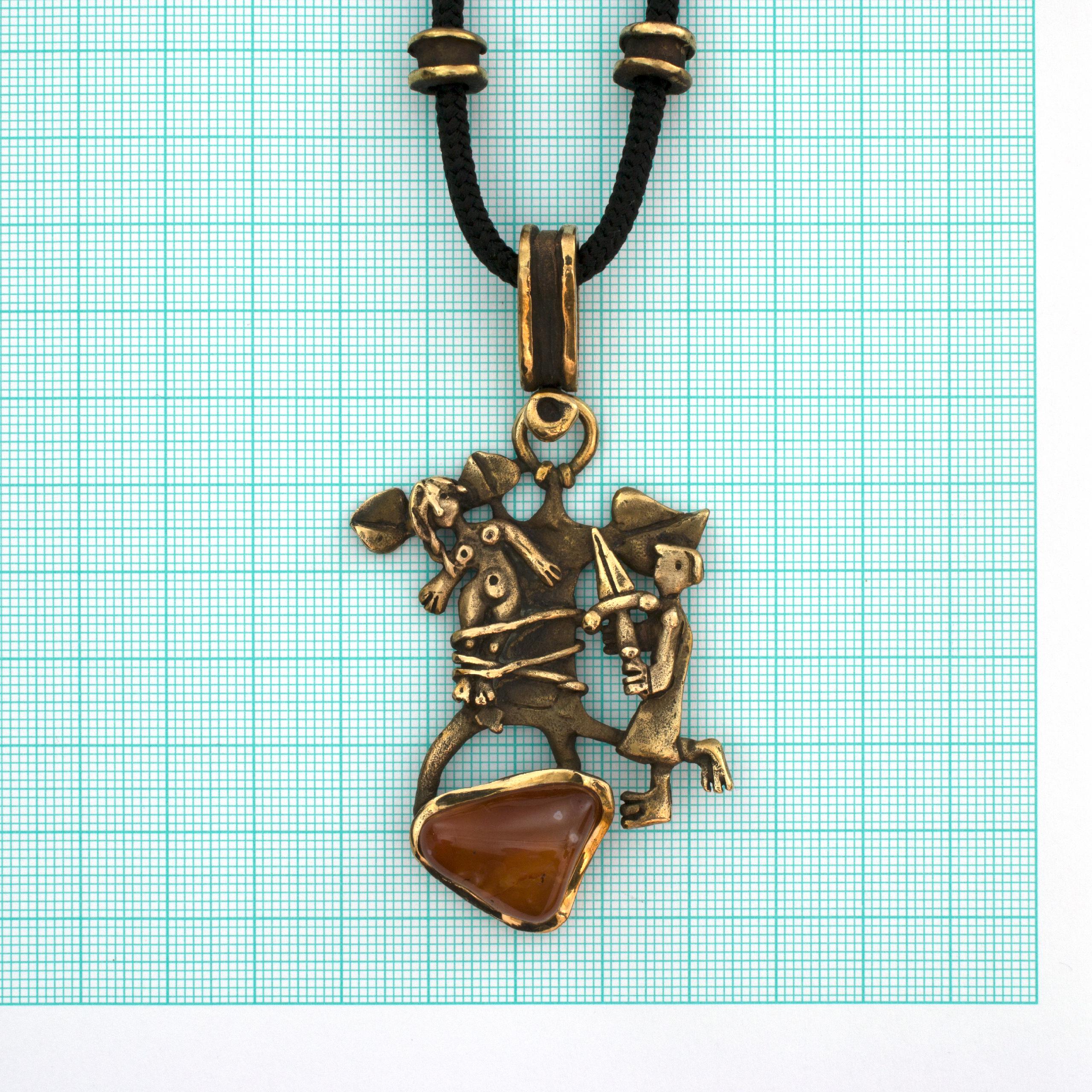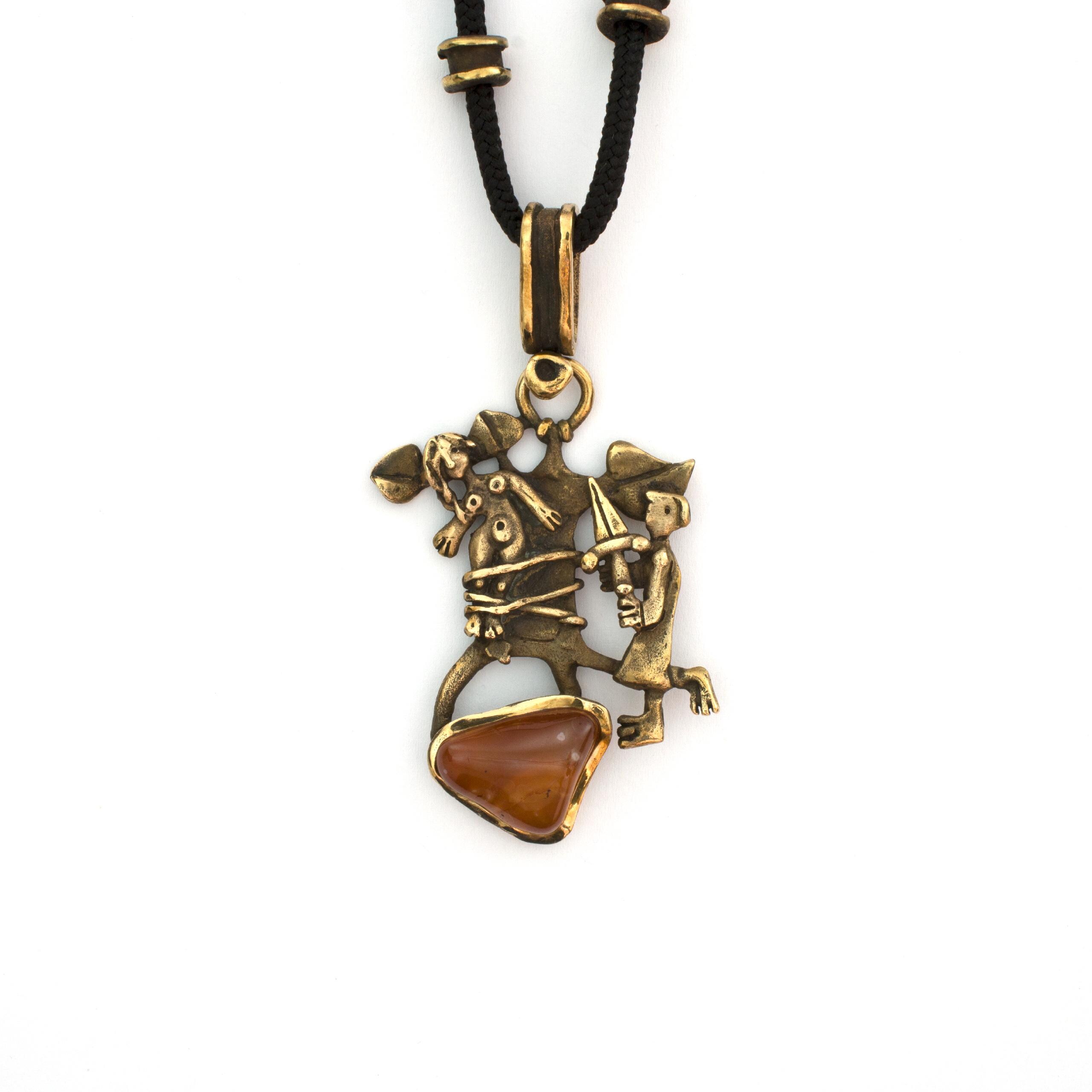 Bronzový závěs s karneolem od Vojtěšky Vlčkové Katalogové číslo: 207 Autorka: Vojtěška Vlčková Realizace: Jaromíra Pavlíková Lití na ztracený vosk, bronz, karneol Délka cca 67 cm