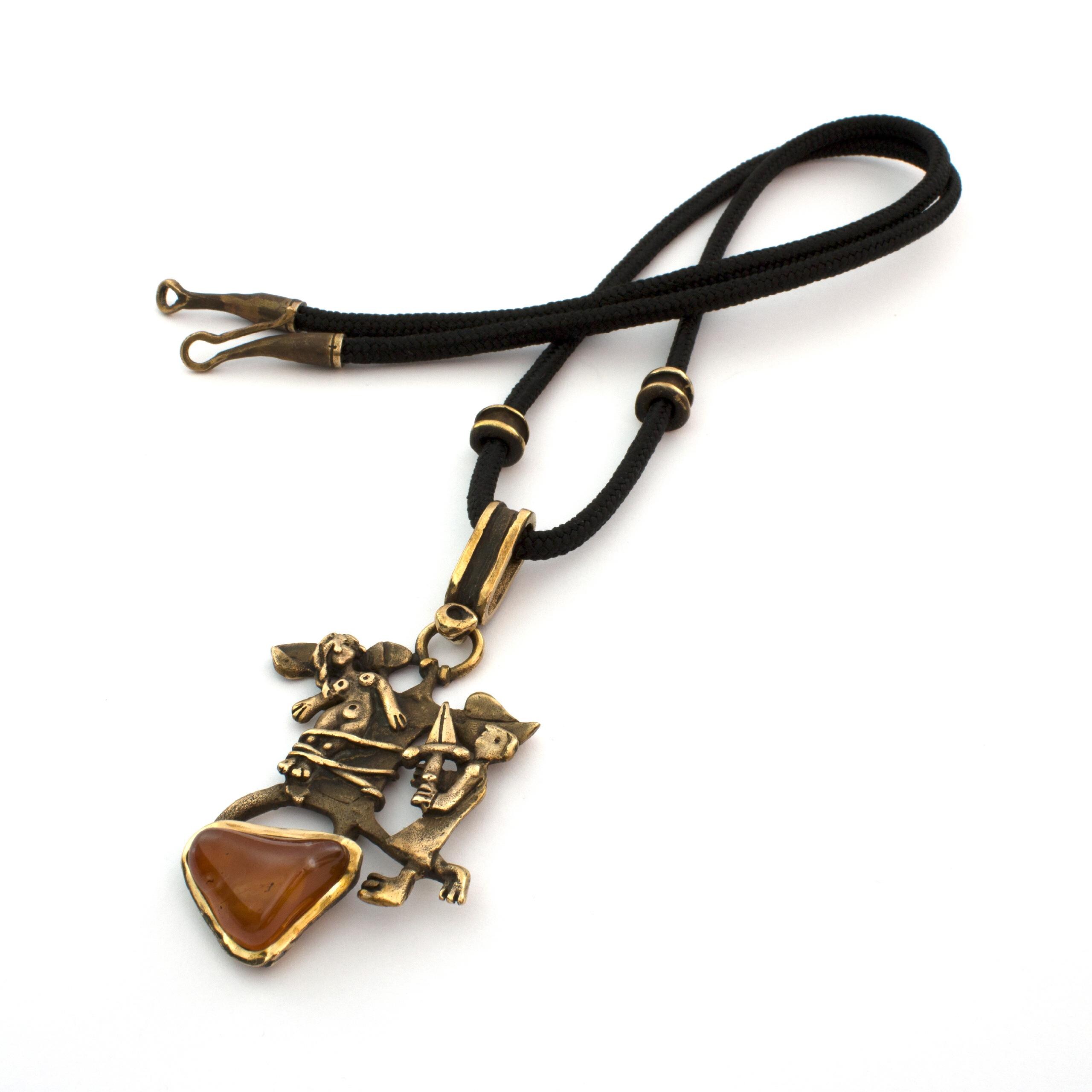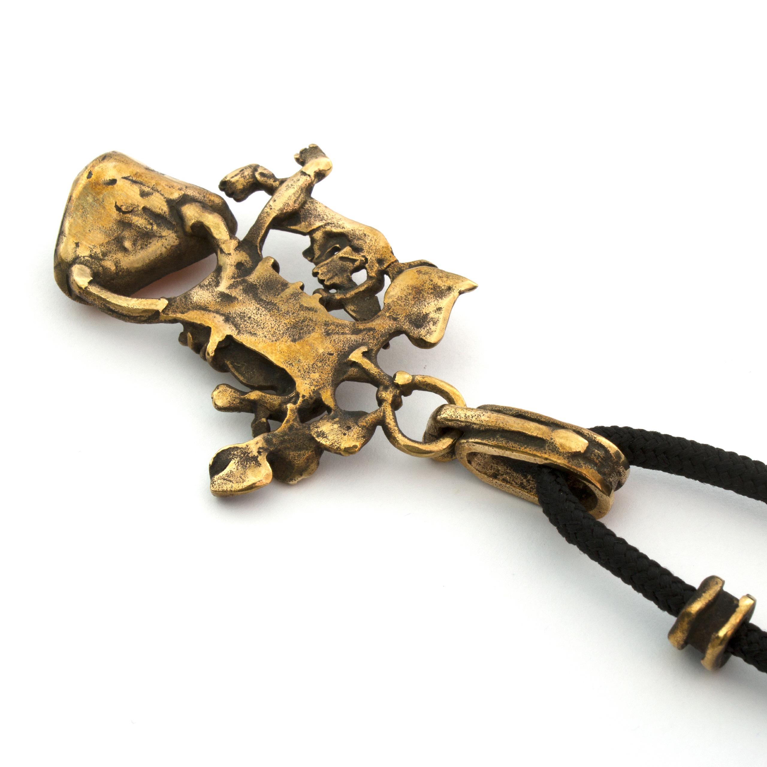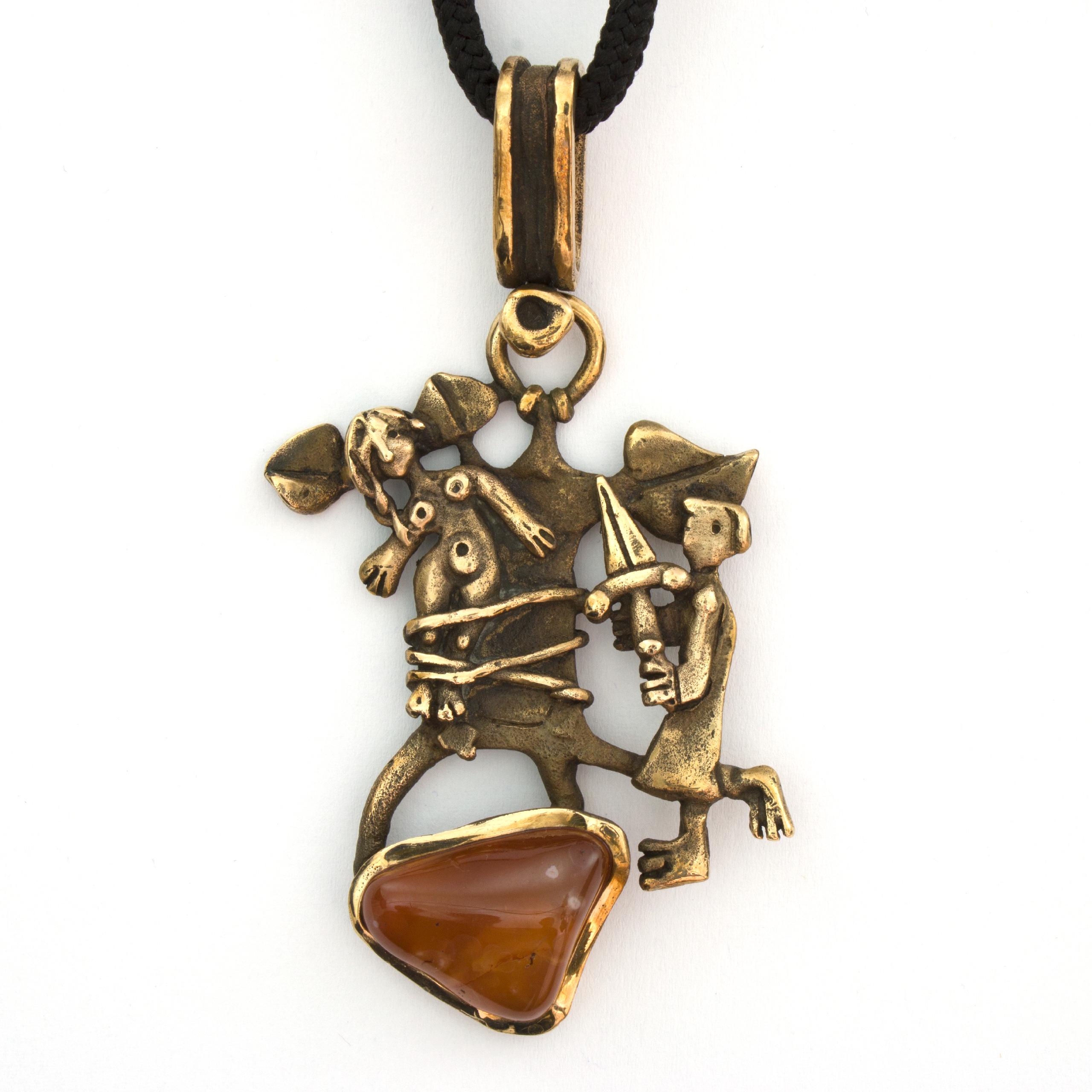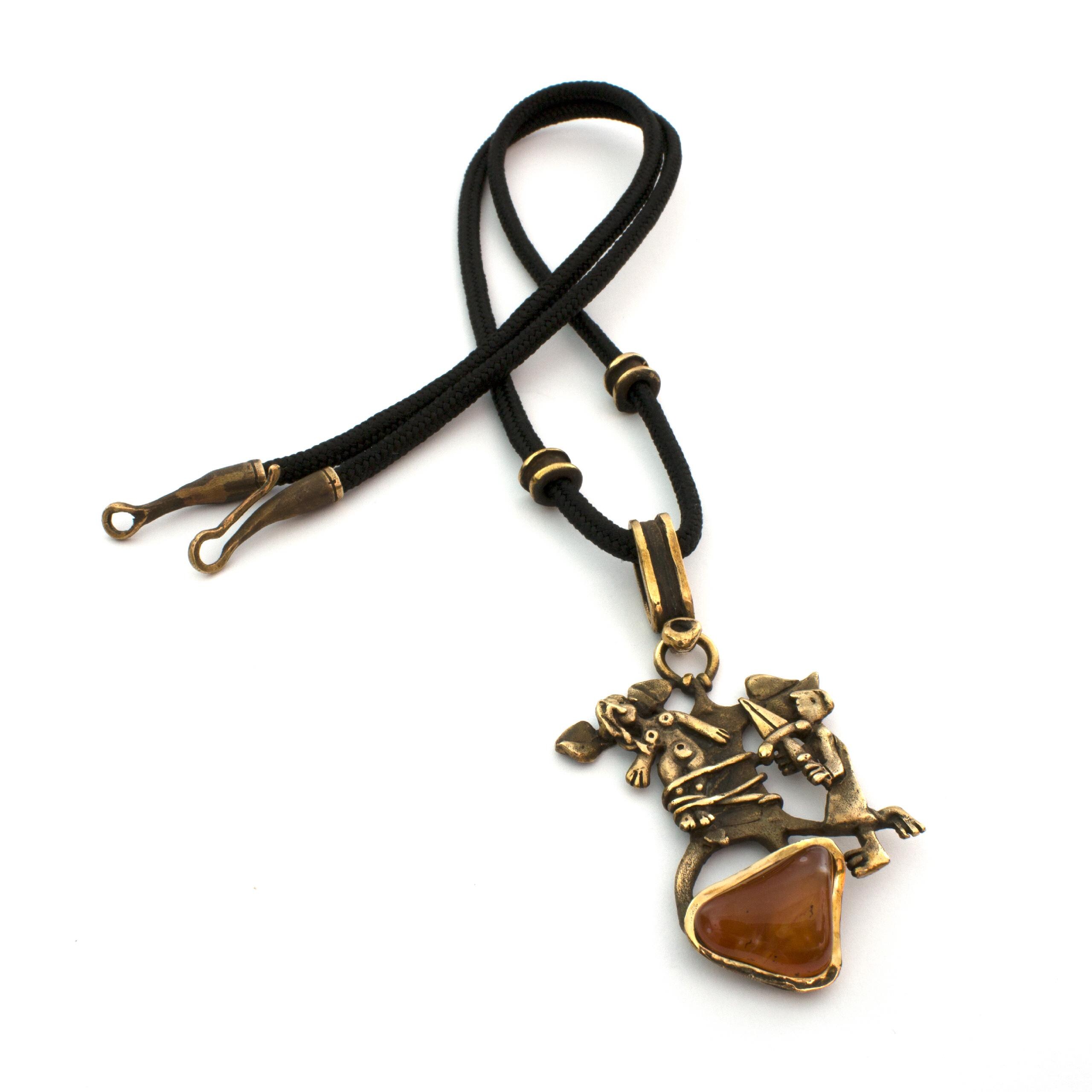 Bronzový závěs s karneolem od Vojtěšky Vlčkové Katalogové číslo: 207 Autorka: Vojtěška Vlčková Realizace: Jaromíra Pavlíková Lití na ztracený vosk, bronz, karneol Délka cca 67 cm