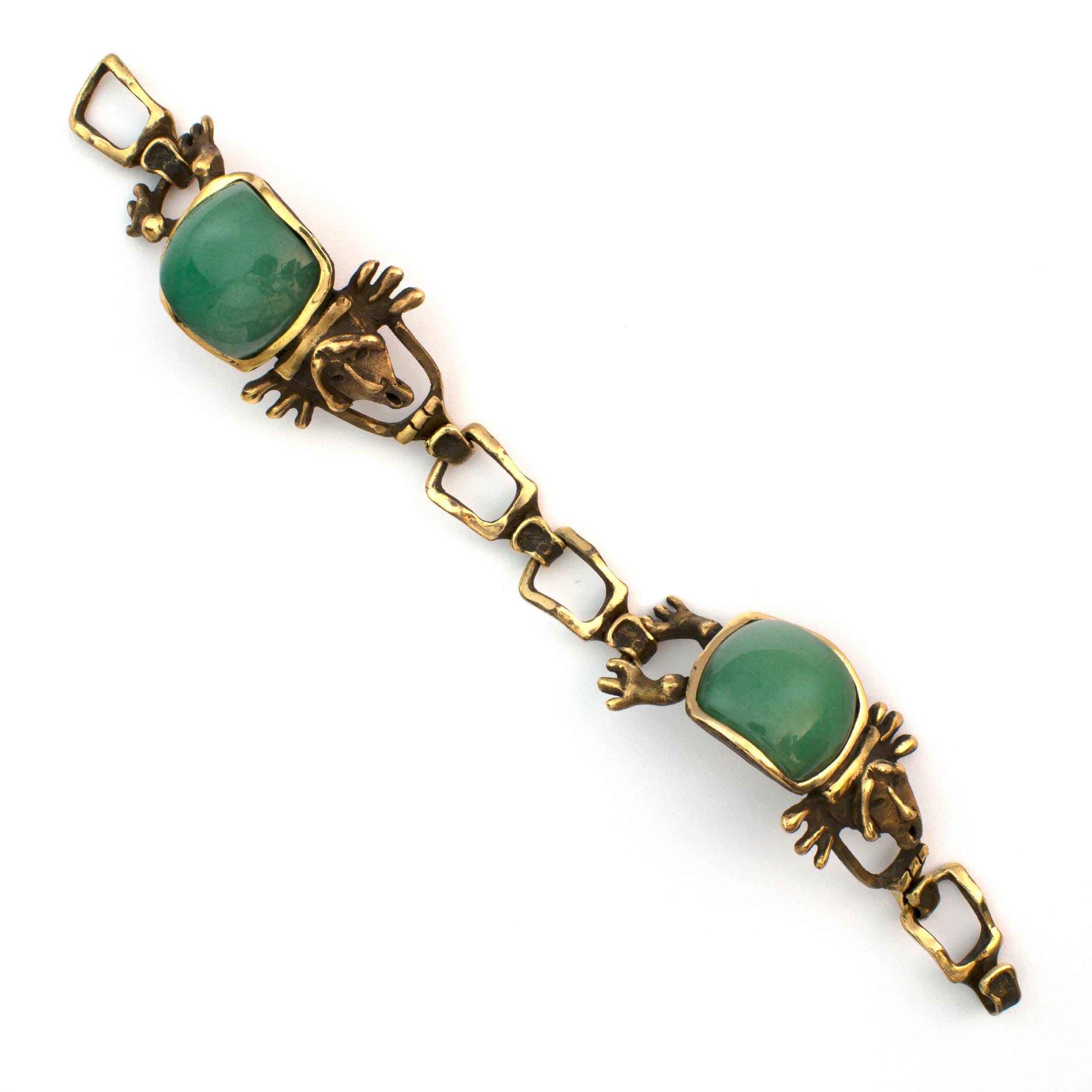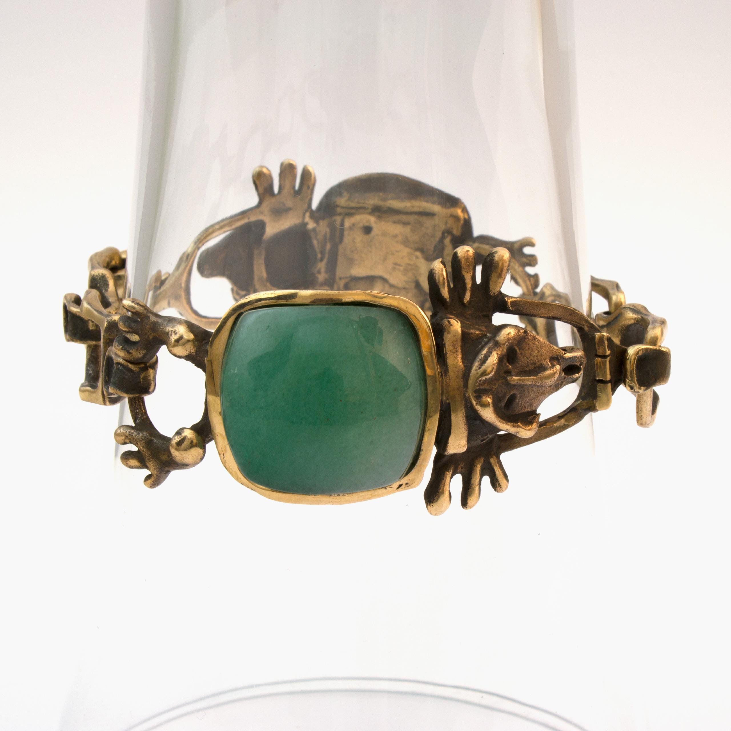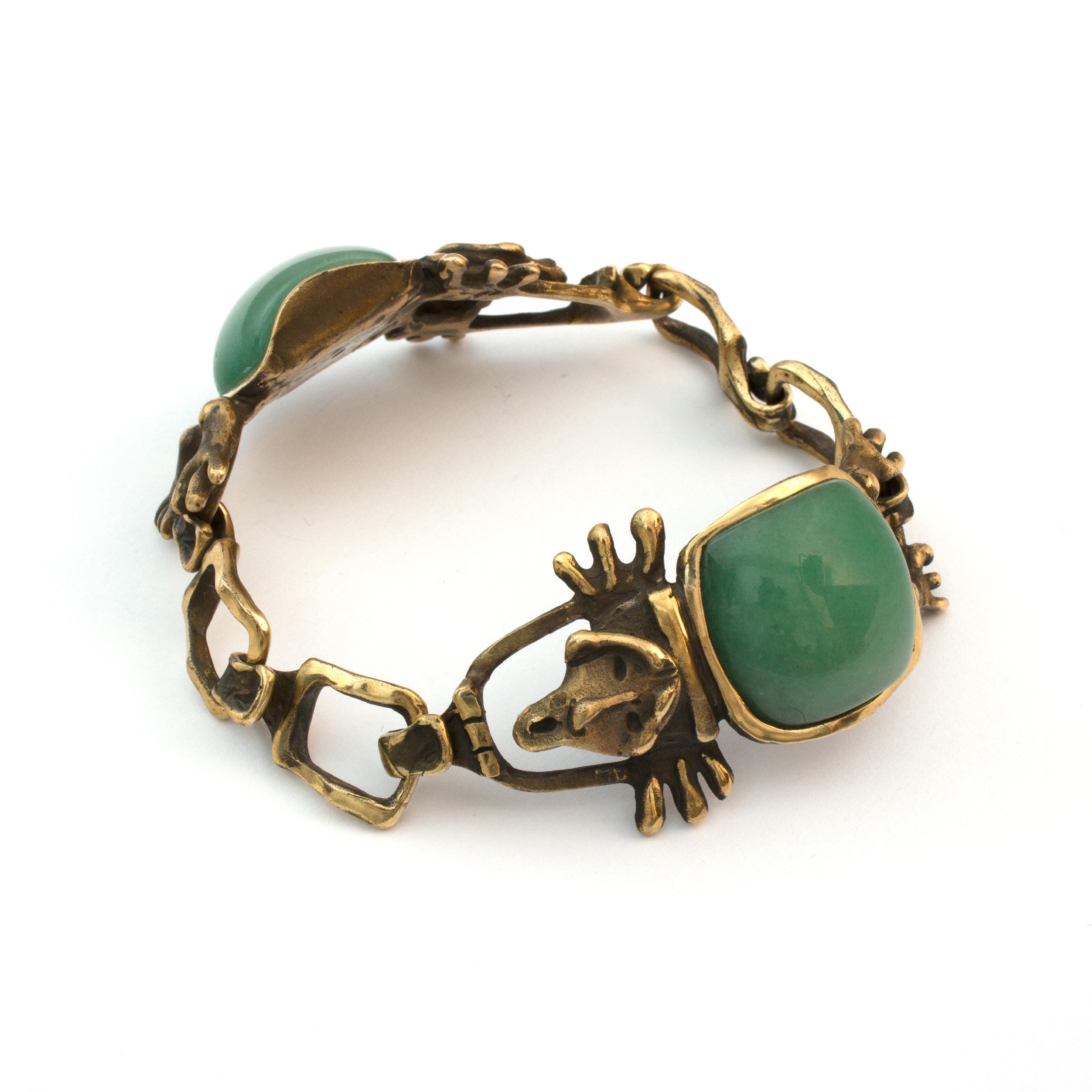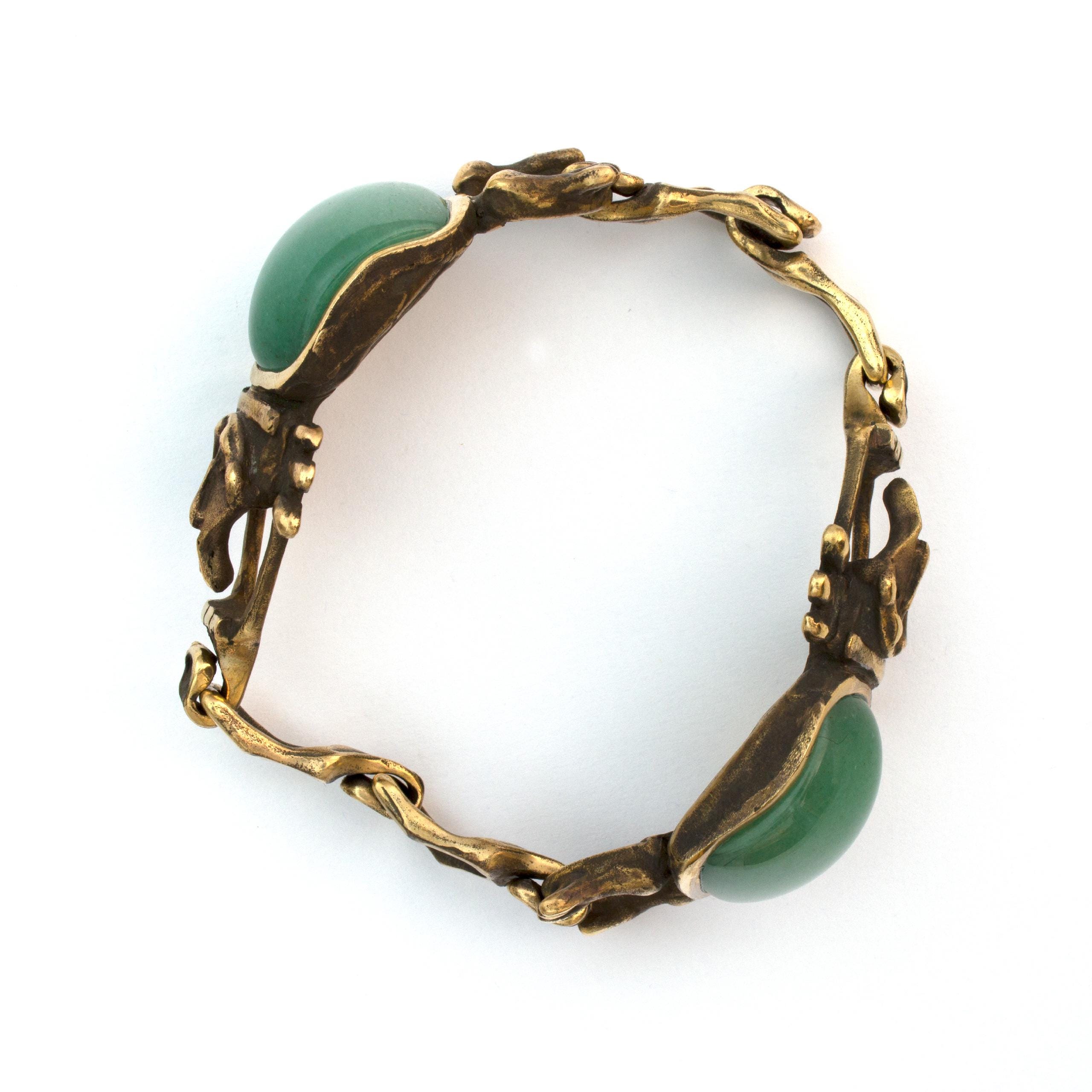 Náramek "Hlavonožec" od Vojtěšky Vlčkové (1948-2023) představuje sochařský přístup ke šperku. Dílo zhotovené technikou lití na ztracený vosk spojuje patinovaný bronz s jadeitem v působivé kompozici. Tento výjimečný kus dokládá dokonalé propojení uměleckého cítění a řemeslné preciznosti, charakteristické pro tvorbu Vojtěšky Vlčkové.