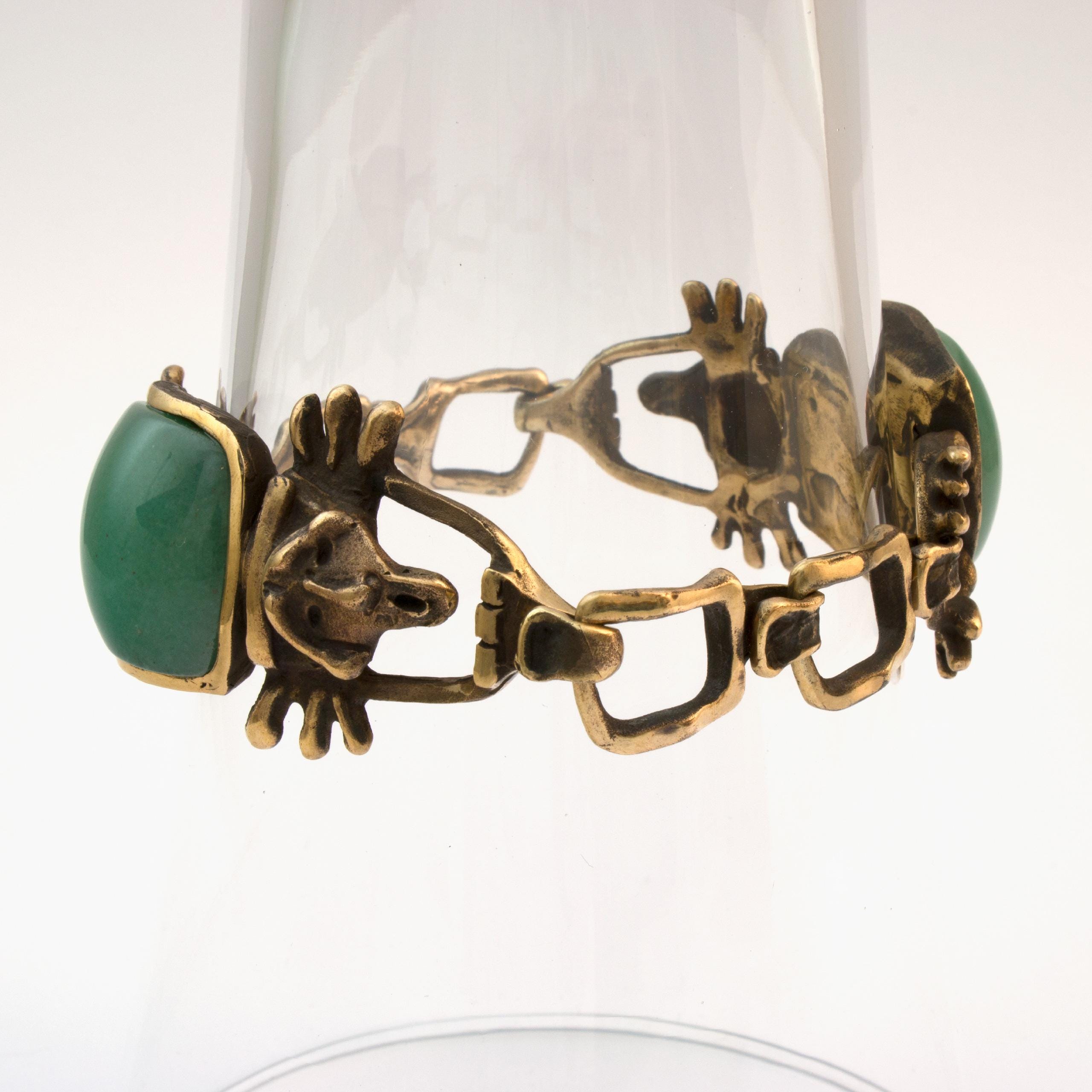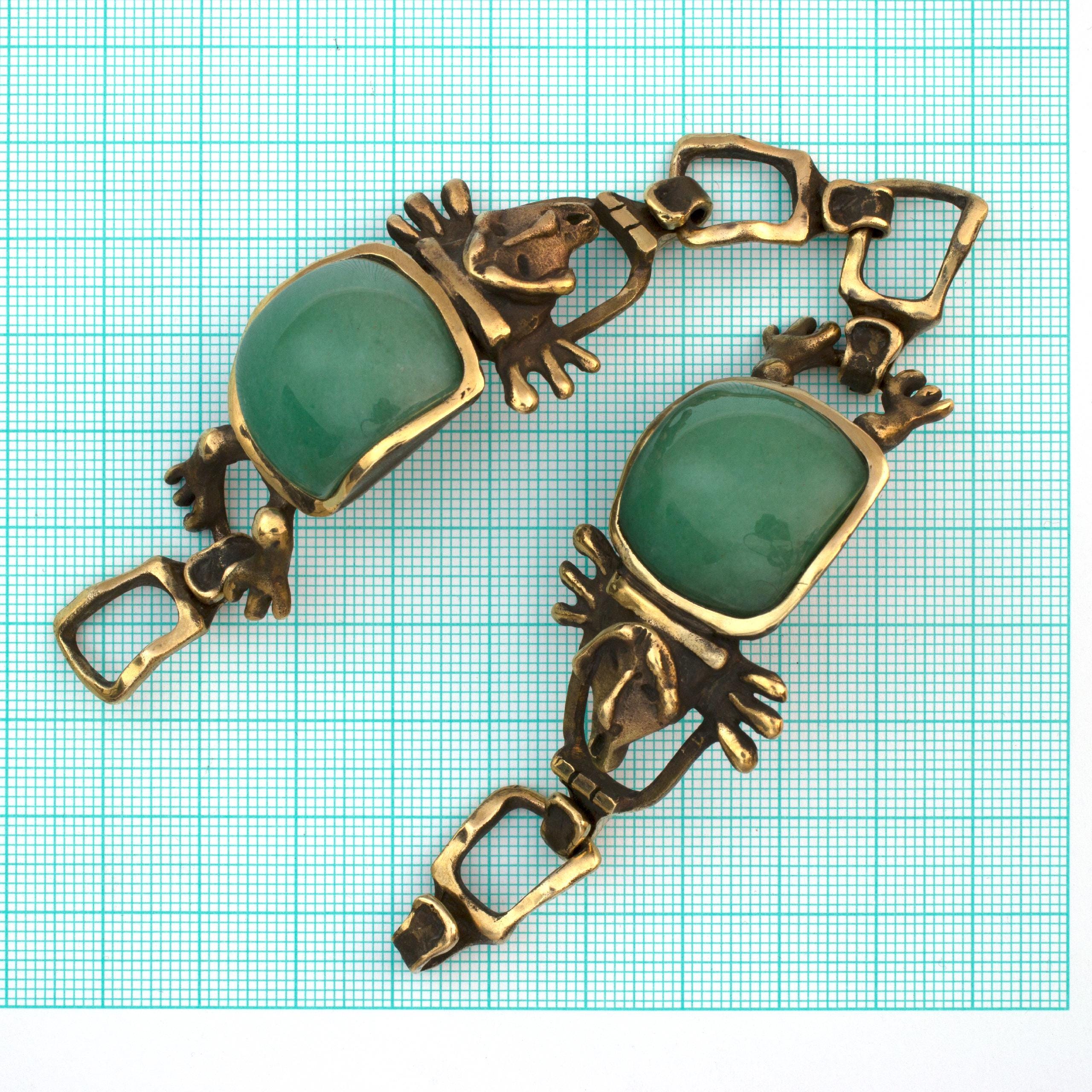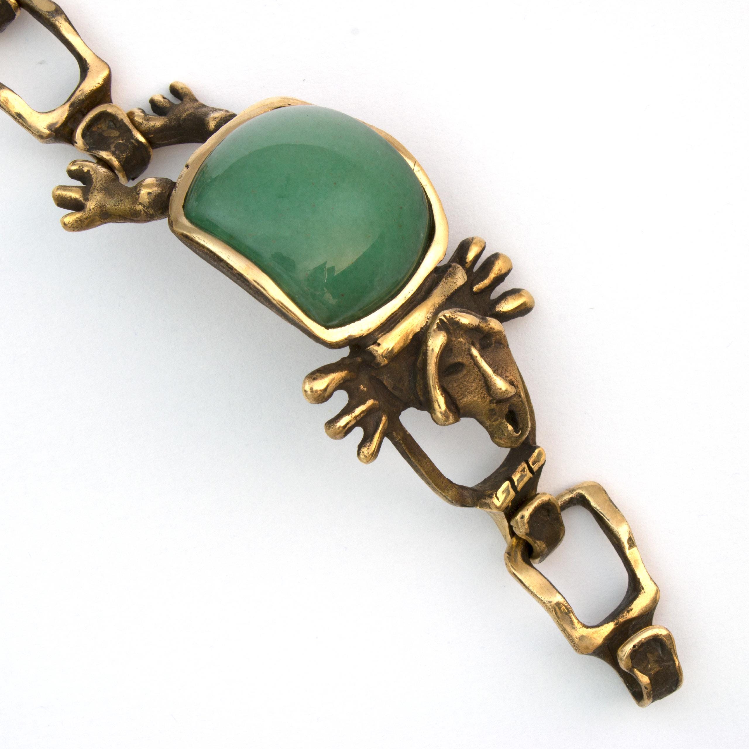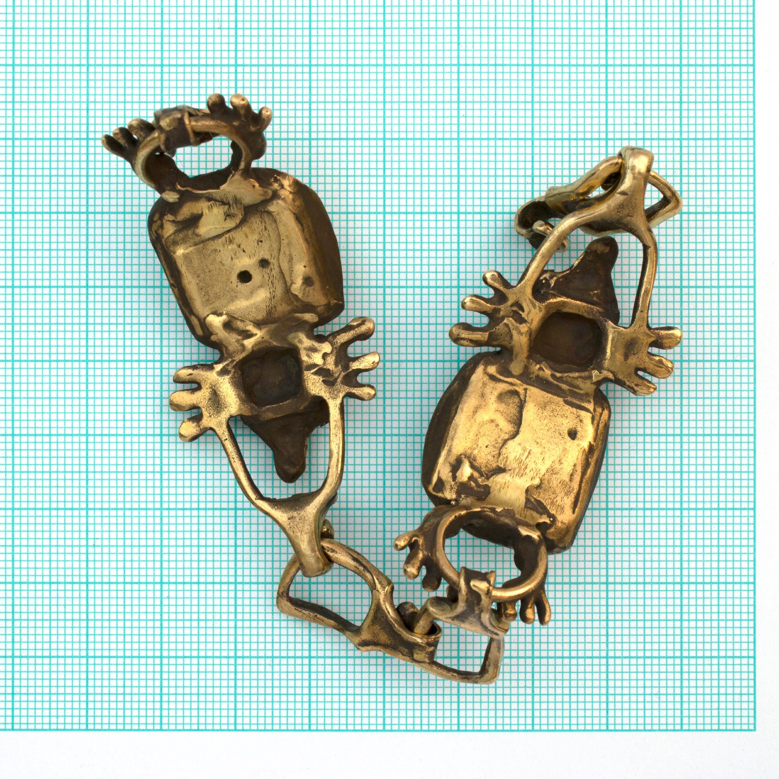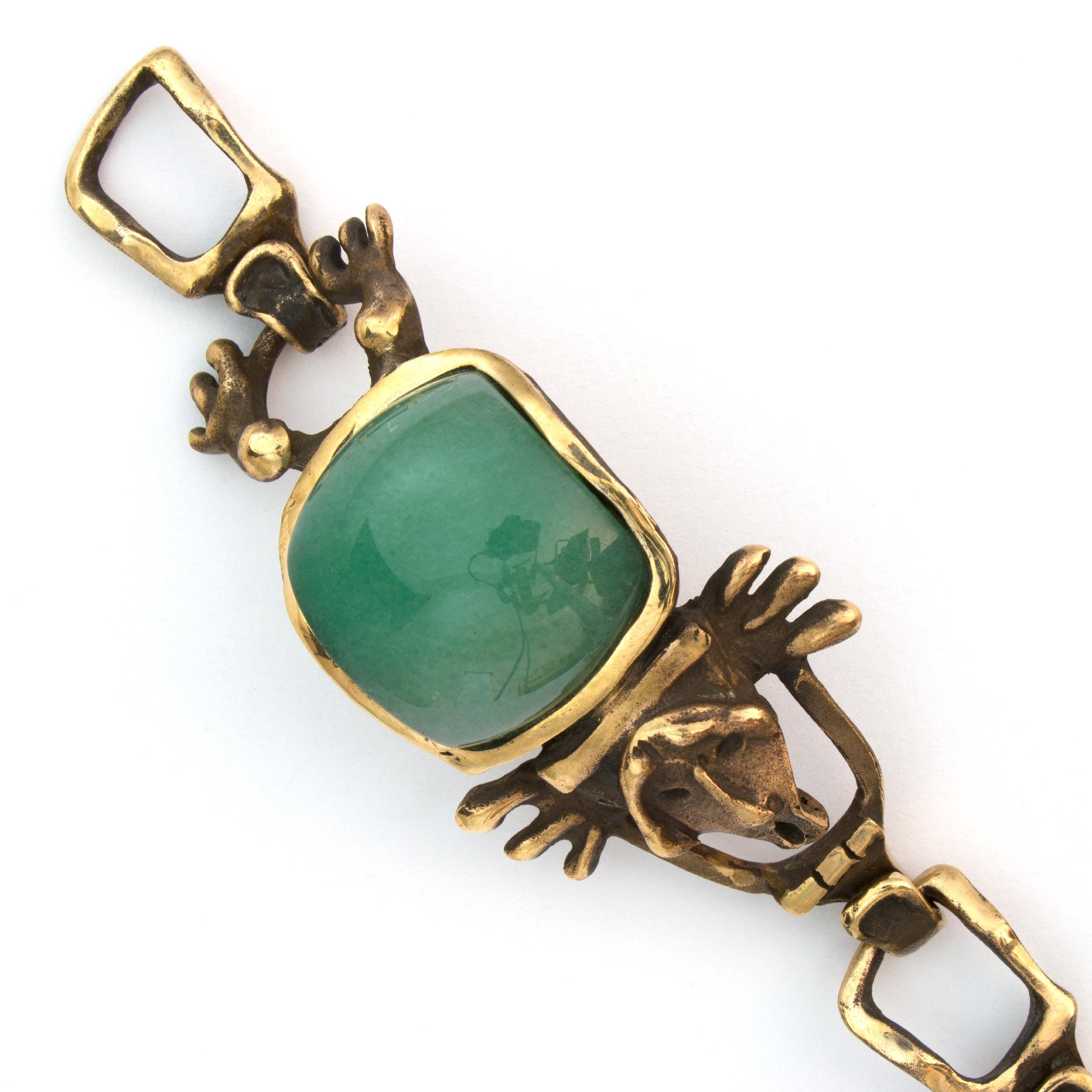 Náramek "Hlavonožec" od Vojtěšky Vlčkové (1948-2023) představuje sochařský přístup ke šperku. Dílo zhotovené technikou lití na ztracený vosk spojuje patinovaný bronz s jadeitem v působivé kompozici. Tento výjimečný kus dokládá dokonalé propojení uměleckého cítění a řemeslné preciznosti, charakteristické pro tvorbu Vojtěšky Vlčkové.