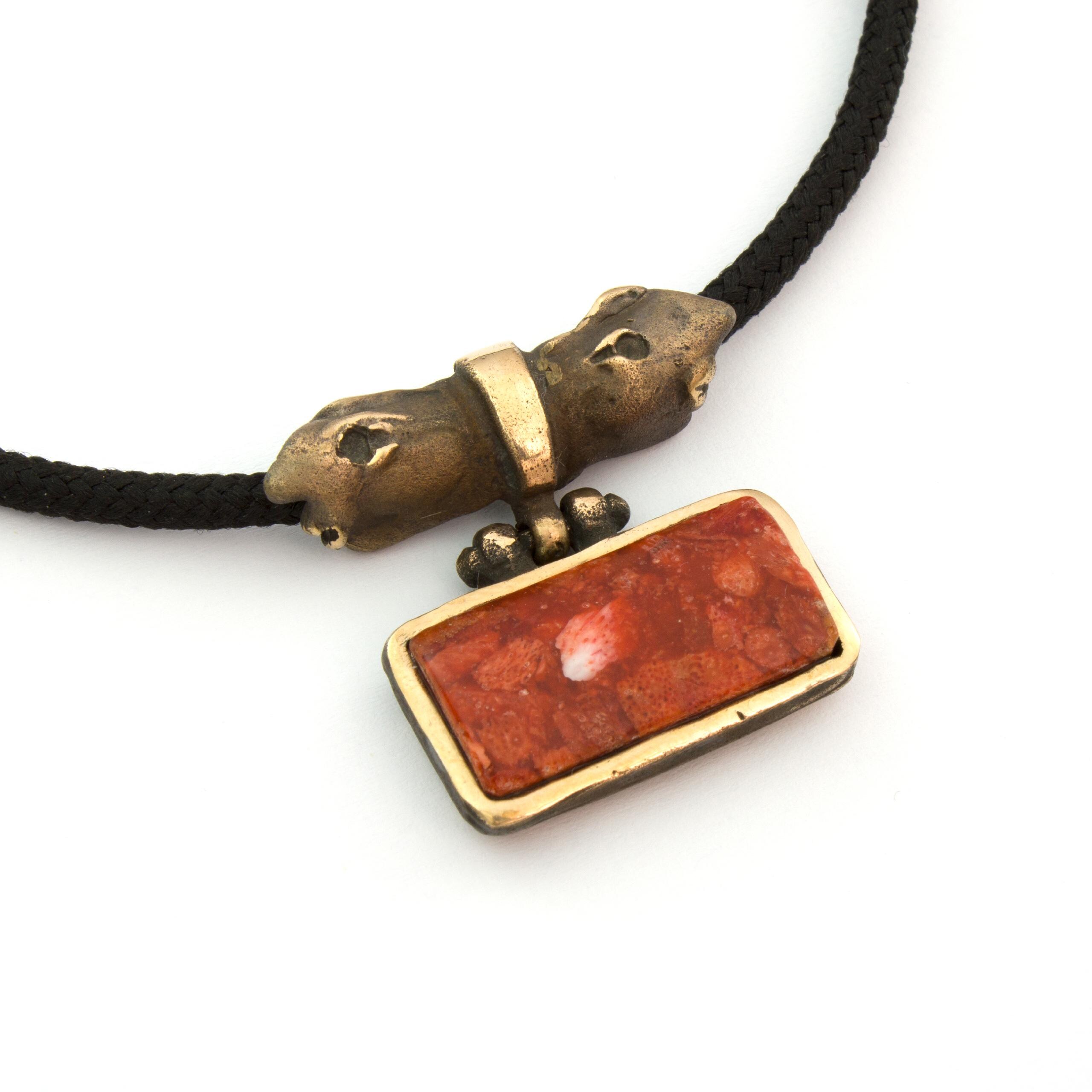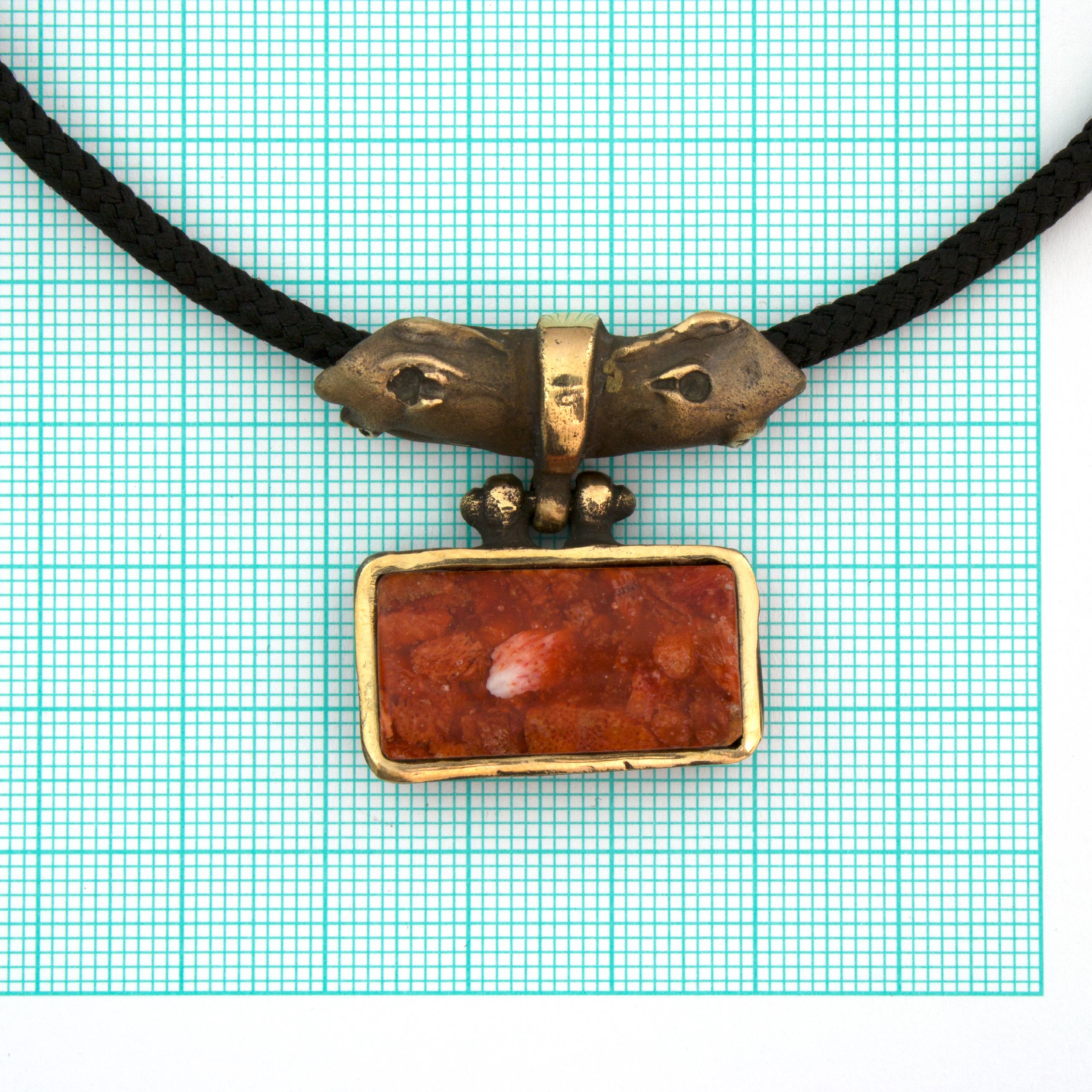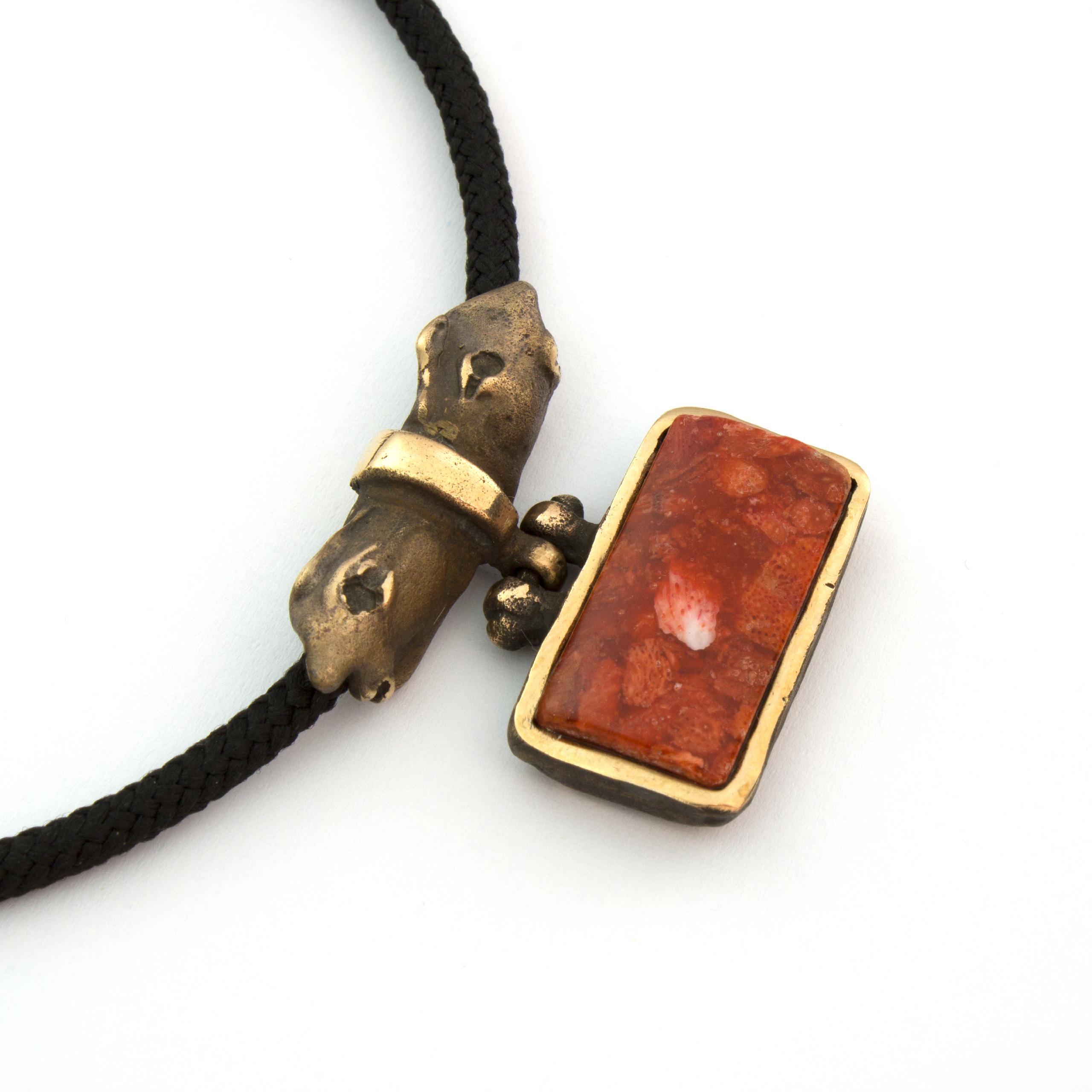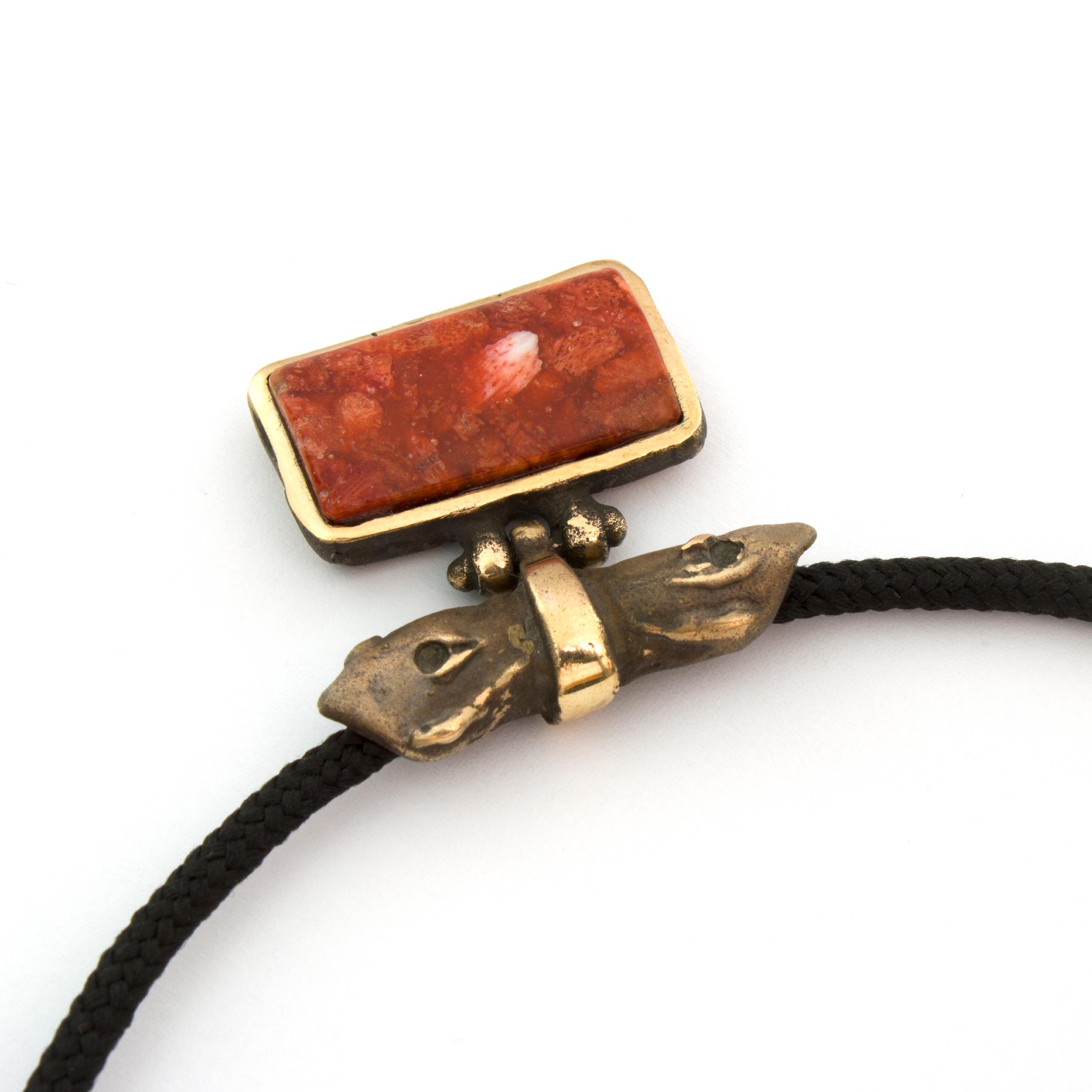 Bronzový náhrdelník s korálem od Vojtěšky Vlčkové Katalogové číslo: 217 Autorka: Vojtěška Vlčková Realizace: Jaromíra Pavlíková Lití na ztracený vosk, bronz, korál Délka cca 50 cm