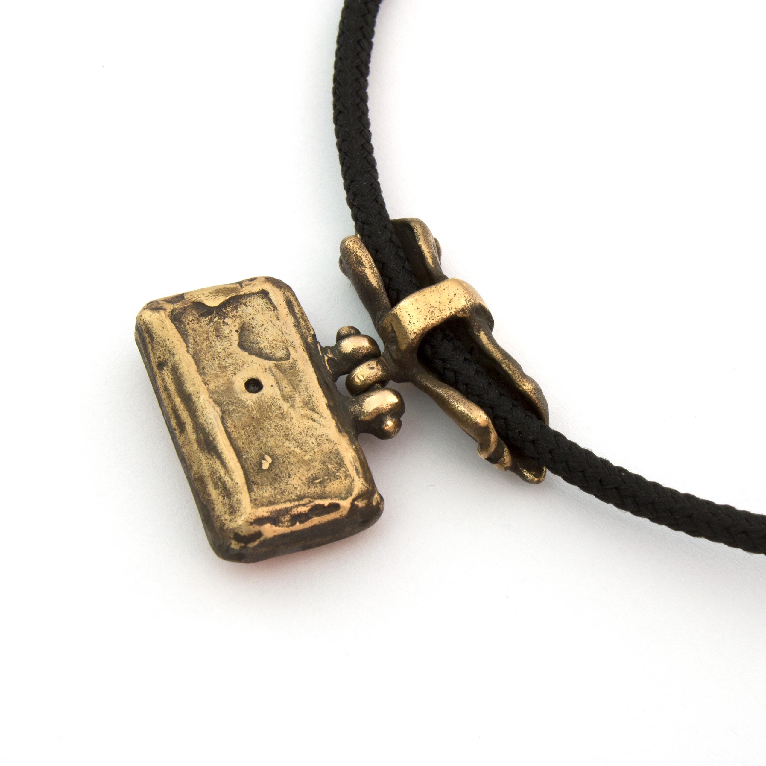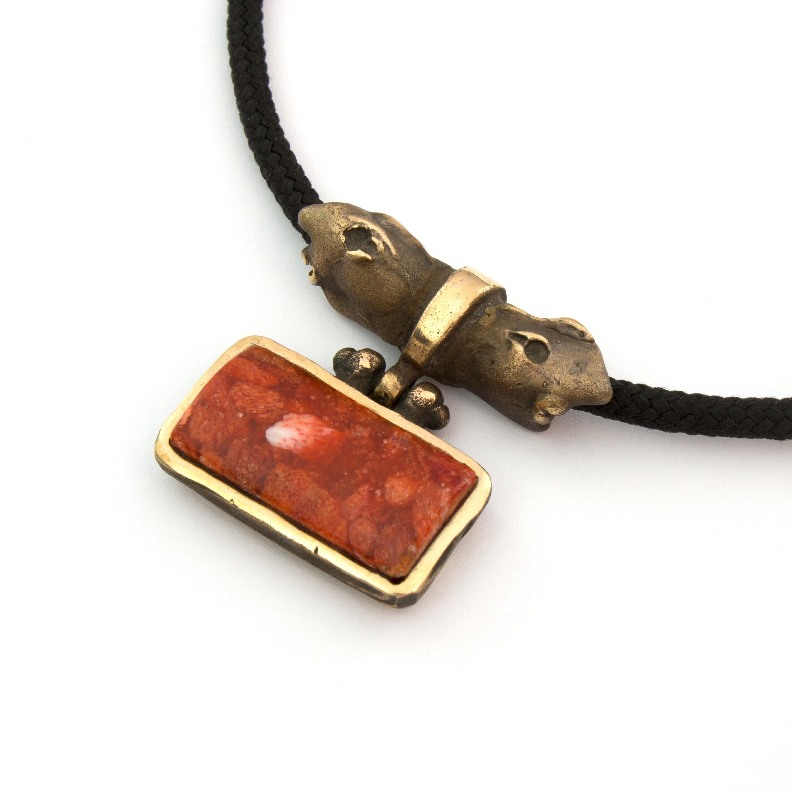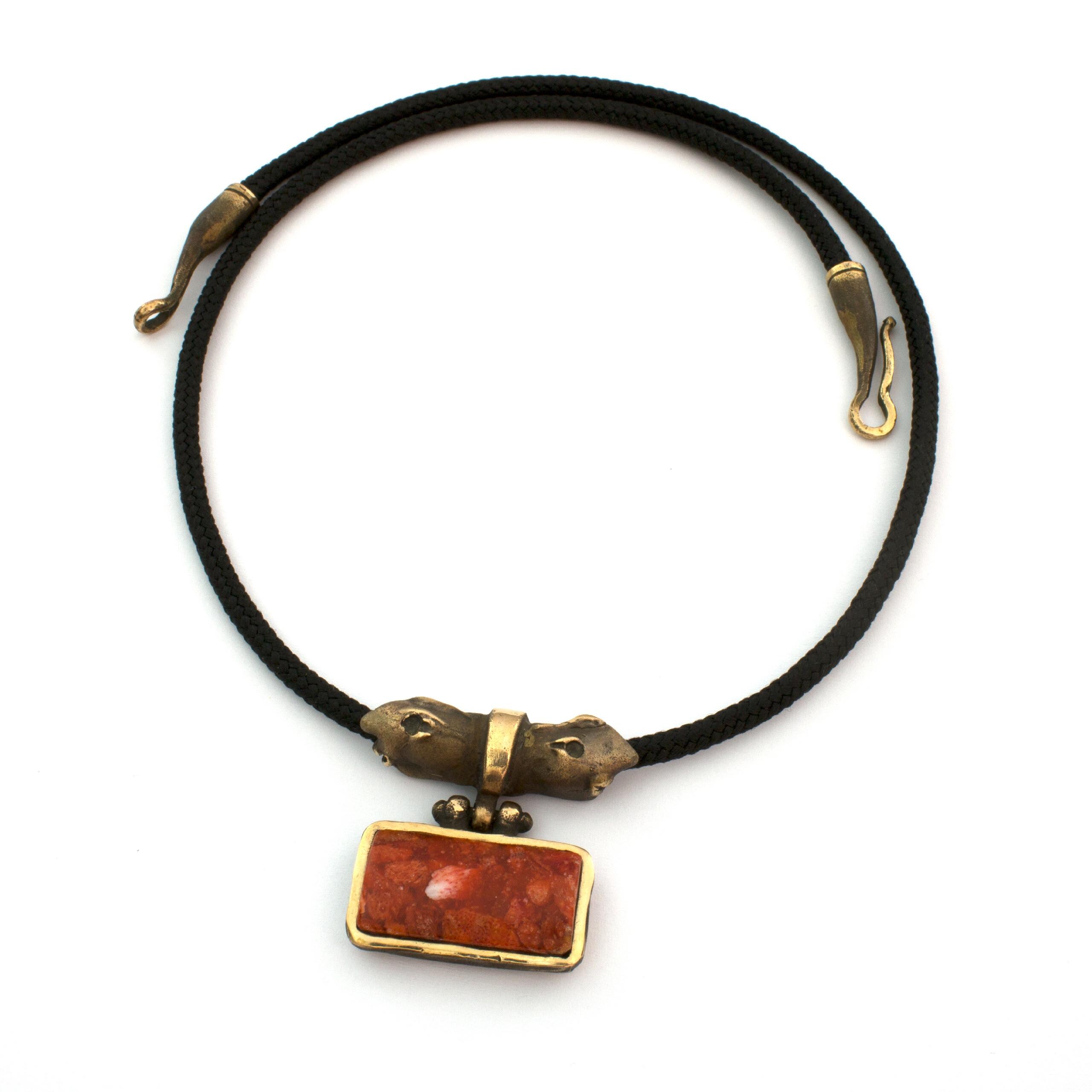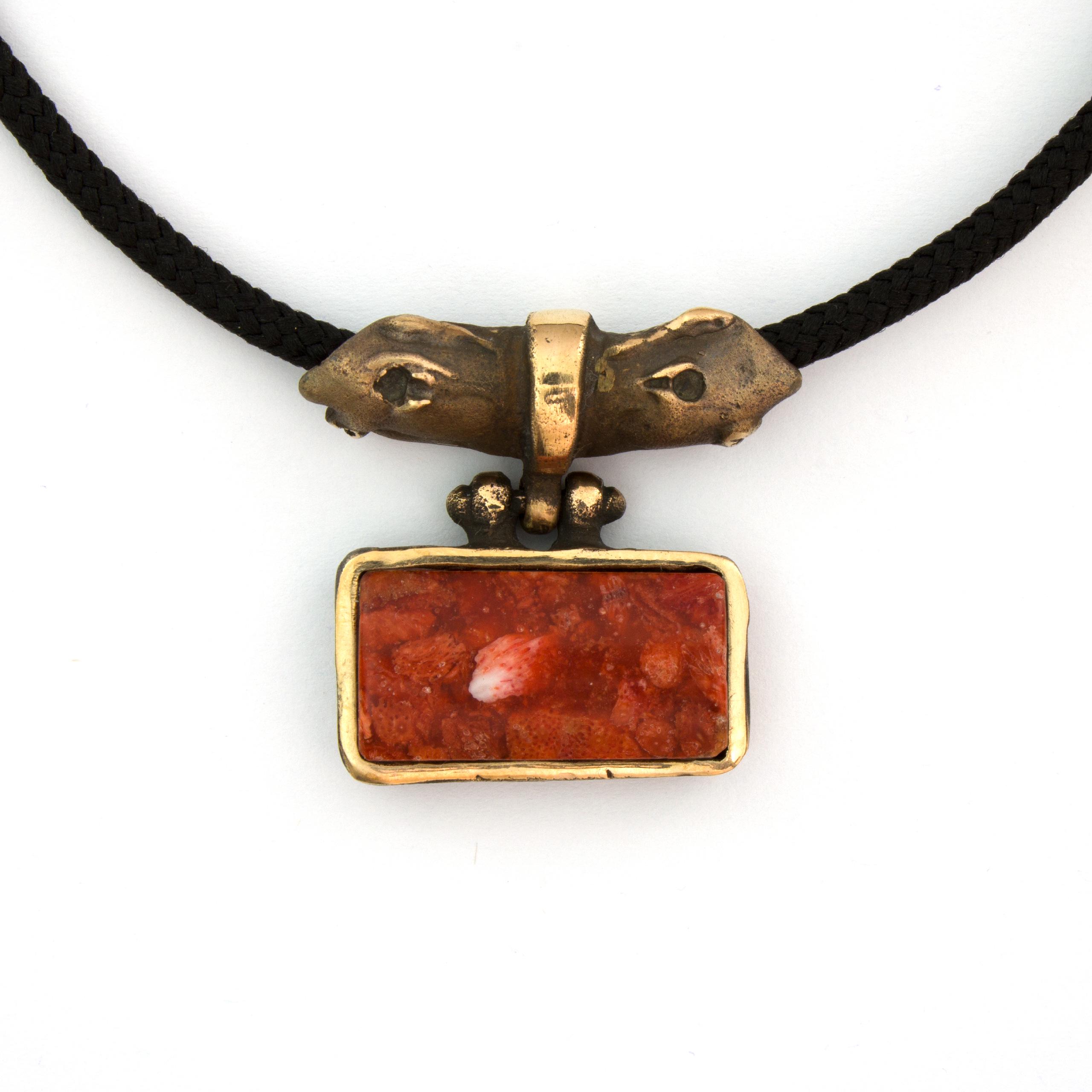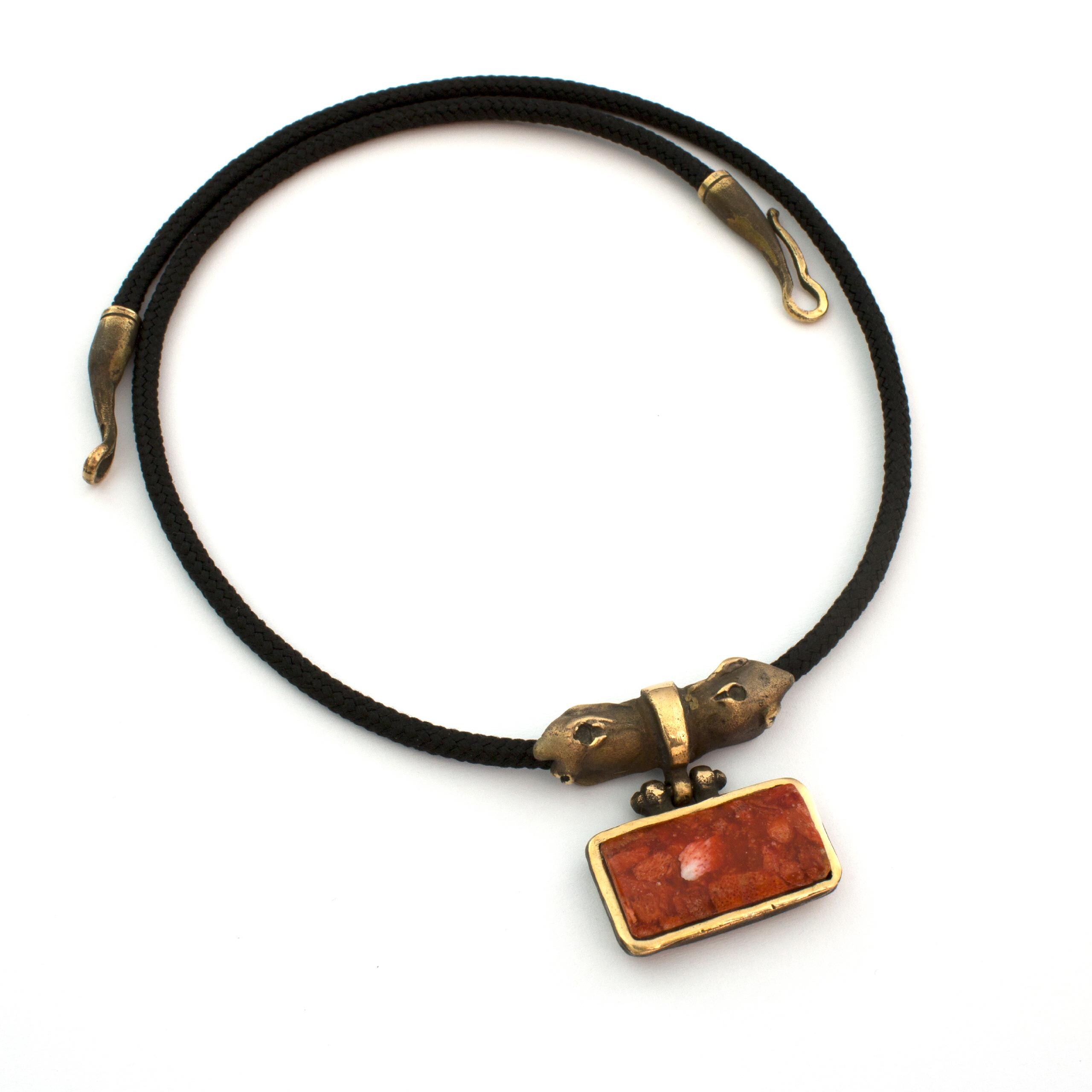 Bronzový náhrdelník s korálem od Vojtěšky Vlčkové Katalogové číslo: 217 Autorka: Vojtěška Vlčková Realizace: Jaromíra Pavlíková Lití na ztracený vosk, bronz, korál Délka cca 50 cm