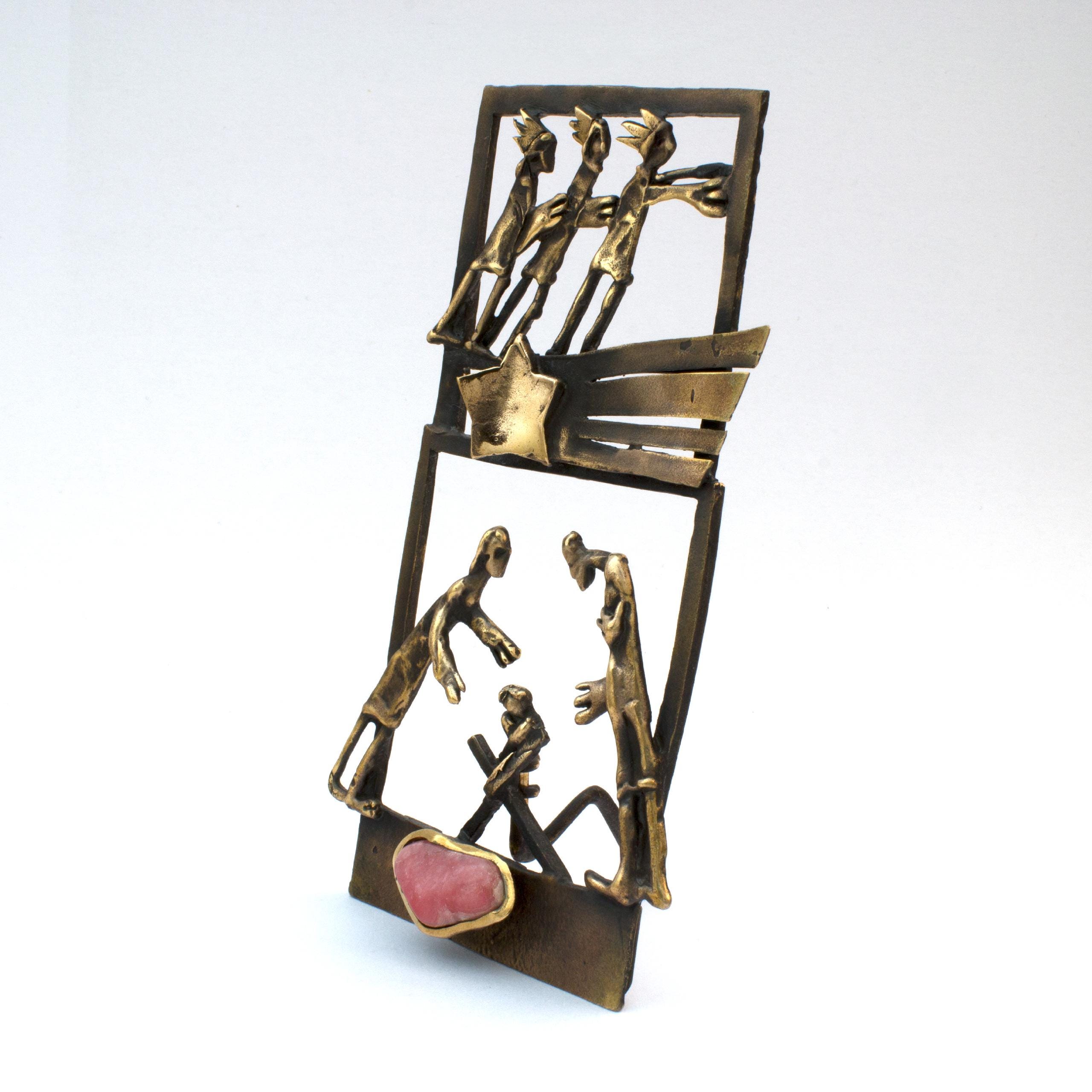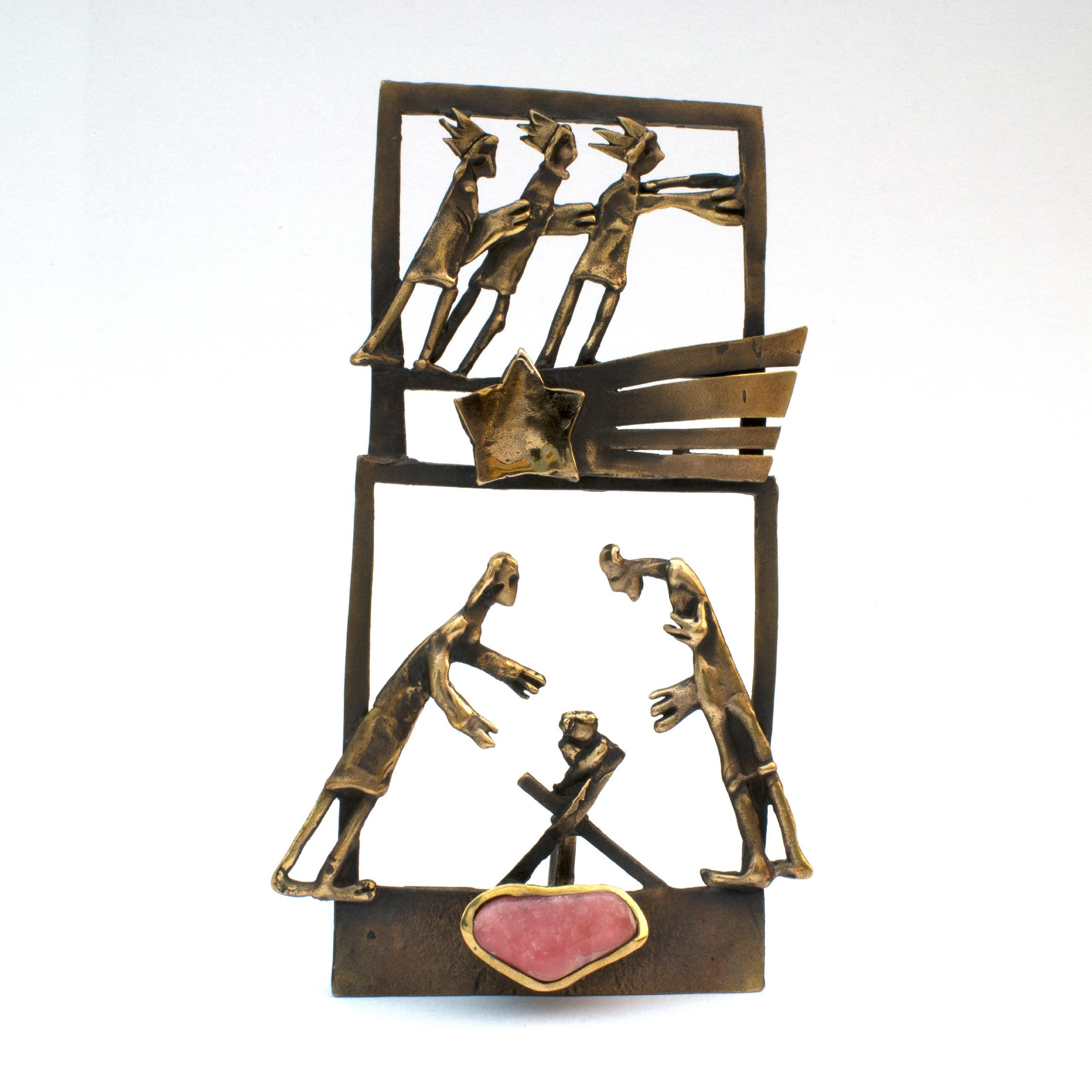 Plastika "Betlém tříkrálový" od Vojtěšky Vlčkové (1948-2023) ztvárňuje tradiční vánoční motiv s jedinečnou sochařskou citlivostí. Patinovaný bronz doplněný růžovým rodochrozitem vytváří výjimečné dílo, které ozdobí vaši sbírku nejen během svátků, ale po celý rok jako symbol umělecké zručnosti.