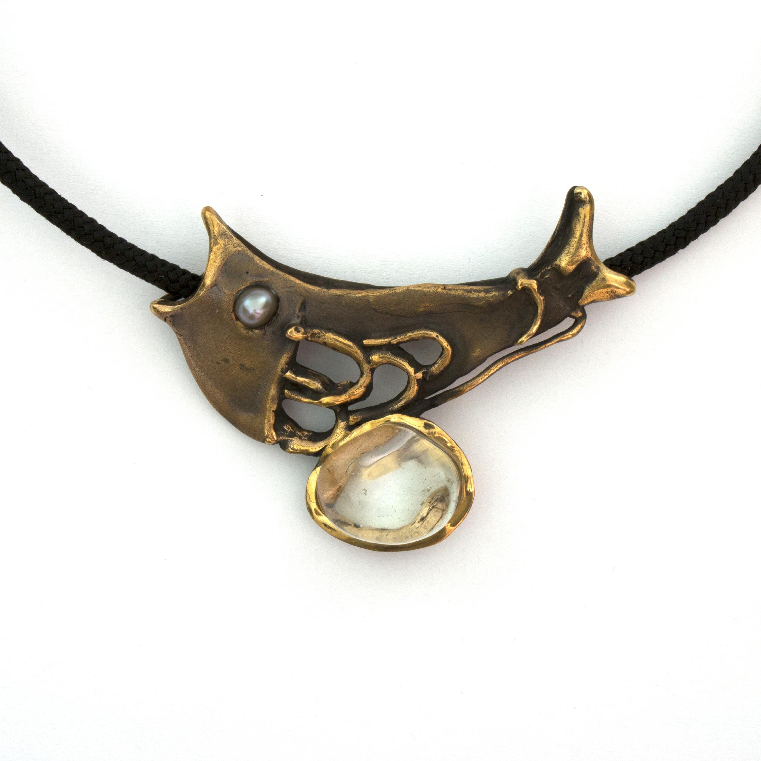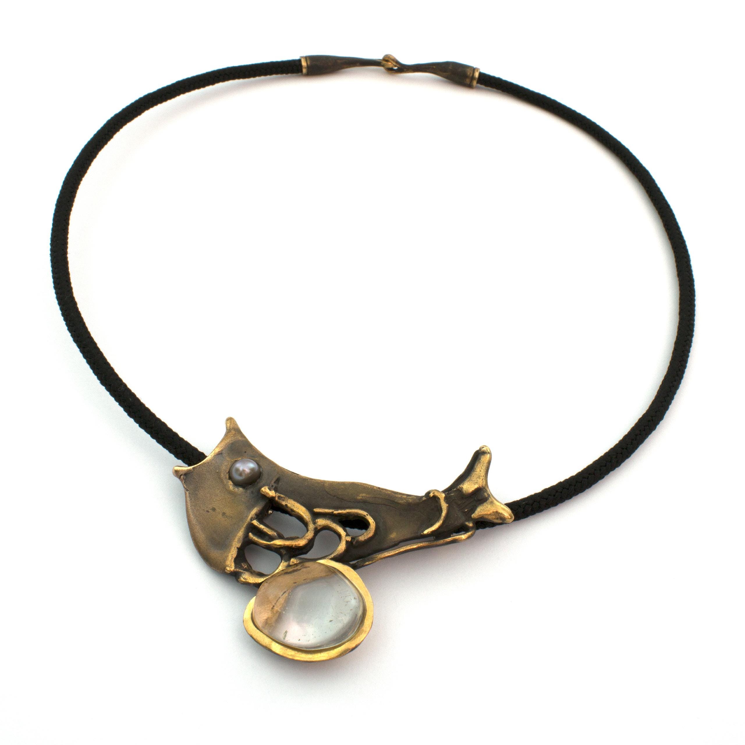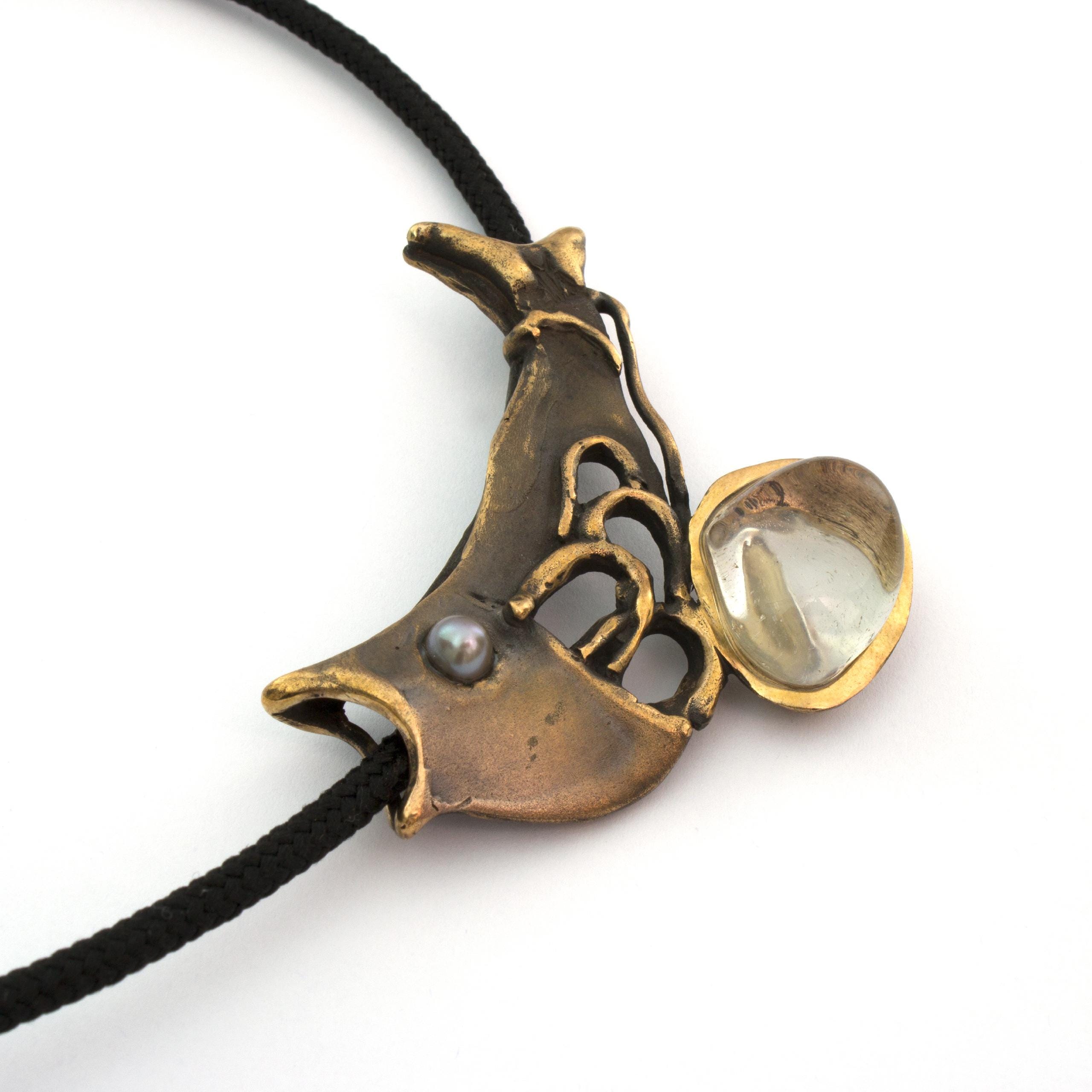 Bronzový náhrdelník s křišťálem a perlou od Vojtěšky Vlčkové Katalogové číslo: 279 Autorka: Vojtěška Vlčková Realizace: Jaromíra Pavlíková Lití na ztracený vosk, bronz, křišťál, perla Délka cca 48 cm