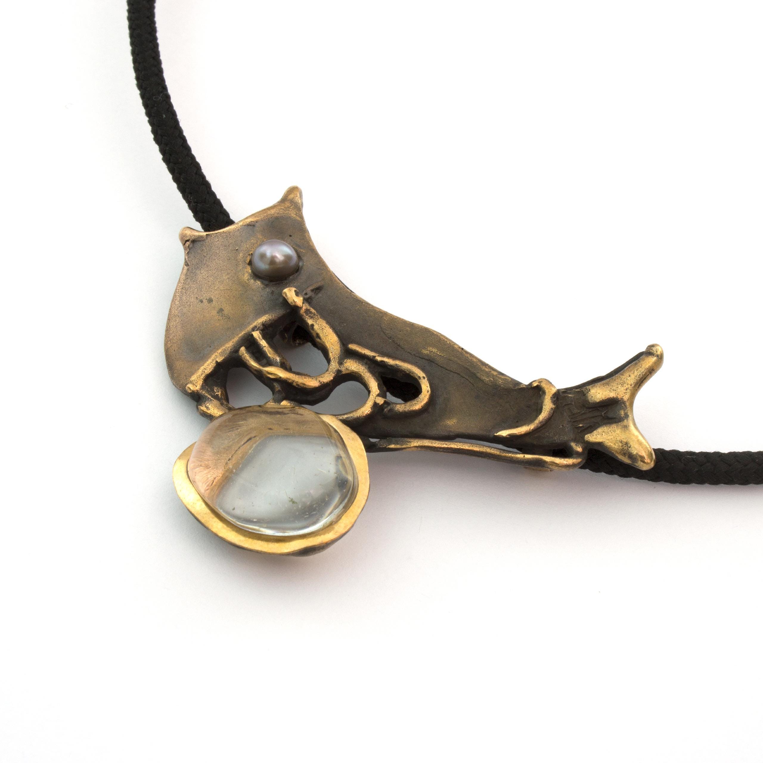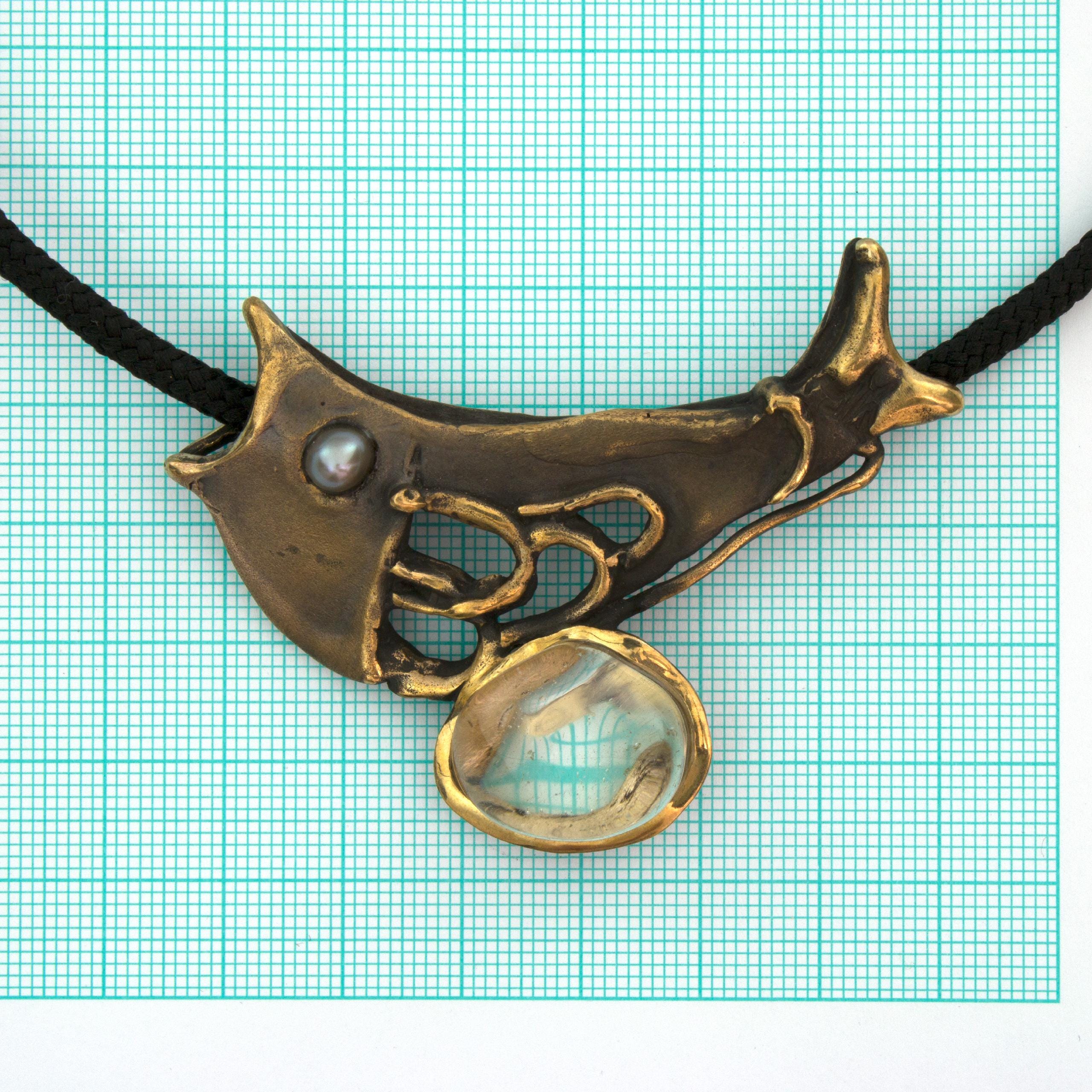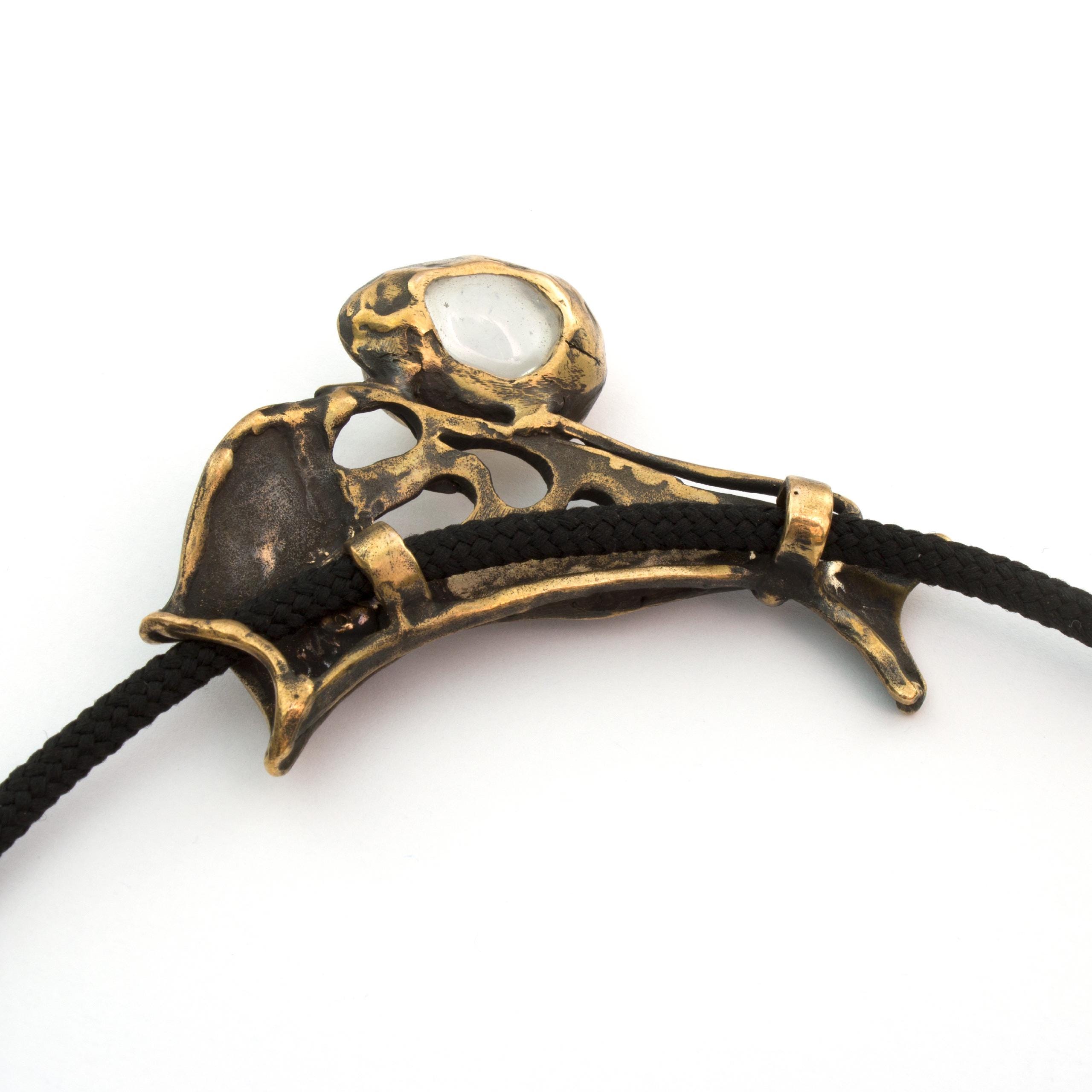 Bronzový náhrdelník s křišťálem a perlou od Vojtěšky Vlčkové Katalogové číslo: 279 Autorka: Vojtěška Vlčková Realizace: Jaromíra Pavlíková Lití na ztracený vosk, bronz, křišťál, perla Délka cca 48 cm