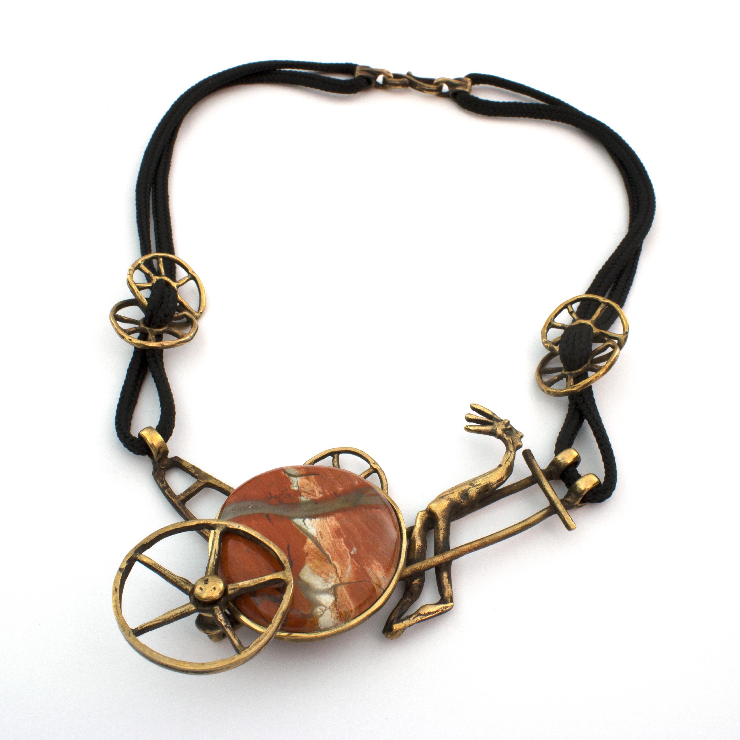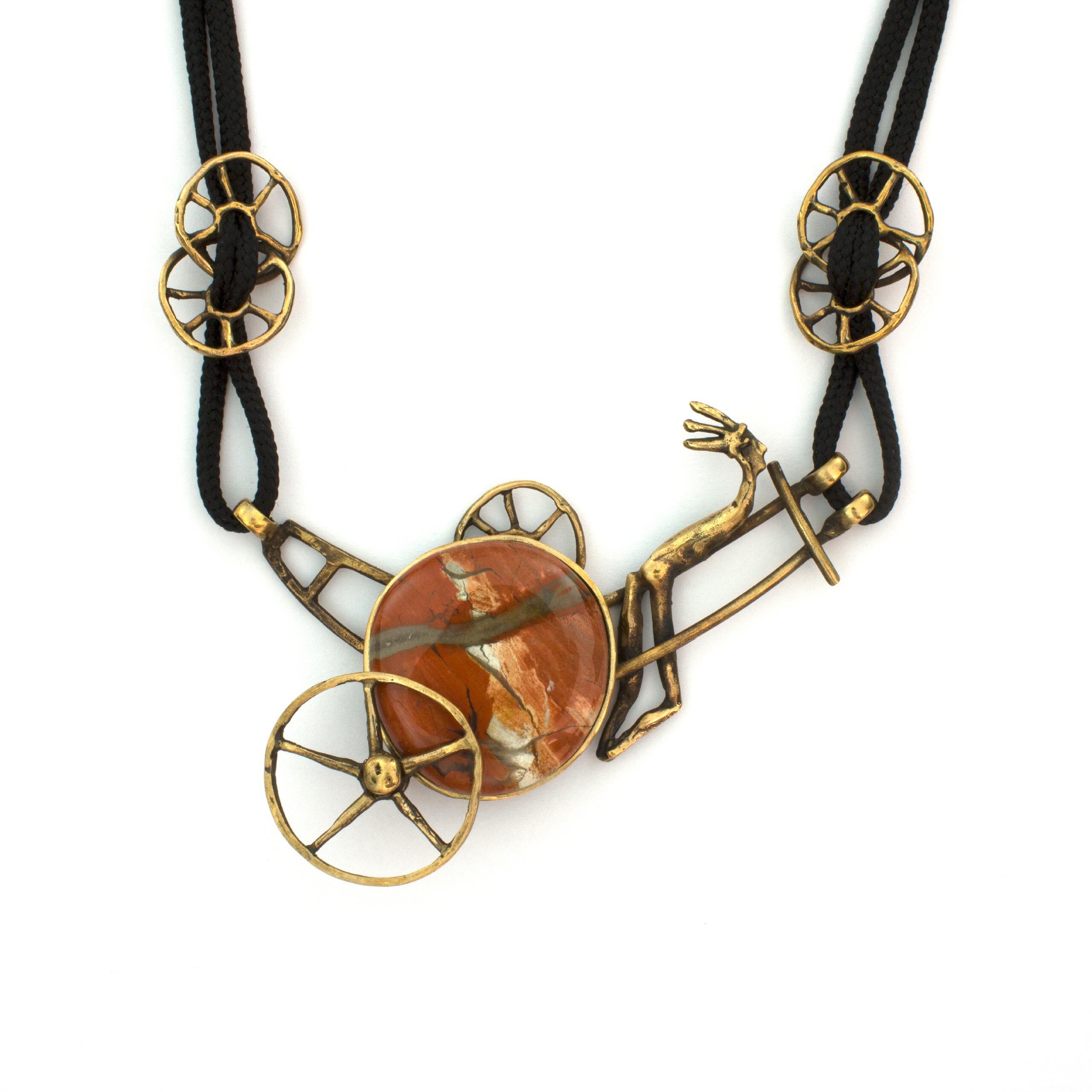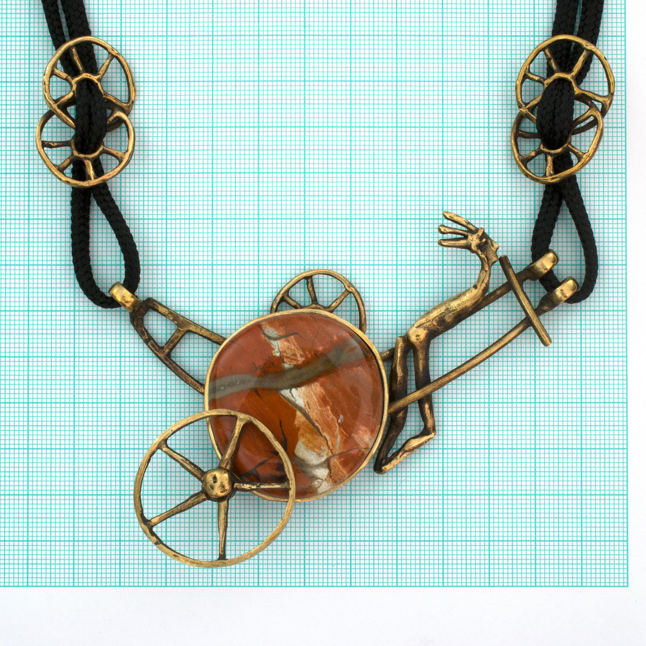 Bronzový náhrdelník s jaspisem od Vojtěšky Vlčkové je autorský šperk vytvořený tradiční technologií lití na ztracený vosk. Spojení jaspisu a bronzu vytváří přirozenou rovnováhu mezi hmotou a barvou, která dodává šperku osobitý charakter. Jedinečný kus s výtvarnou noblesou a sběratelskou hodnotou.