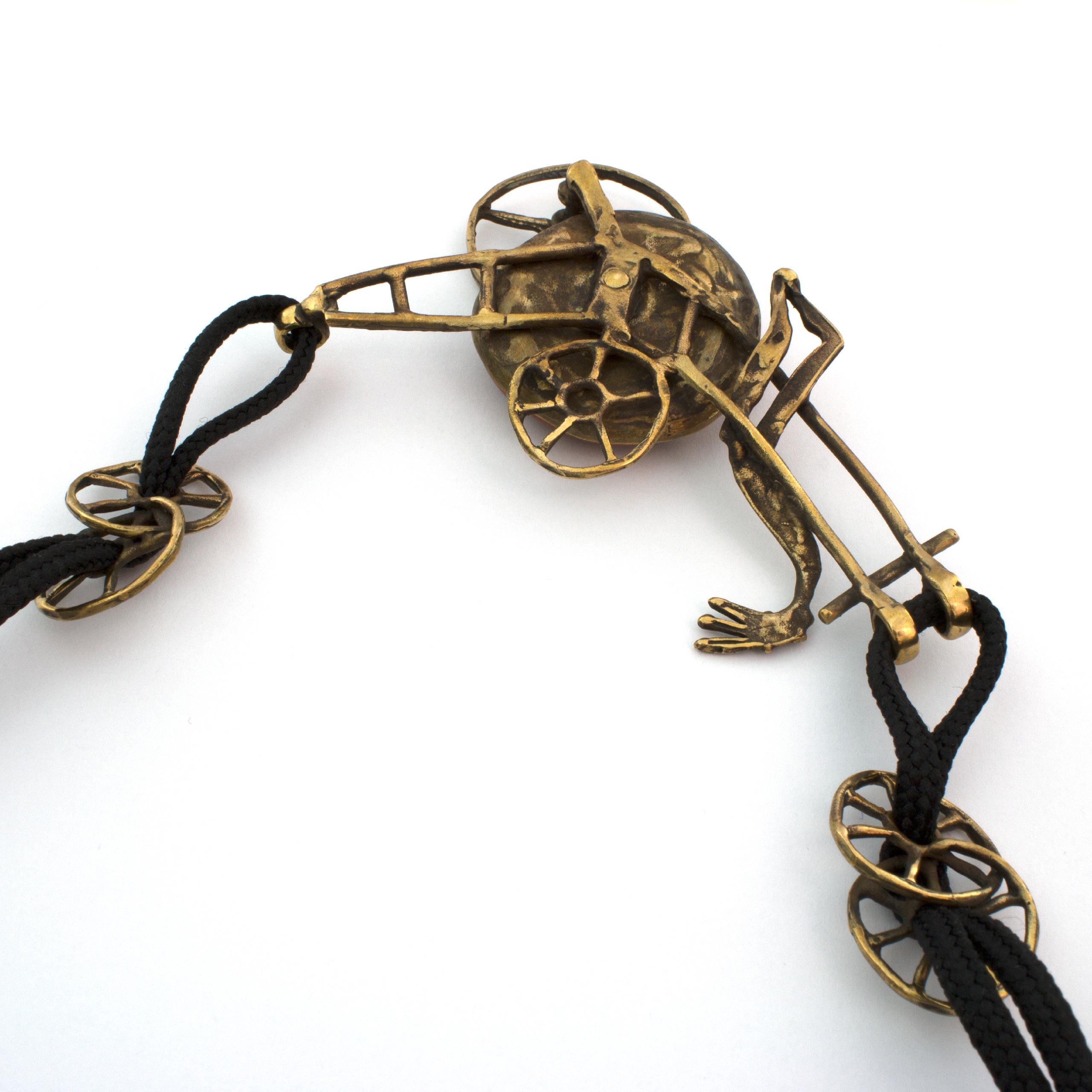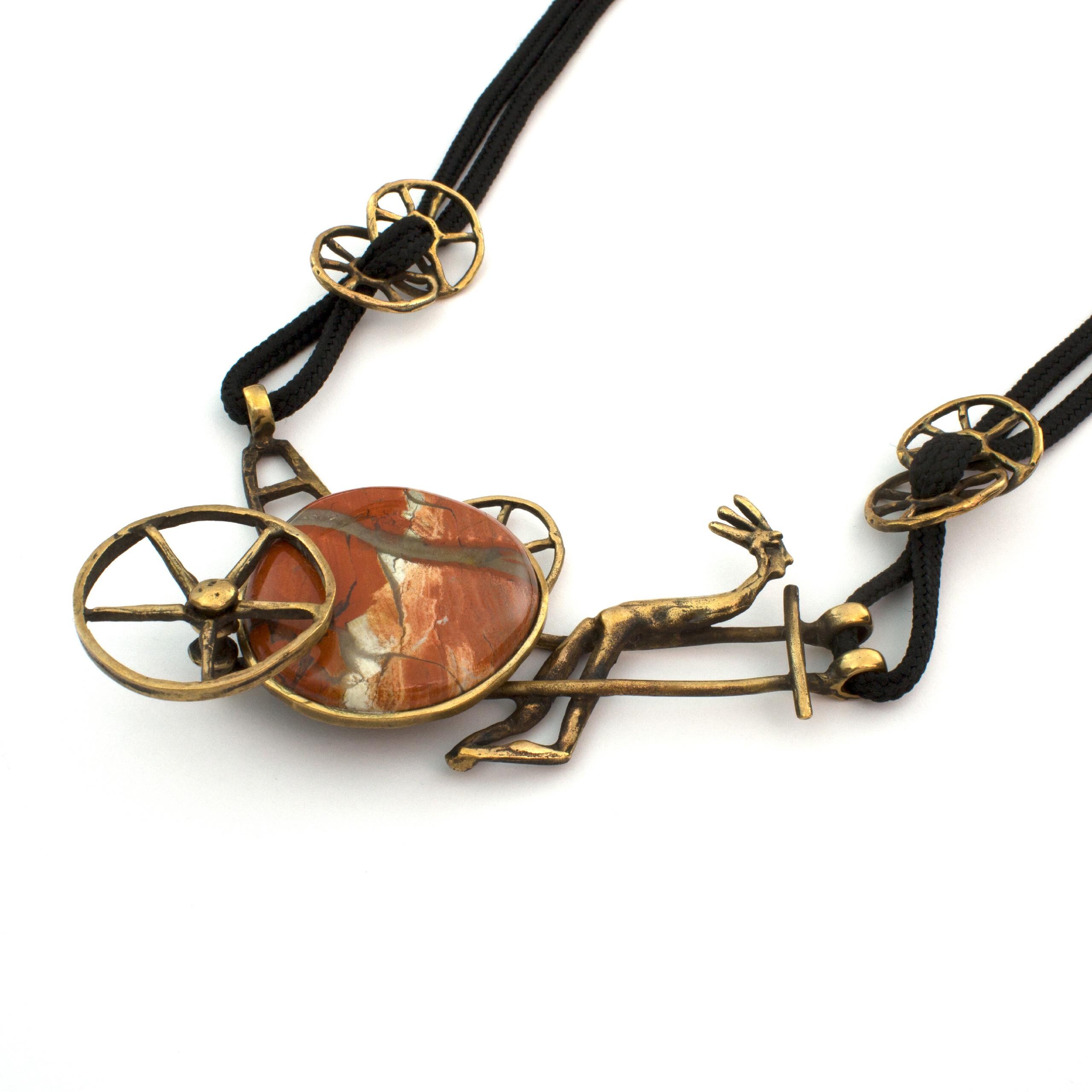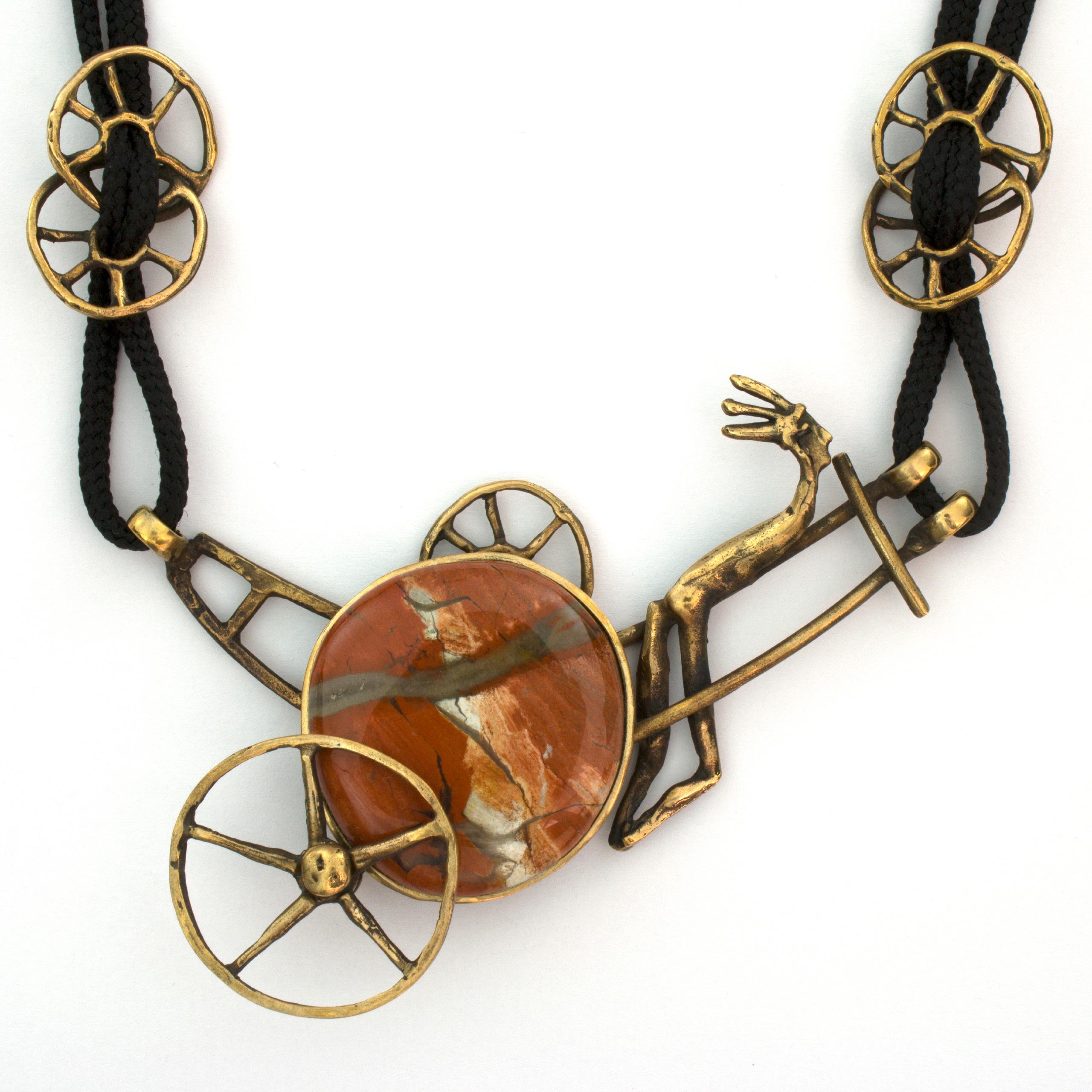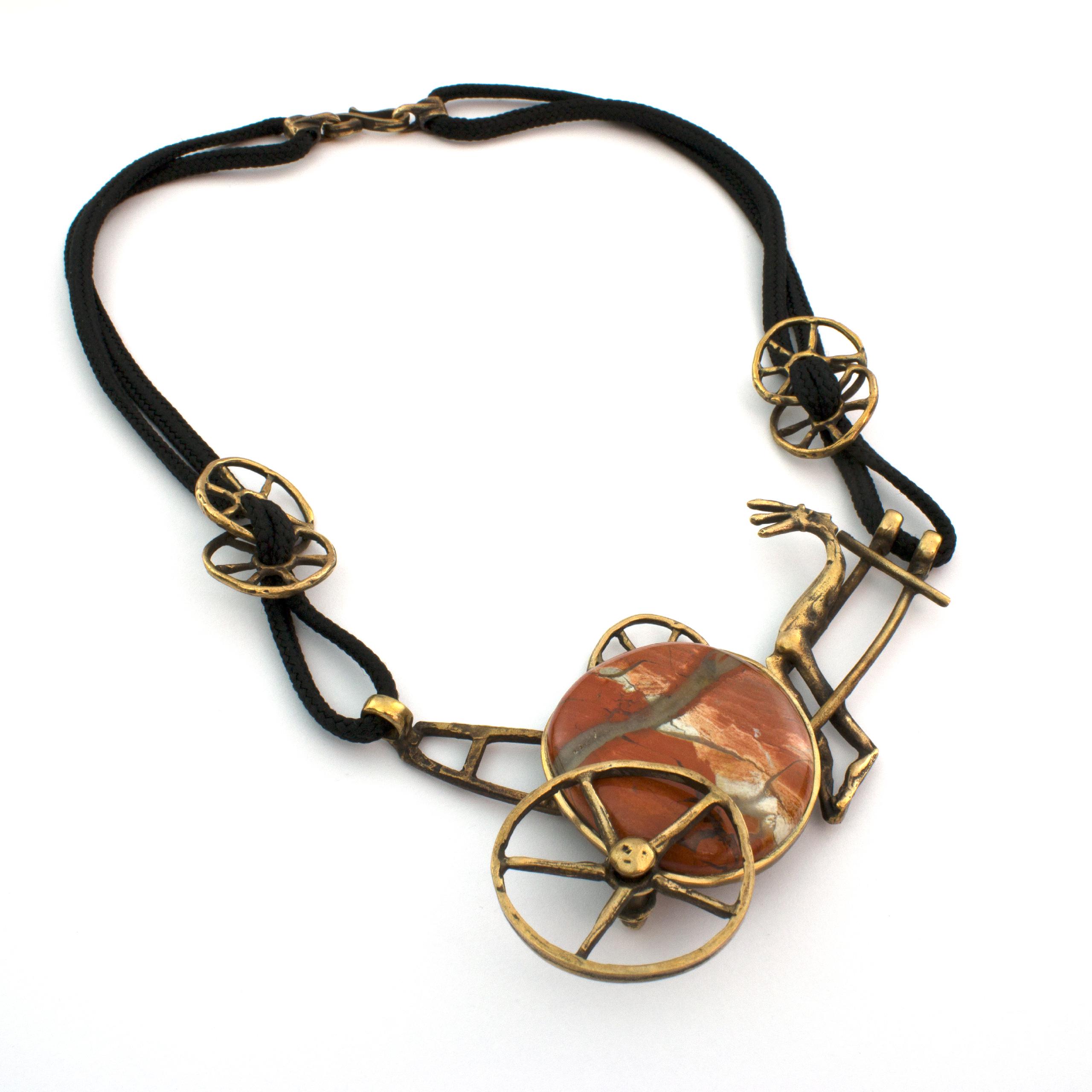Bronzový náhrdelník s jaspisem od Vojtěšky Vlčkové je autorský šperk vytvořený tradiční technologií lití na ztracený vosk. Spojení jaspisu a bronzu vytváří přirozenou rovnováhu mezi hmotou a barvou, která dodává šperku osobitý charakter. Jedinečný kus s výtvarnou noblesou a sběratelskou hodnotou.