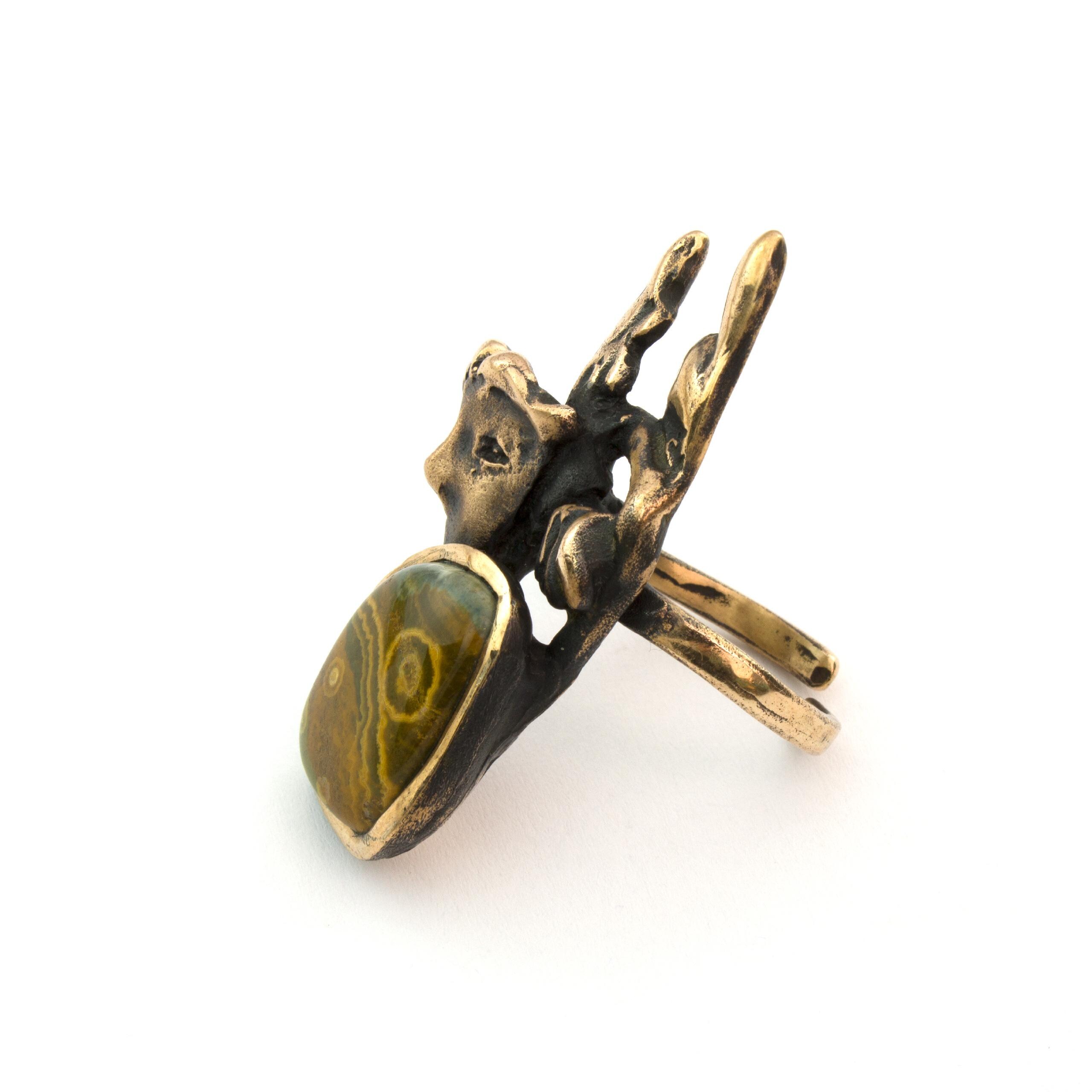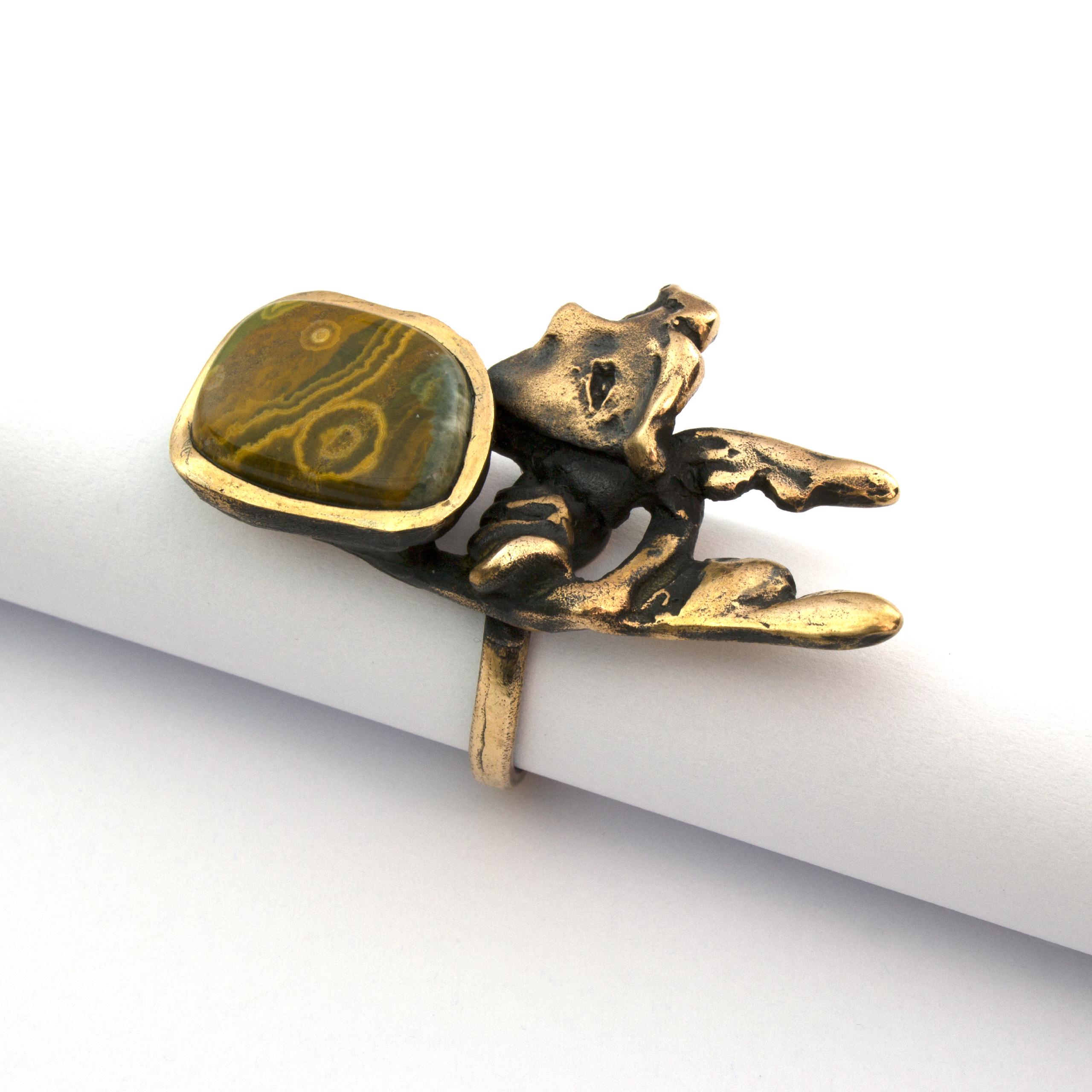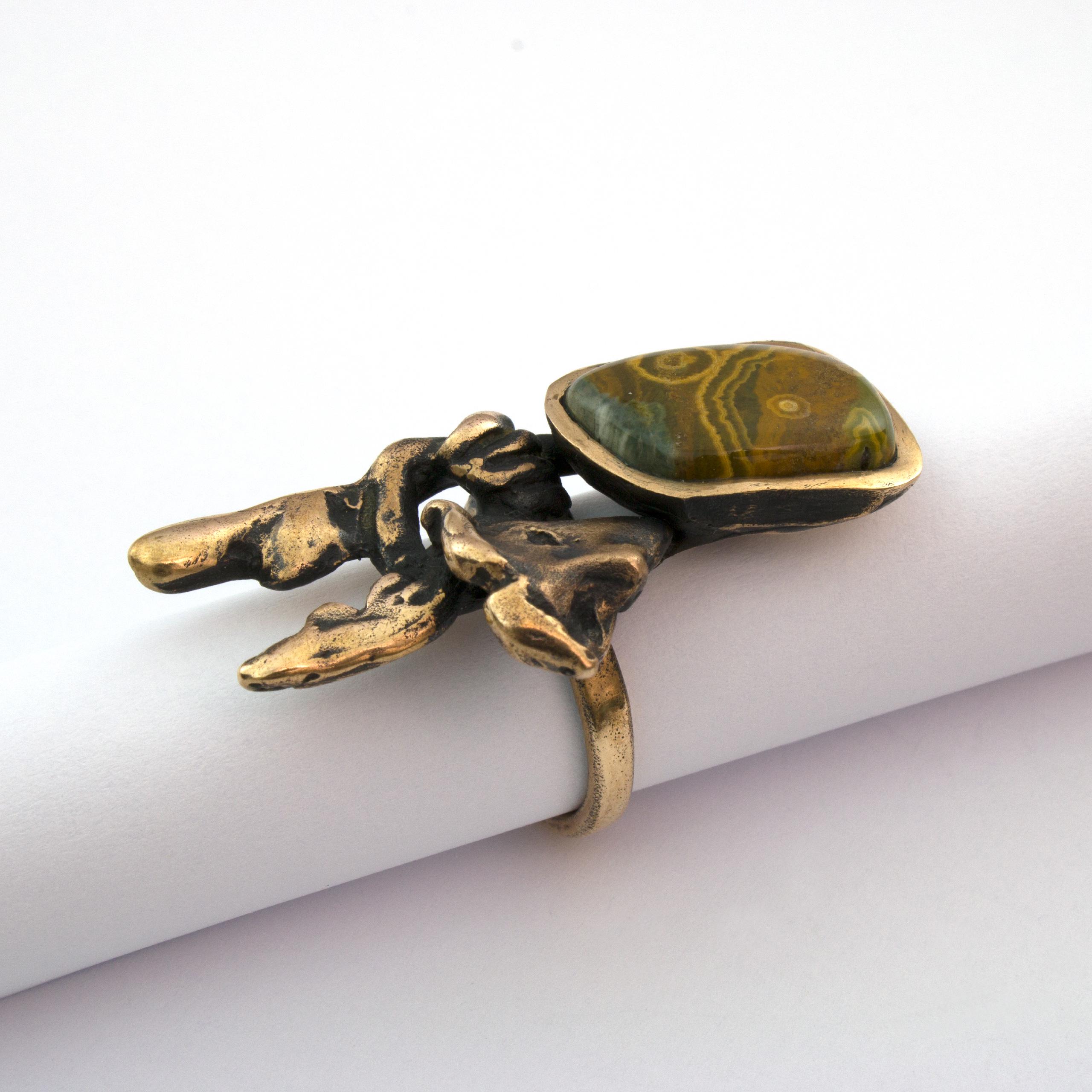 Bronzový prsten s jaspisem od Vojtěšky Vlčkové. Autorský šperk vytvořený tradiční technologií lití na ztracený vosk spojuje ušlechtilý materiál s přirozenou krásou kamene. Výjimečný umělecký originál s harmonickým výrazem a osobitým stylem.