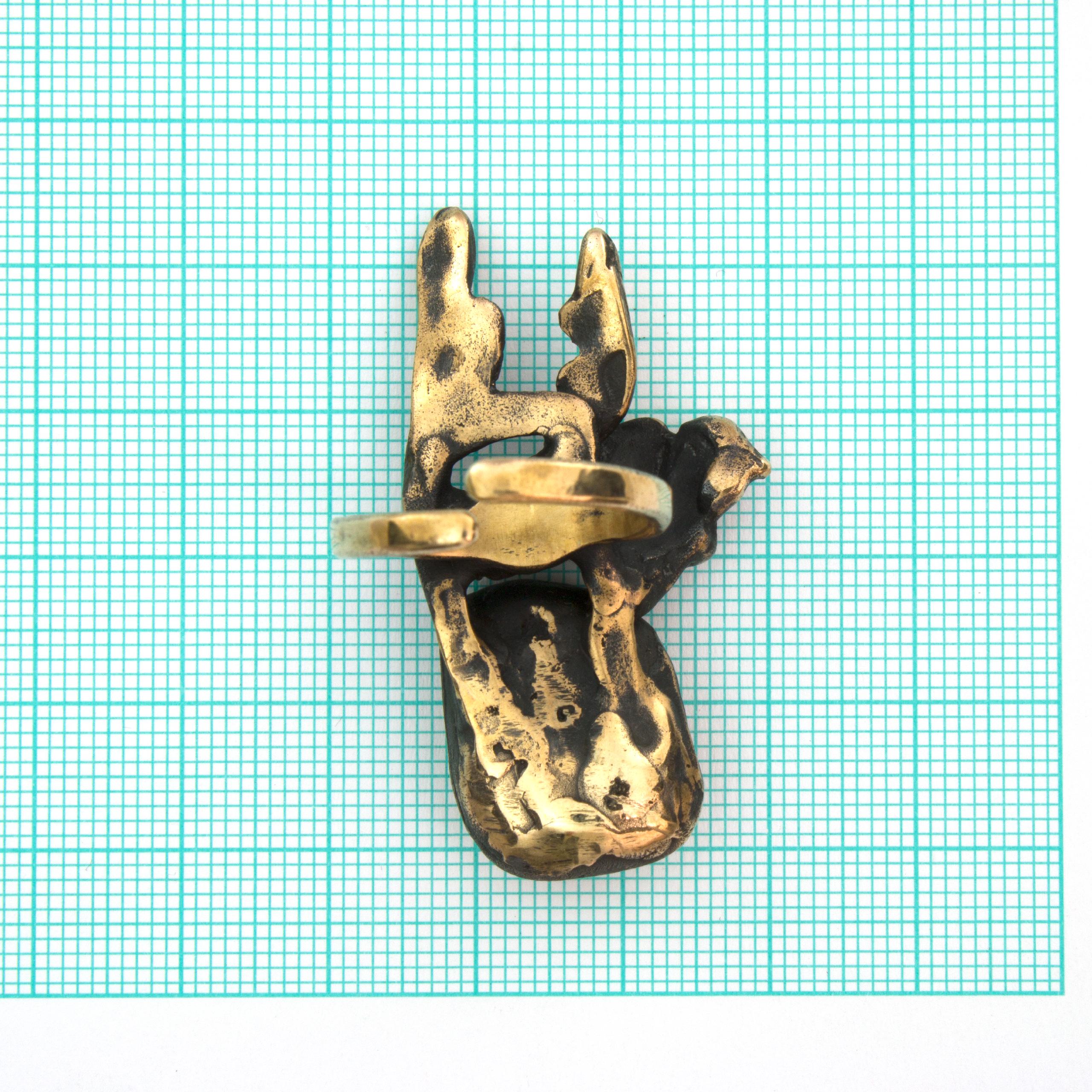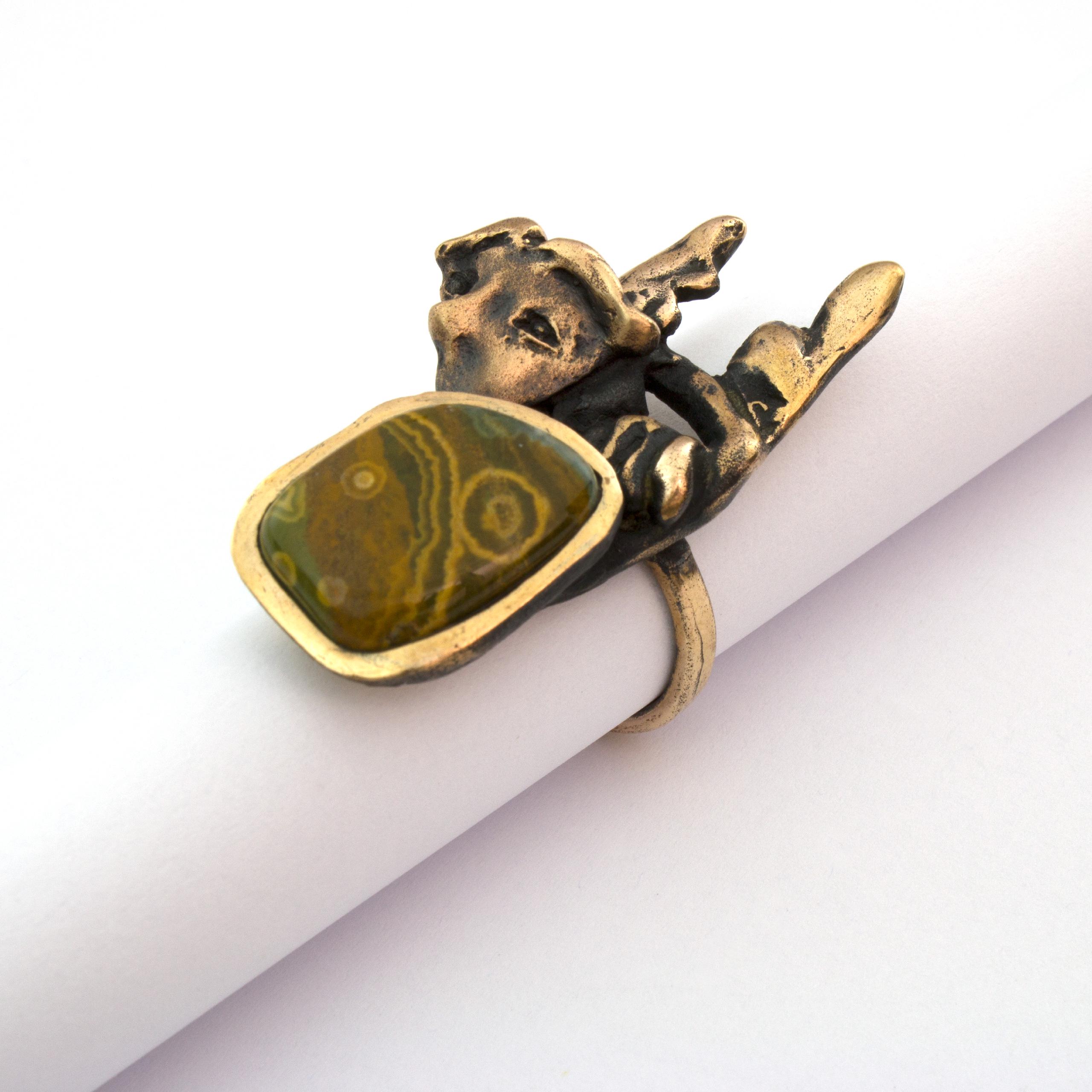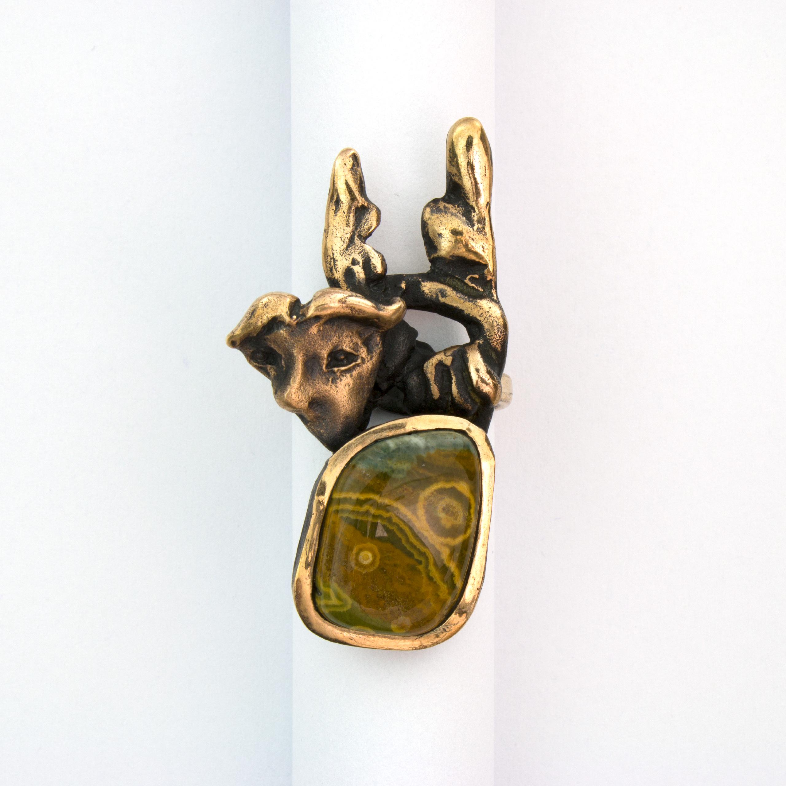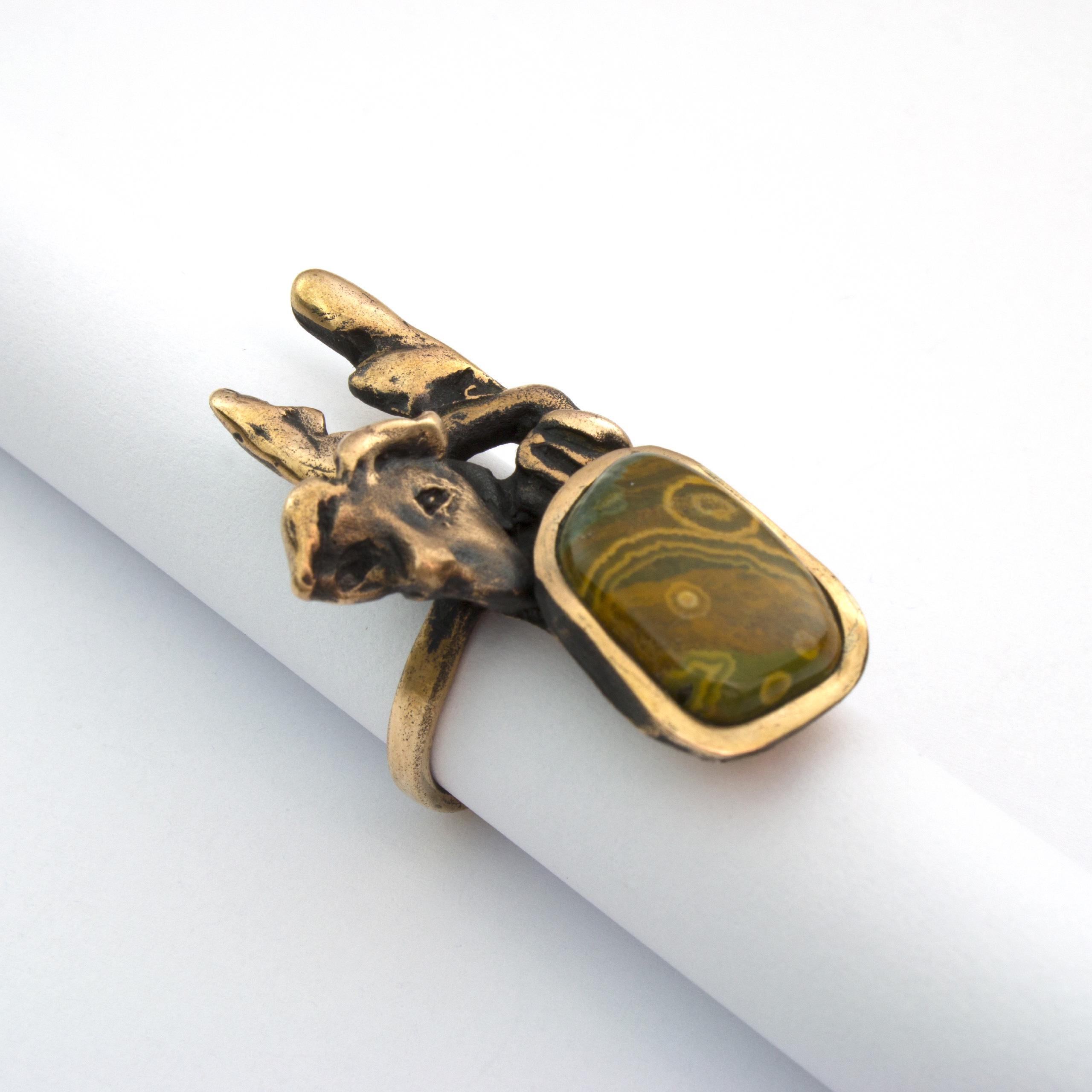 Bronzový prsten s jaspisem od Vojtěšky Vlčkové. Autorský šperk vytvořený tradiční technologií lití na ztracený vosk spojuje ušlechtilý materiál s přirozenou krásou kamene. Výjimečný umělecký originál s harmonickým výrazem a osobitým stylem.