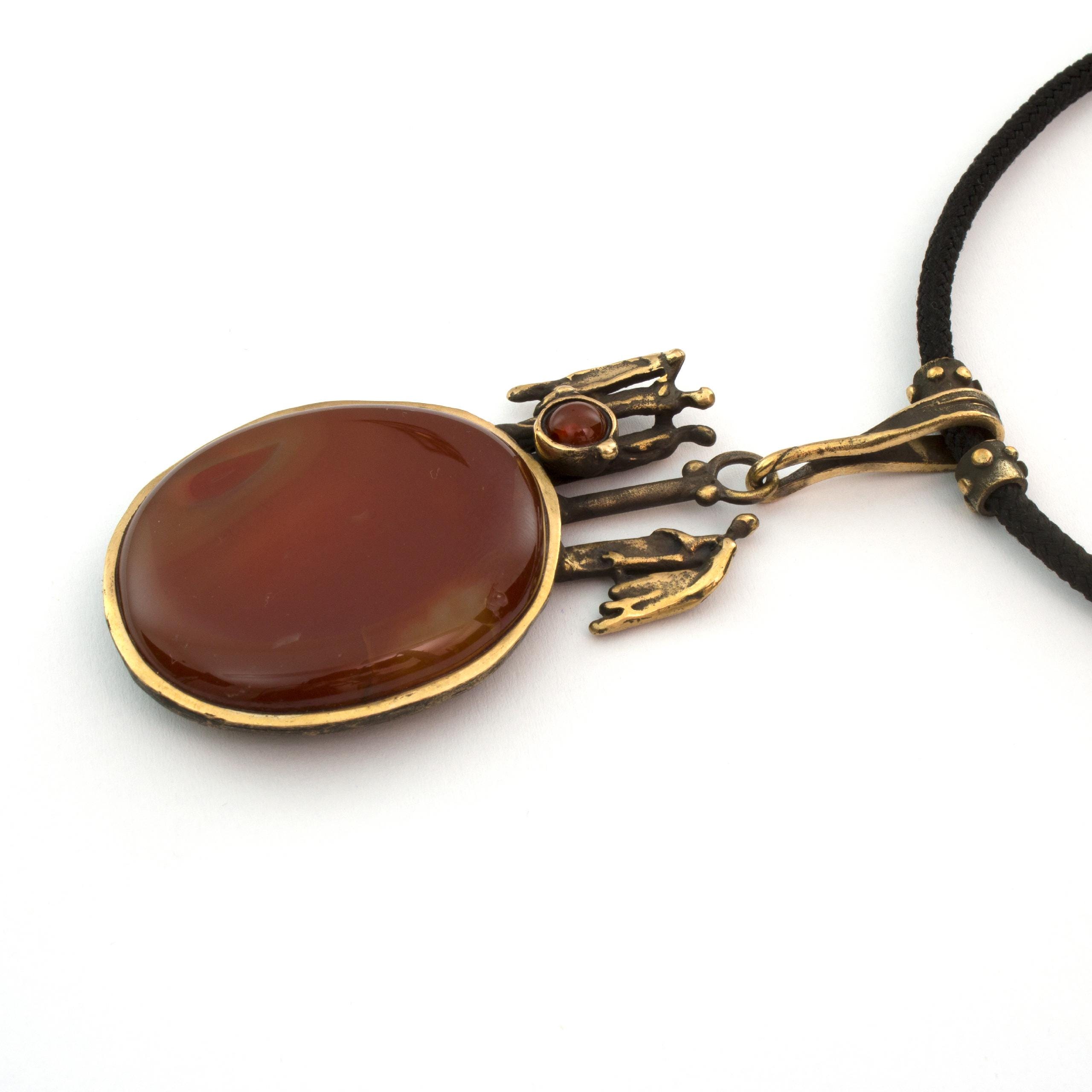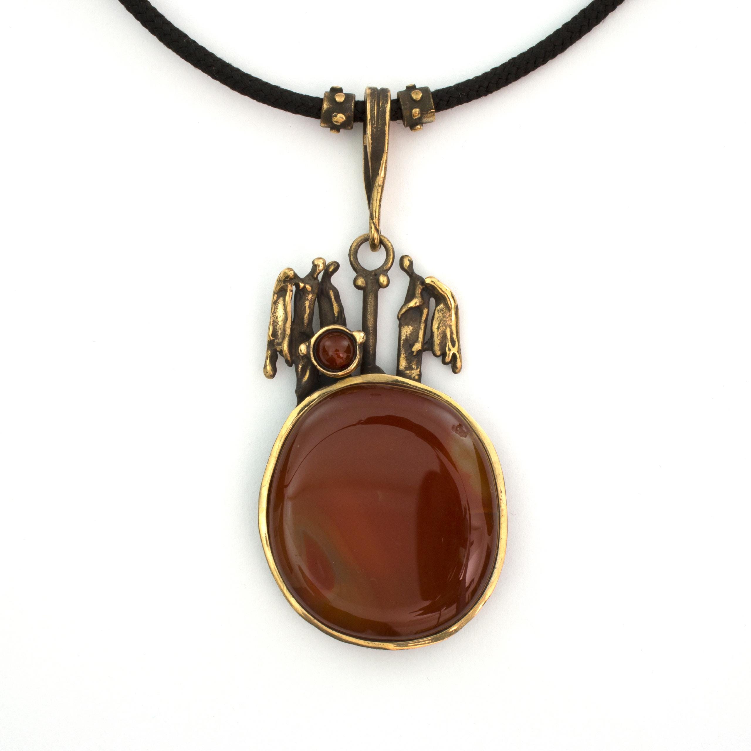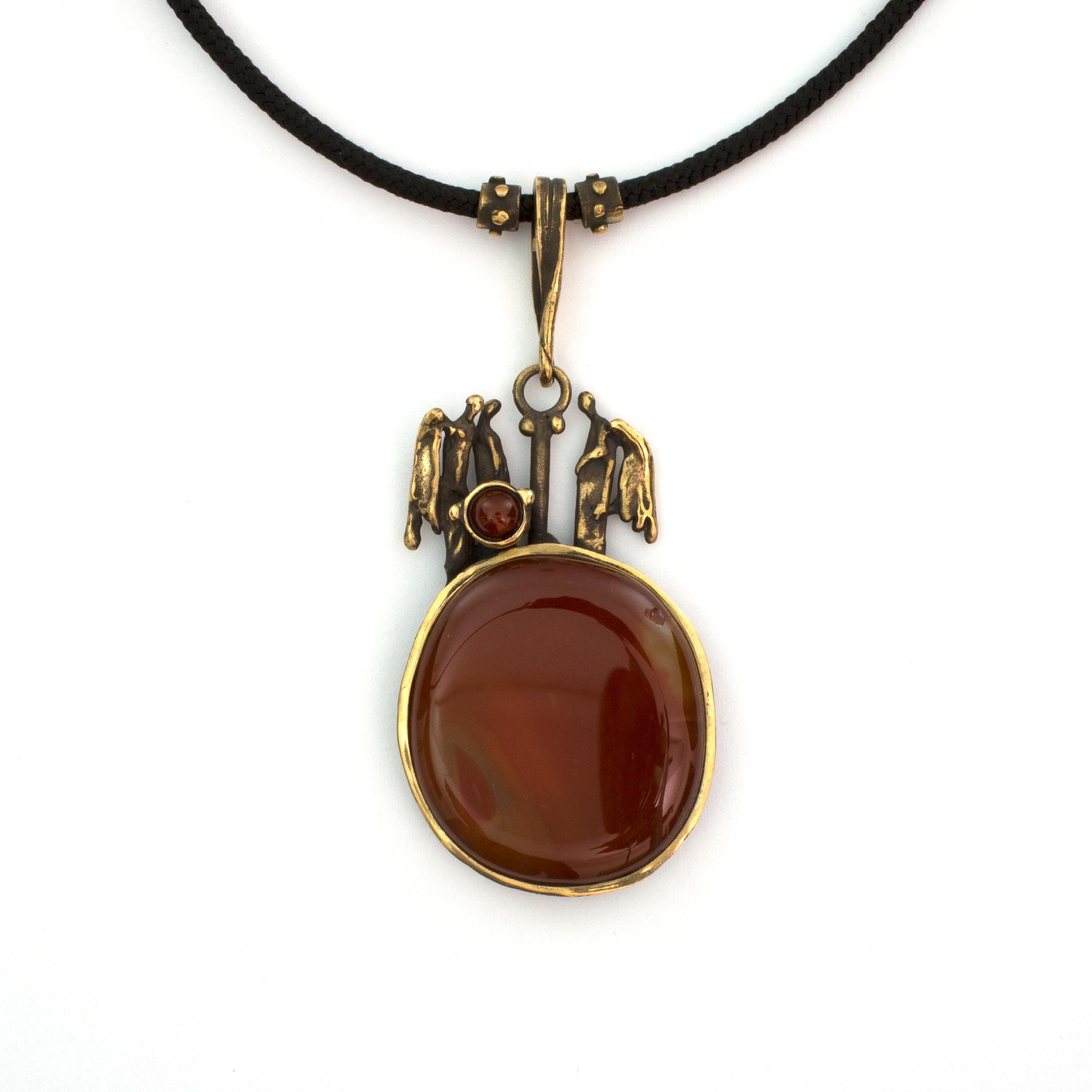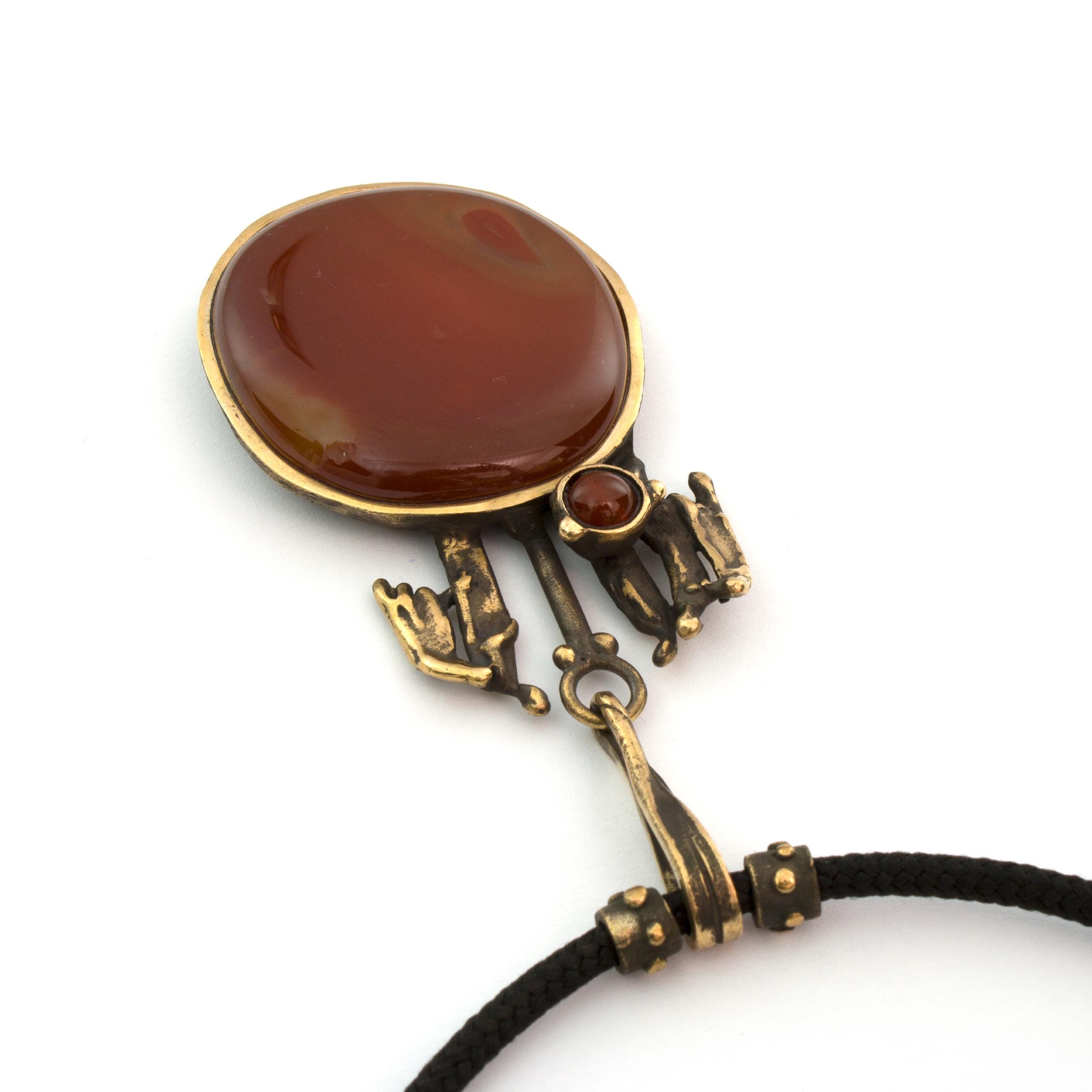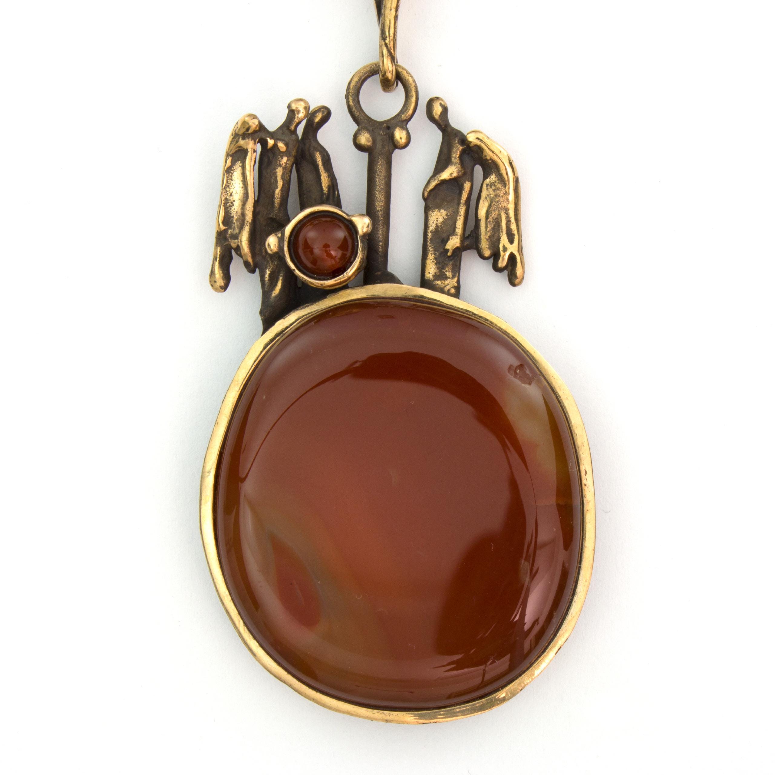 Náhrdelník "Tajemství" od Vojtěšky Vlčkové (1948-2023) je autorský šperk, který prostřednictvím sochařské formy vypráví příběh skrytých významů. Kombinace patinovaného bronzu s karneolem vytváří dílo, kde se hmotnost kovu setkává s hloubkou přírodního kamene. Tento jedinečný kus představuje dokonalé spojení řemeslné preciznosti a umělecké hloubky.