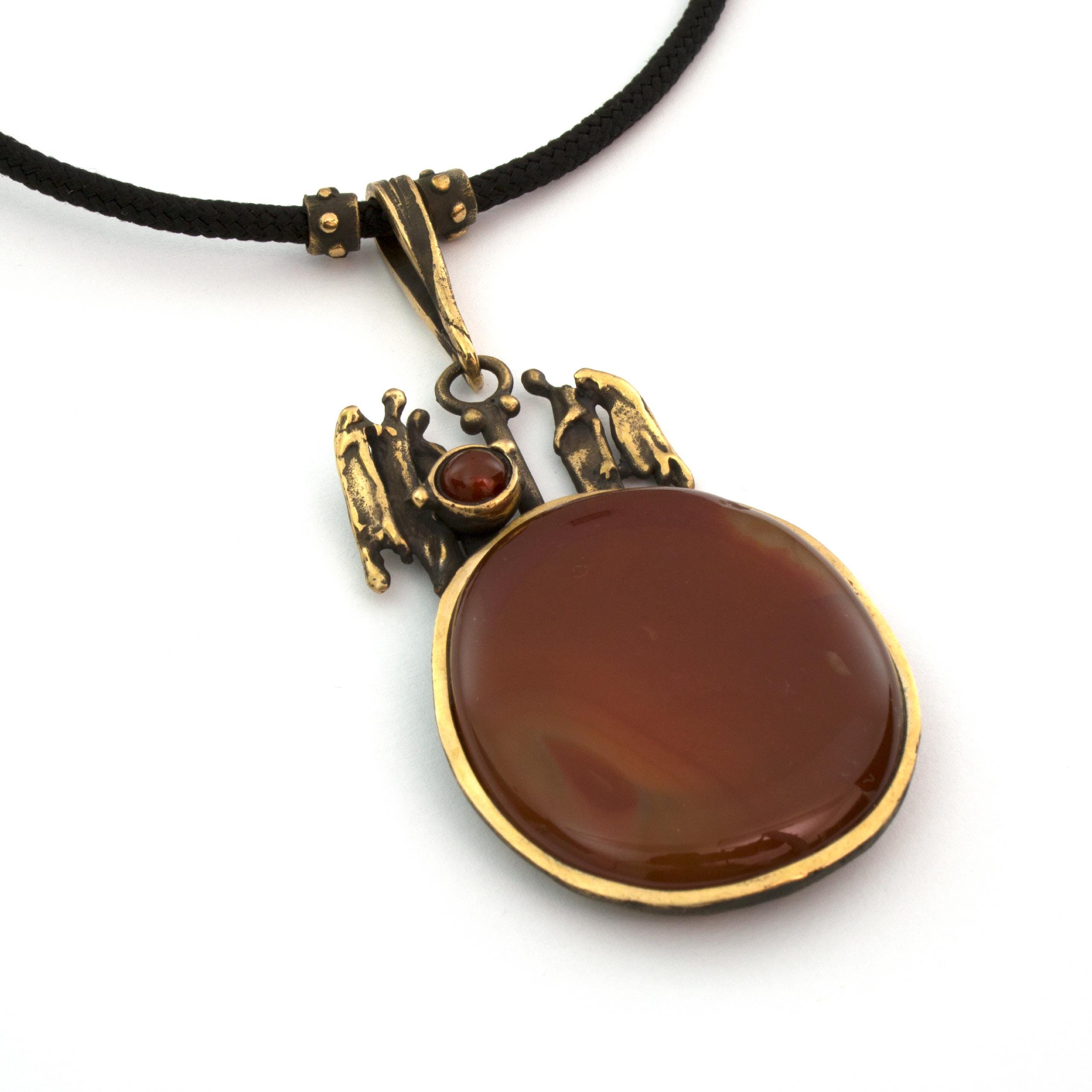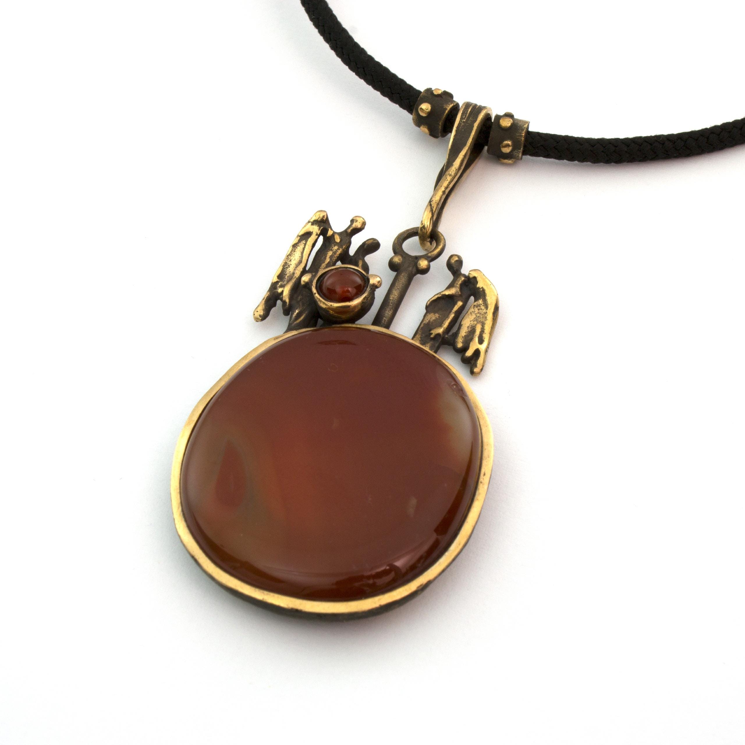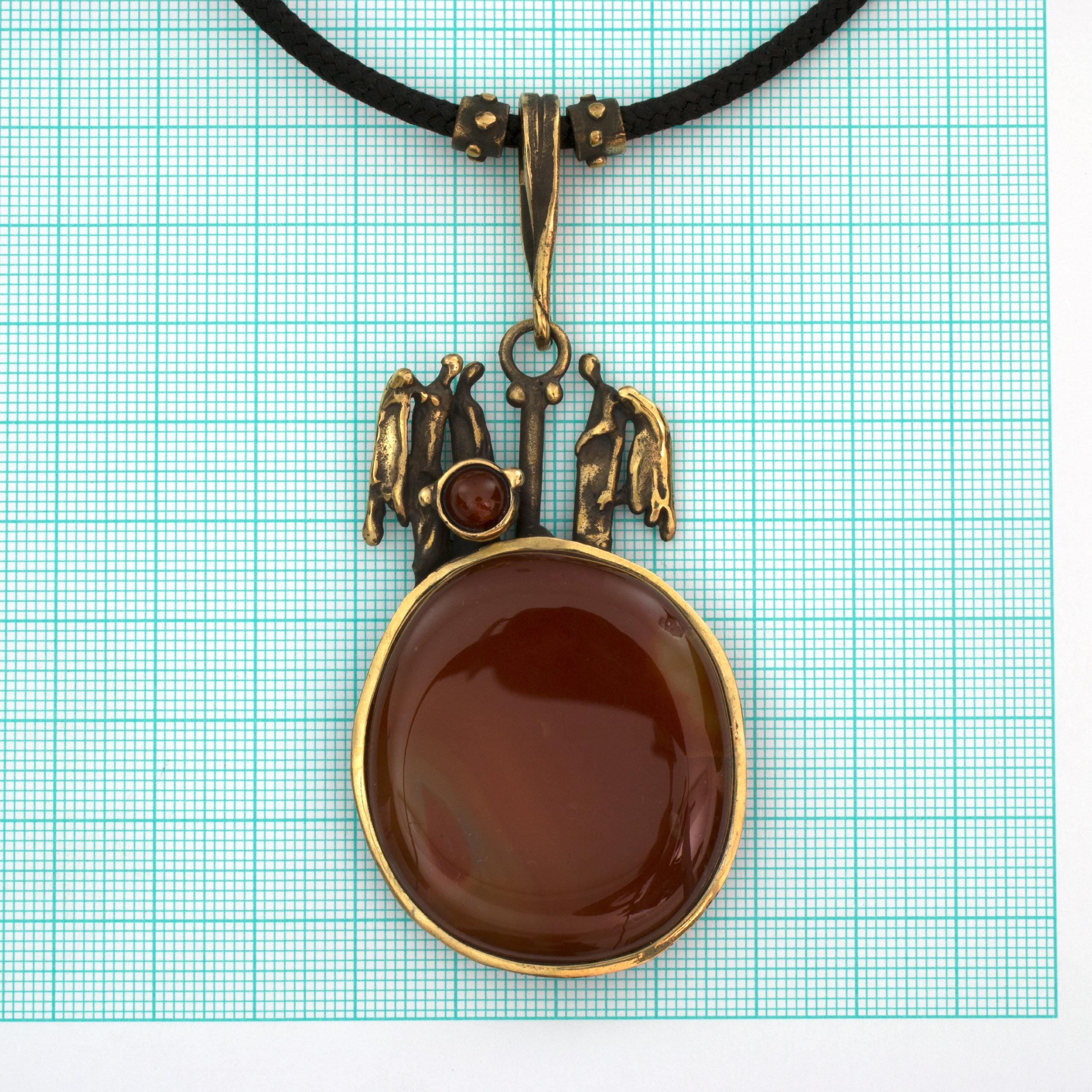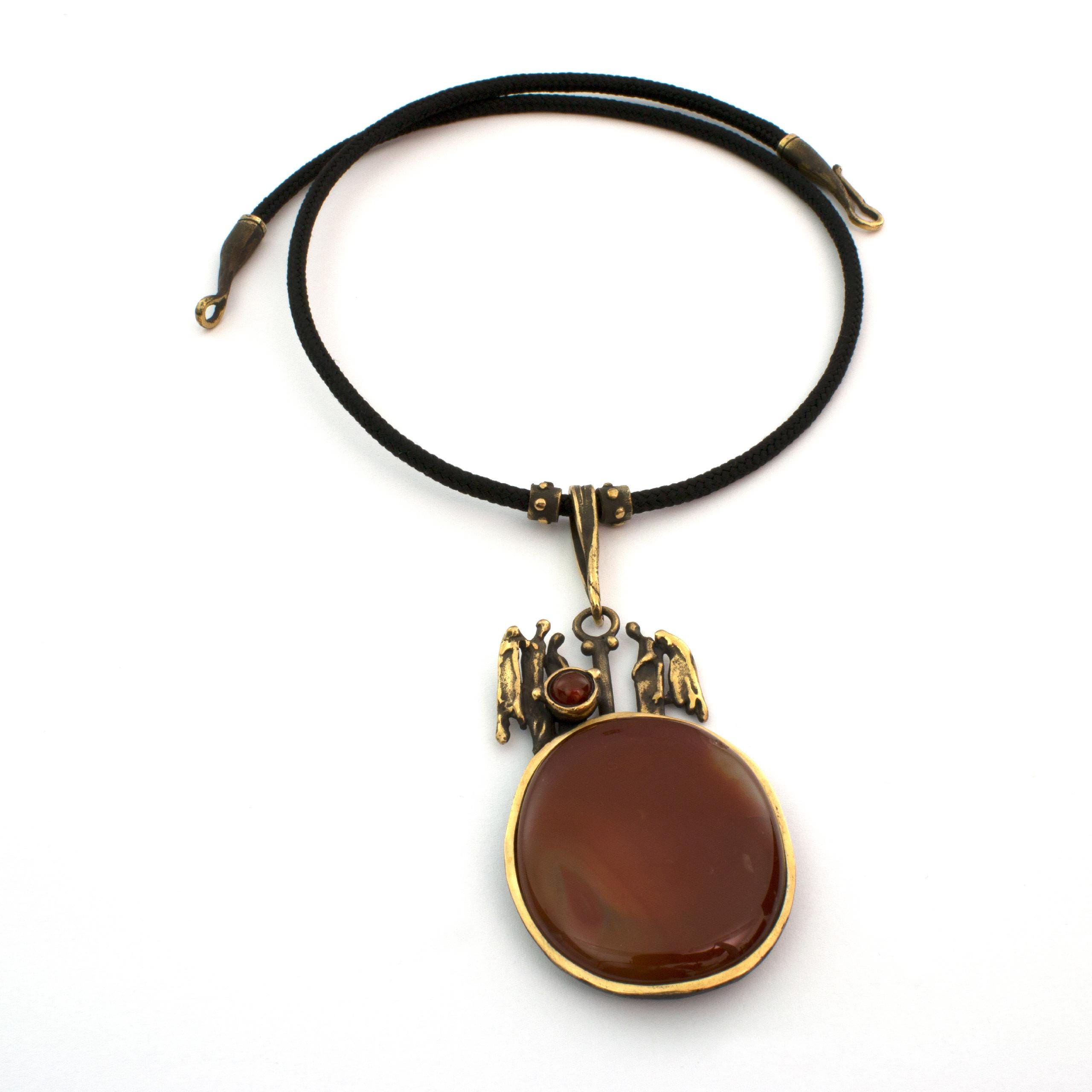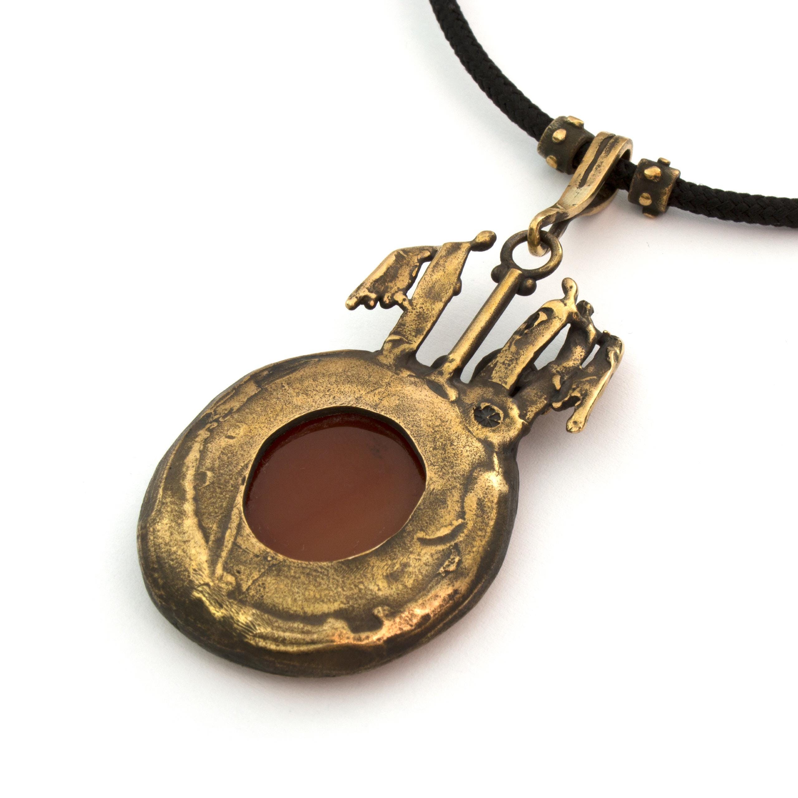 Náhrdelník "Tajemství" od Vojtěšky Vlčkové (1948-2023) je autorský šperk, který prostřednictvím sochařské formy vypráví příběh skrytých významů. Kombinace patinovaného bronzu s karneolem vytváří dílo, kde se hmotnost kovu setkává s hloubkou přírodního kamene. Tento jedinečný kus představuje dokonalé spojení řemeslné preciznosti a umělecké hloubky.
