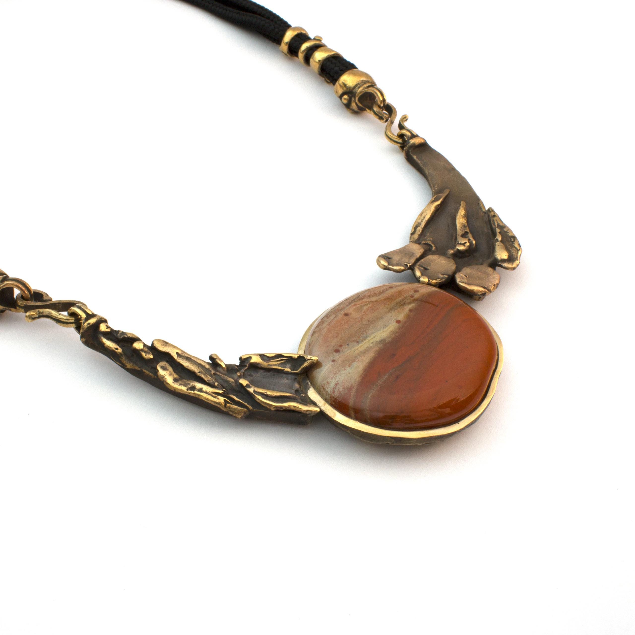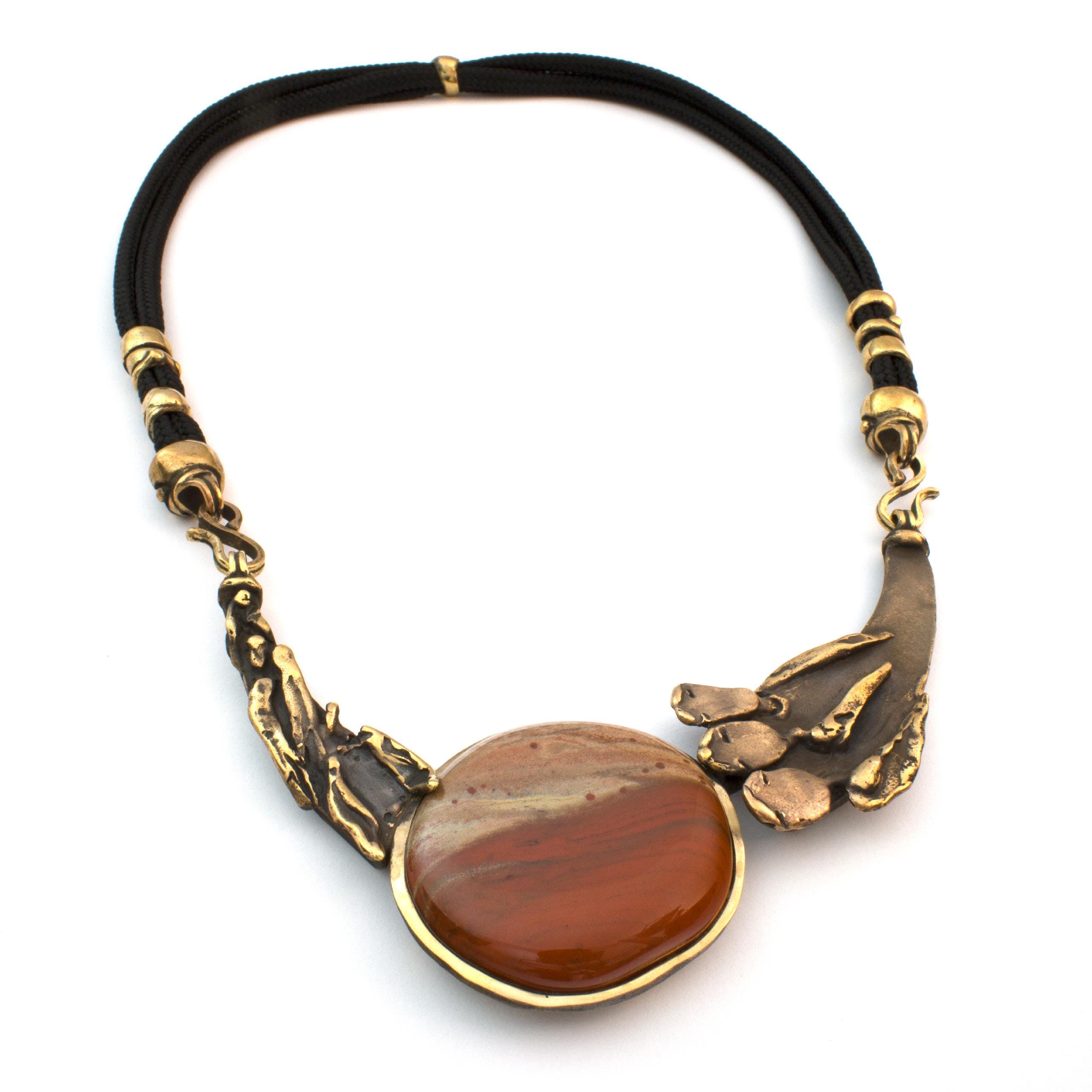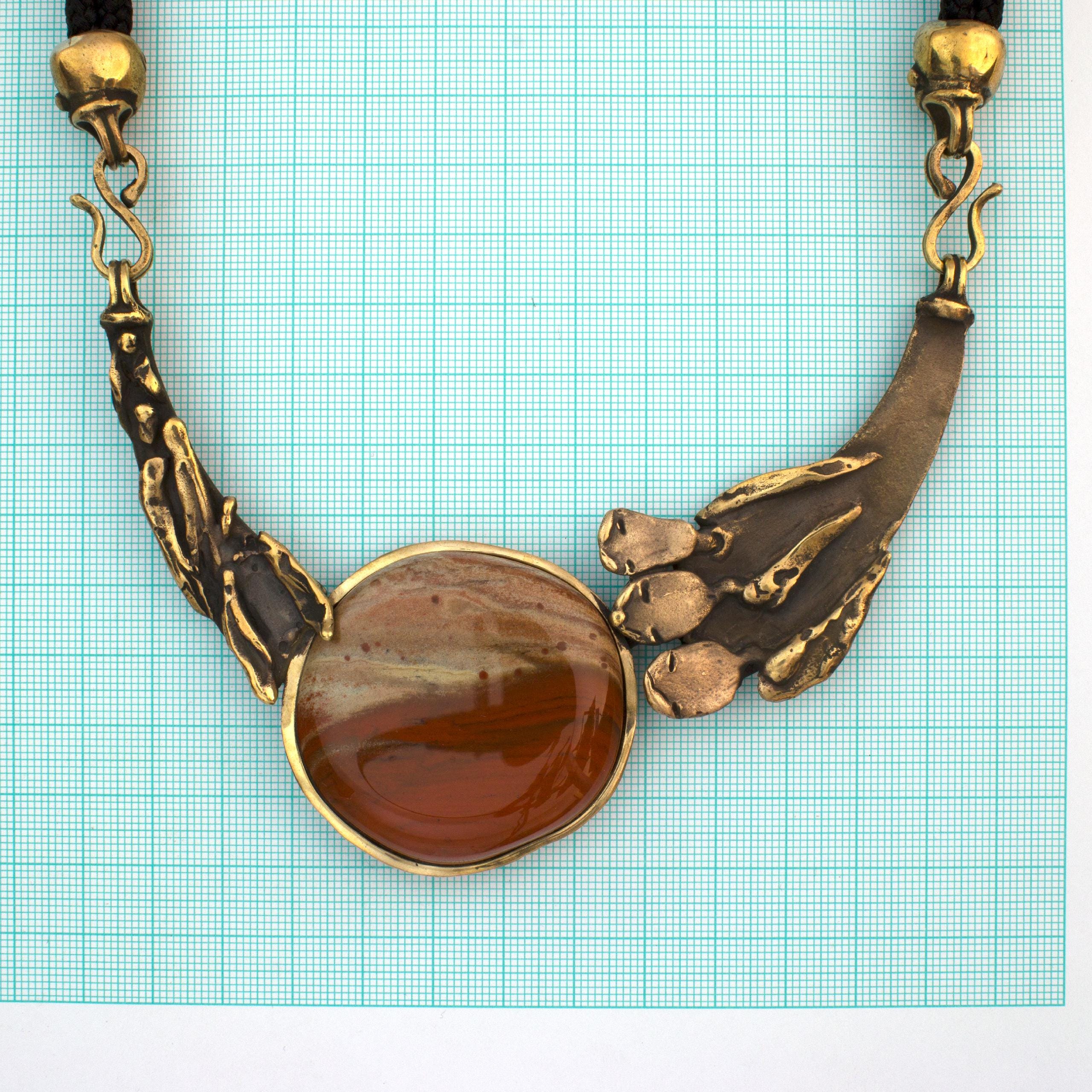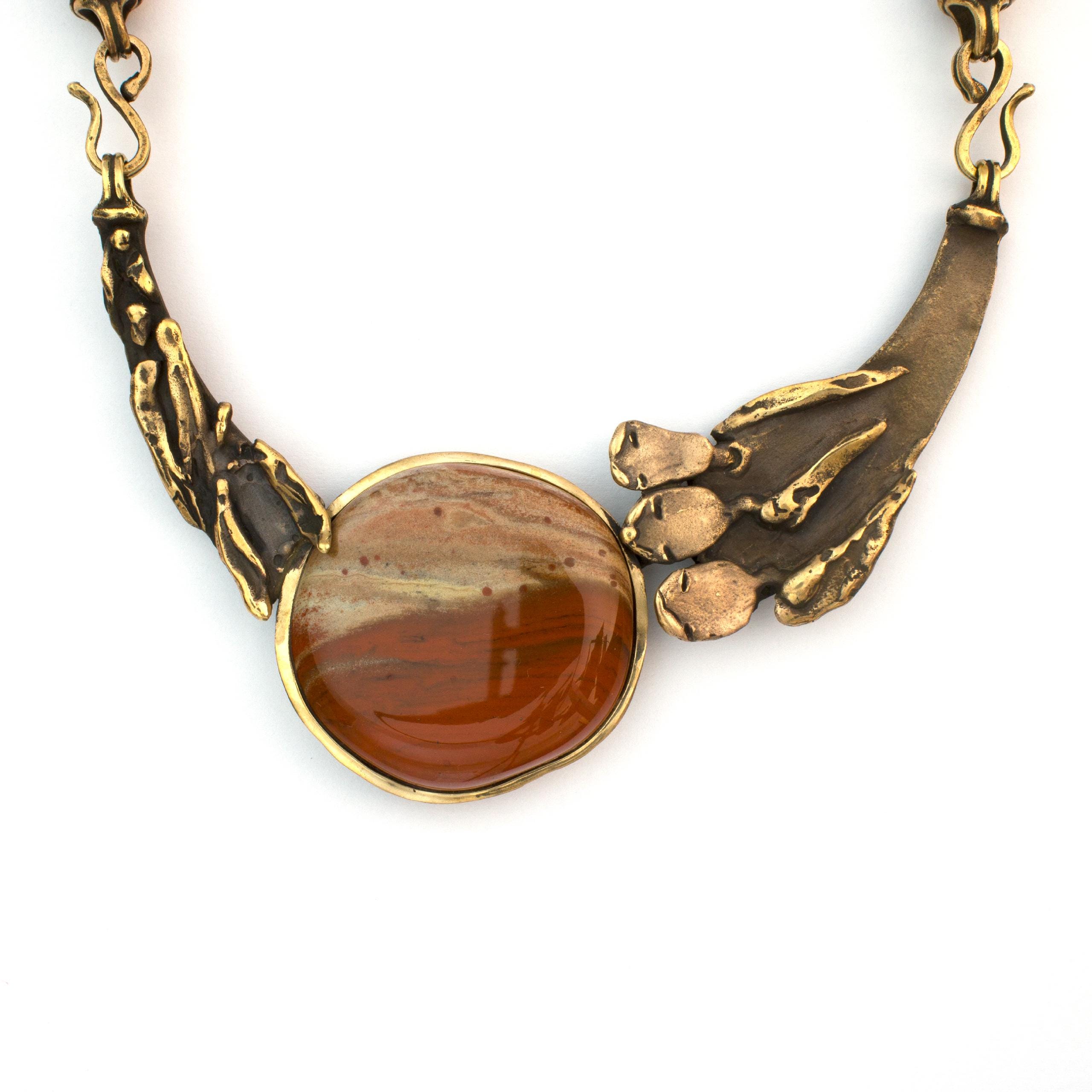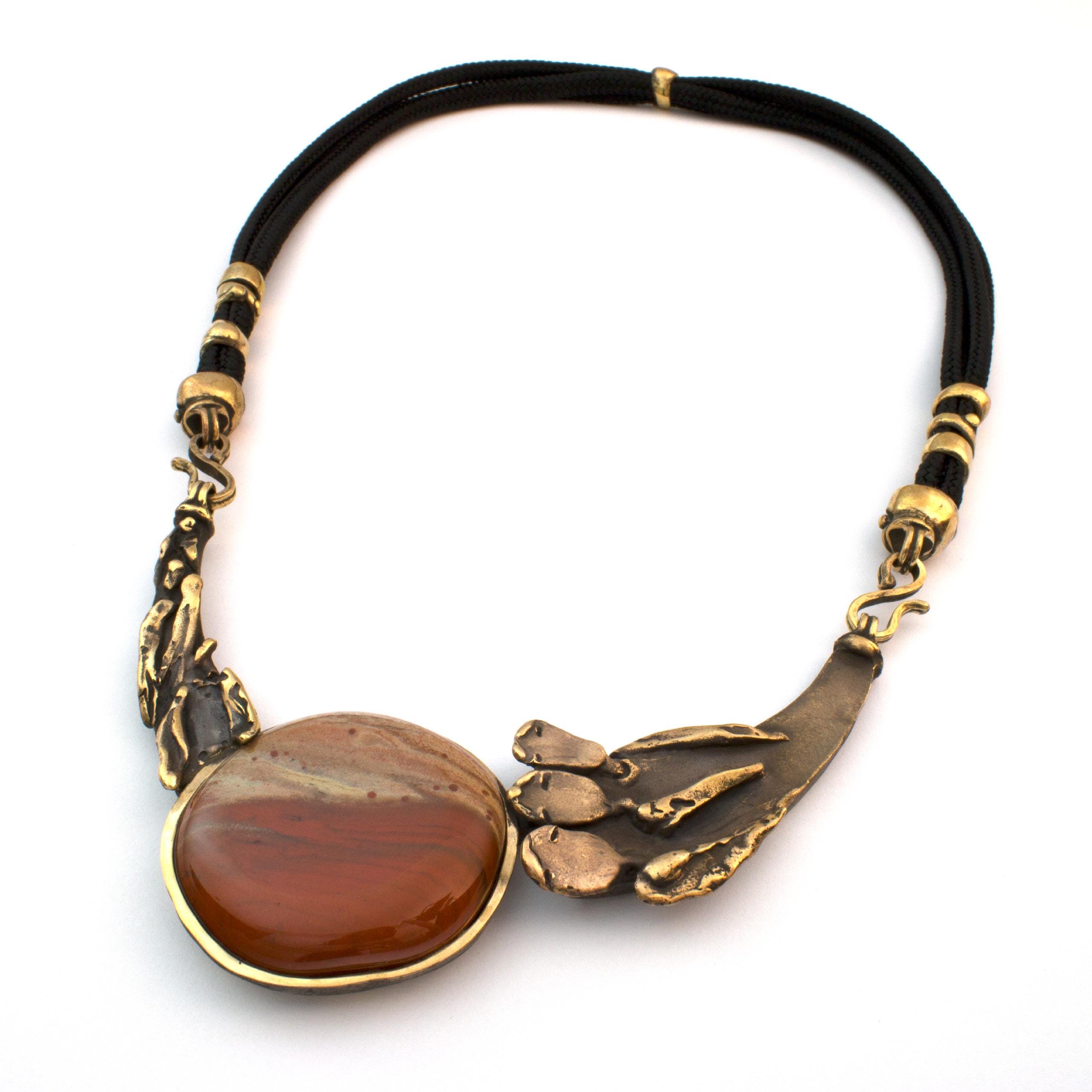 Náhrdelník "Andělé na tahu" od Vojtěšky Vlčkové (1948-2023) je monumentální šperk s výraznou vizuální přítomností. Tento rozměrný kus kombinuje patinovaný bronz s velkým kulatým červeným jaspisem, vytvářející působivý kontrast mezi kovem a kamenem. Dílo zhotovené technikou lití na ztracený vosk vyniká svou hmotností a výtvarnou silou, která z něj činí výjimečný příklad nositelného sochařství.