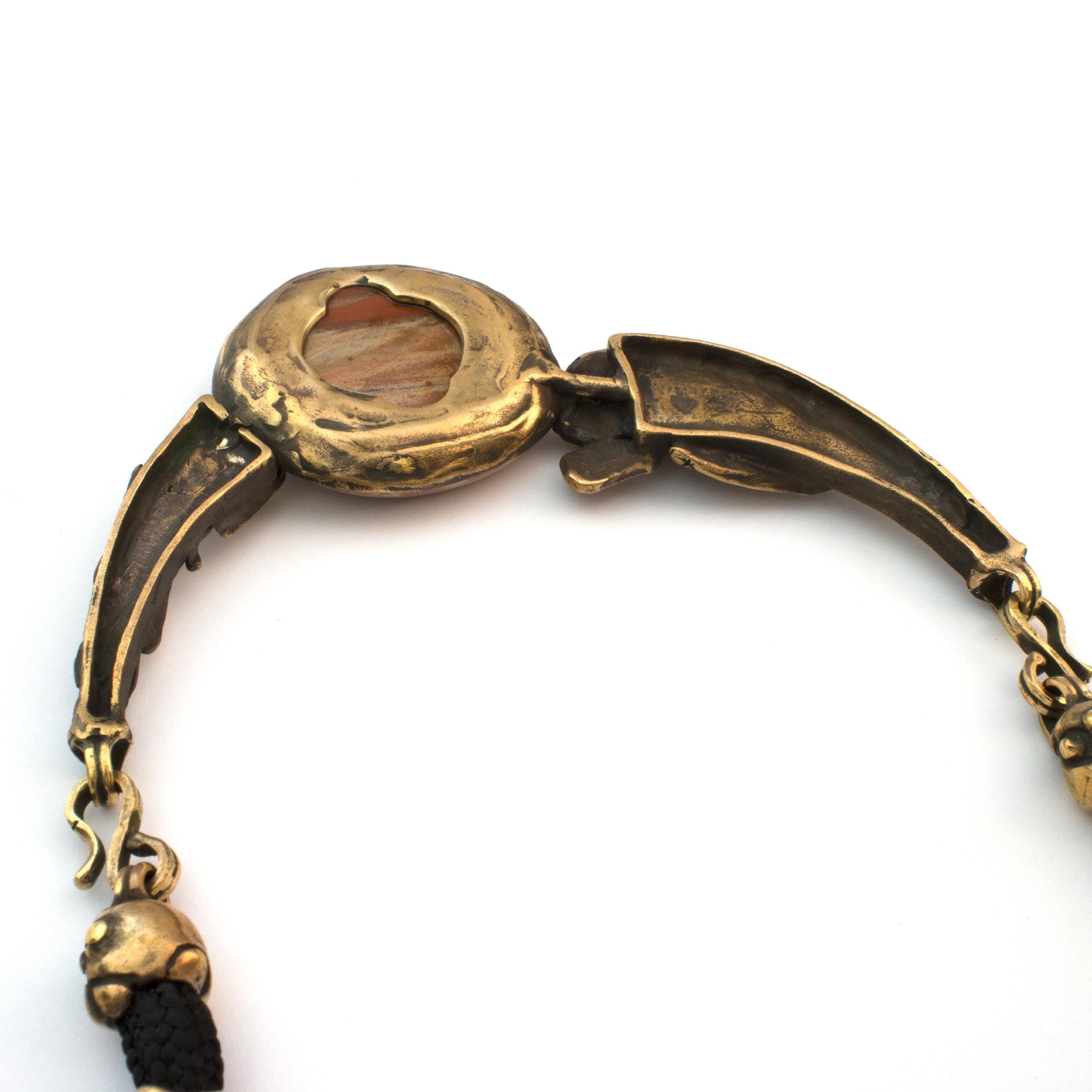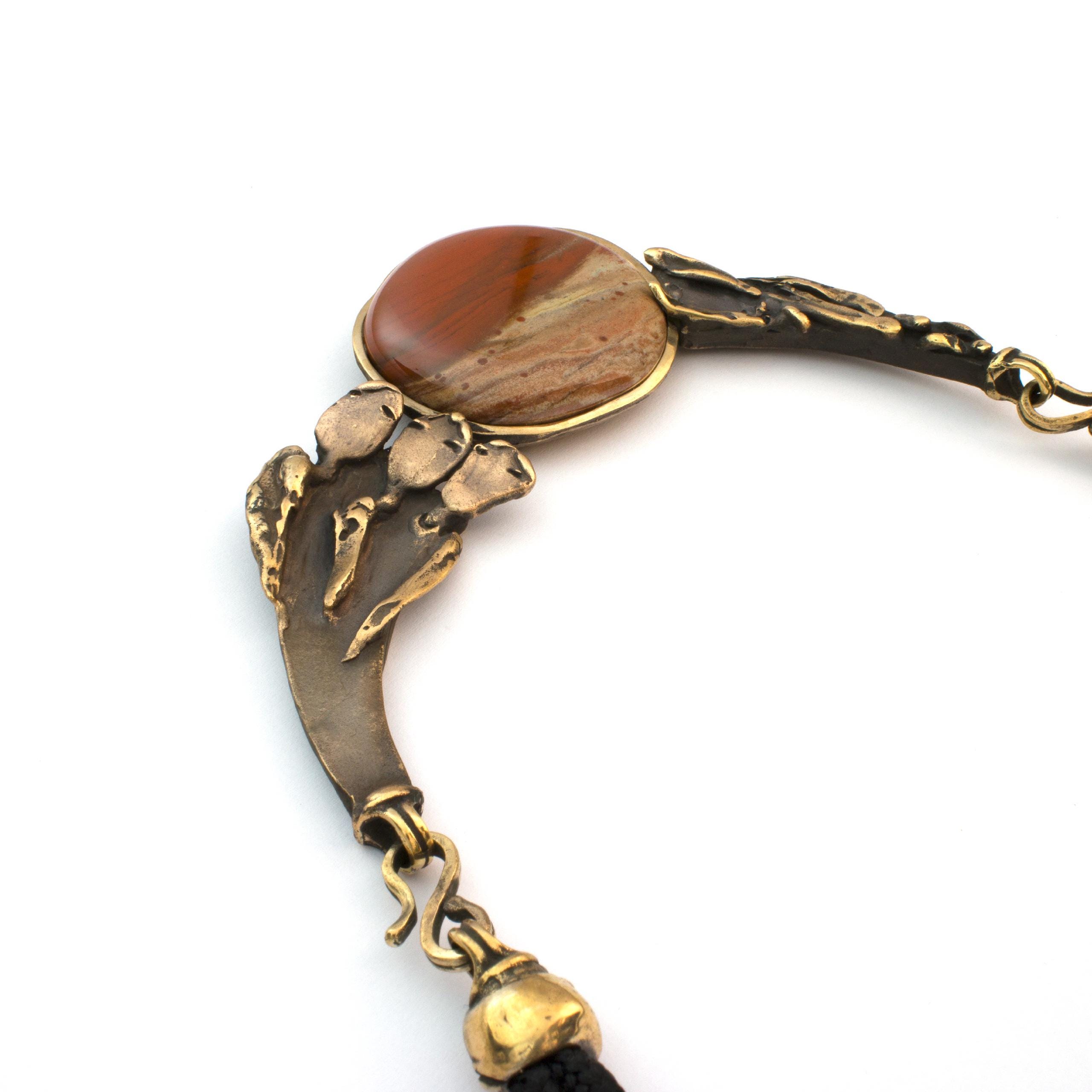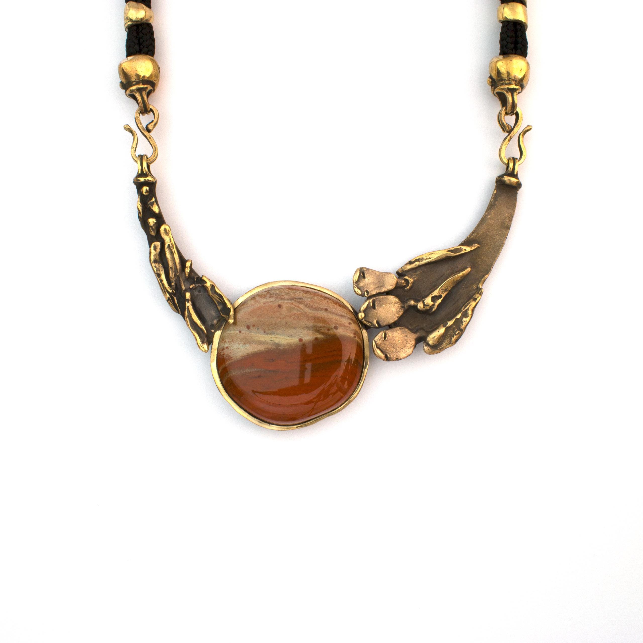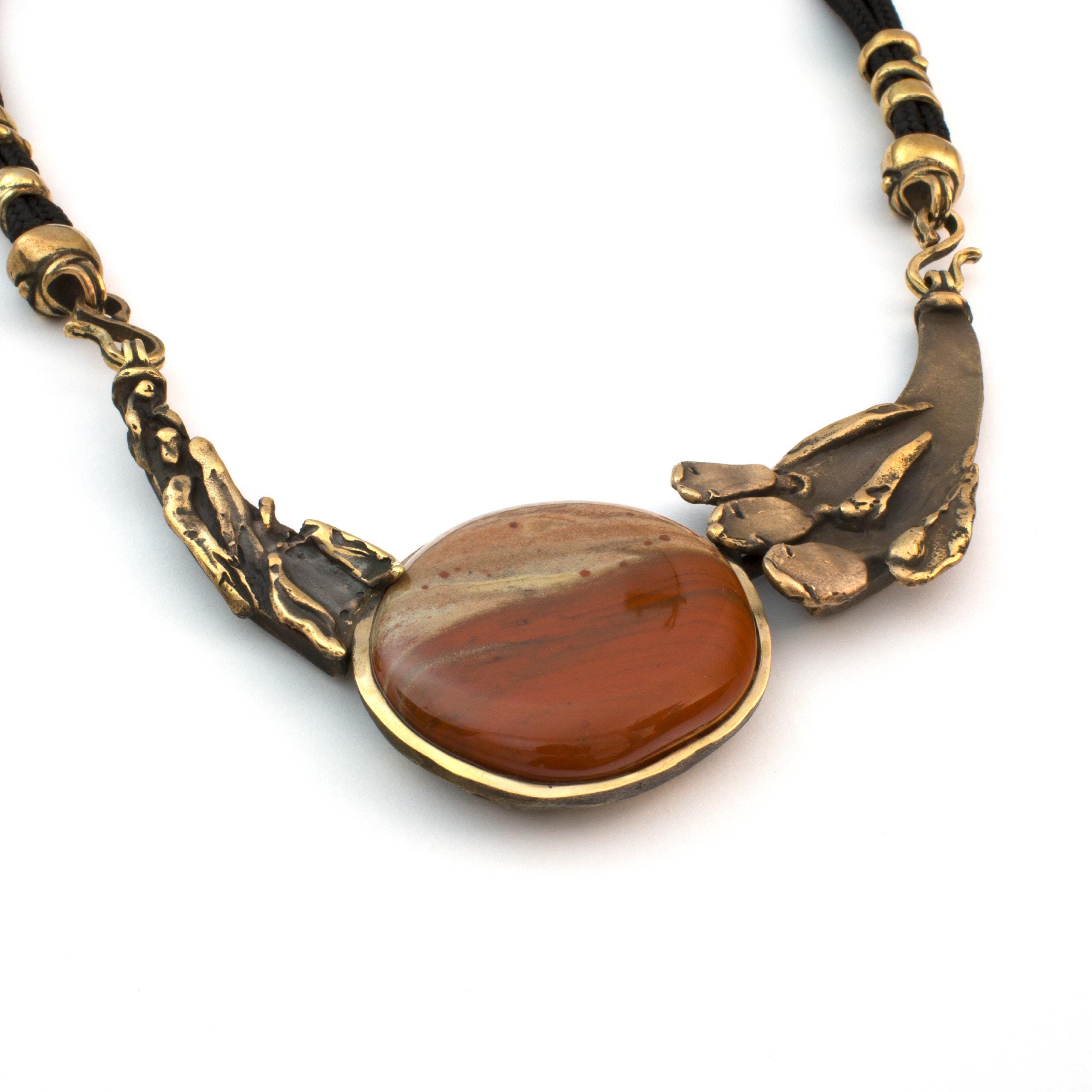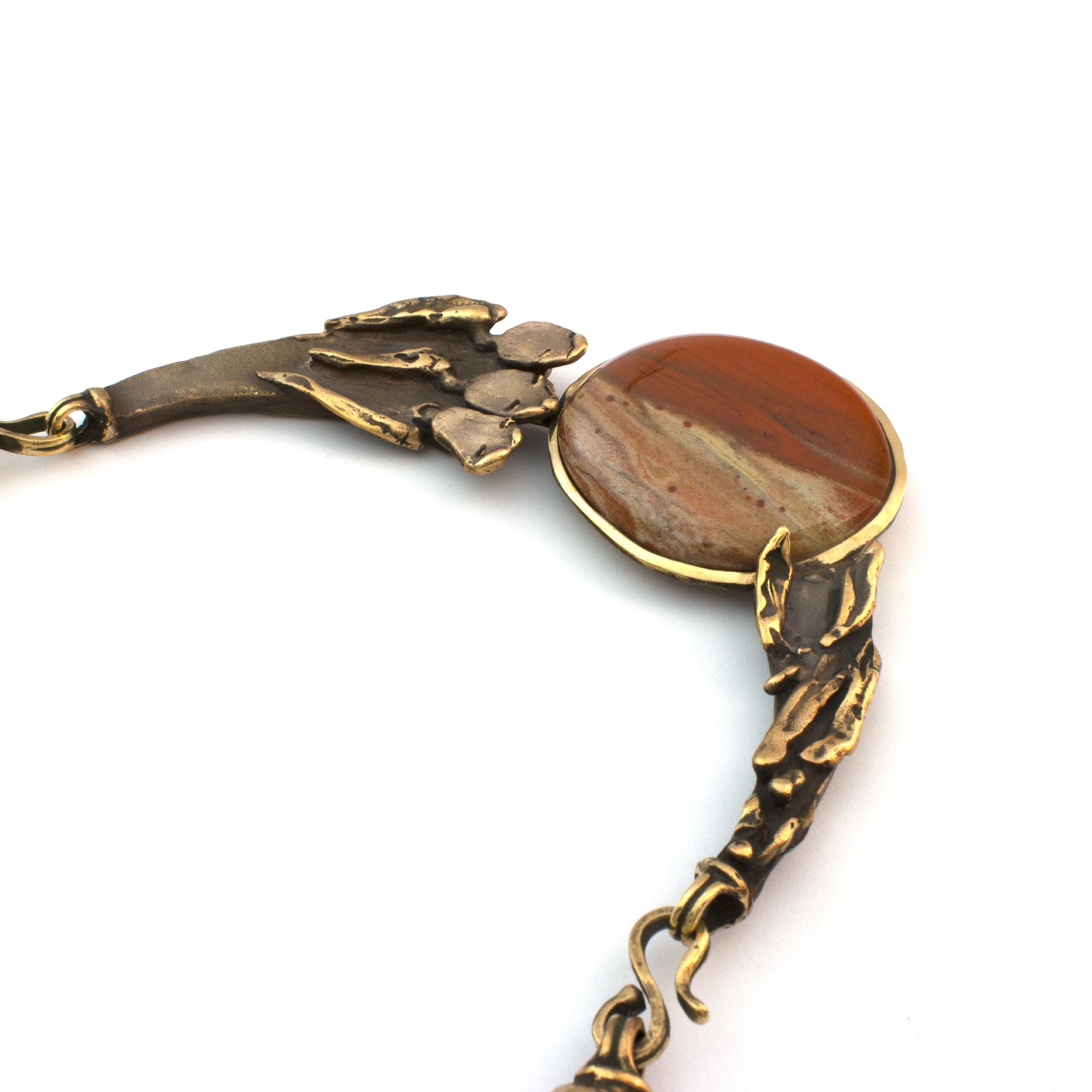 Náhrdelník "Andělé na tahu" od Vojtěšky Vlčkové (1948-2023) je monumentální šperk s výraznou vizuální přítomností. Tento rozměrný kus kombinuje patinovaný bronz s velkým kulatým červeným jaspisem, vytvářející působivý kontrast mezi kovem a kamenem. Dílo zhotovené technikou lití na ztracený vosk vyniká svou hmotností a výtvarnou silou, která z něj činí výjimečný příklad nositelného sochařství.